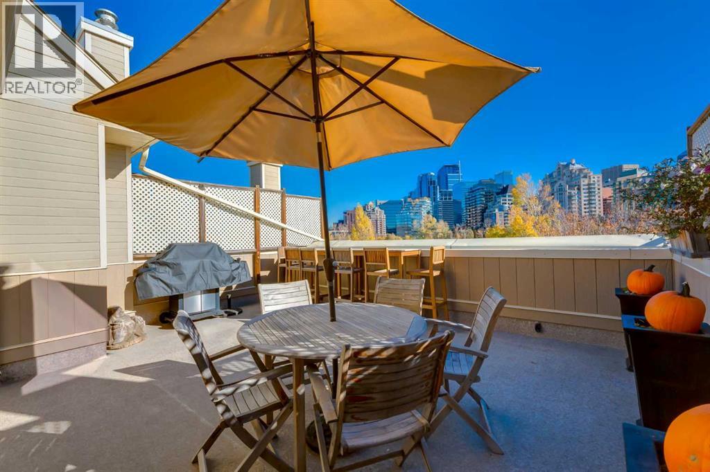 SUNNYSIDE townhome along the BOW RIVER with DOWNTOWN VIEWS. Located in a small enclave of 10 townhomes, this inner city home has had numerous updates over the past 10+ years. With 1948 square feet of living space over four levels, there are 2 bedrooms and 2.5 baths plus an exceptional top floor loft space with vaulted ceilings adjacent to an outstanding 20” x 16” roof top patio. The views of Calgary's city skyline are truly exceptional. The home has newer windows & doors, plus the decking surface has been replaced. The custom kitchen includes Makore cabinetry, large island and stainless appliances, including a Wolf gas stove. There is hardwood flooring on three levels, tile in the foyer and bathrooms, quartz countertops, chrome finish hardware, updated light fixtures, built-in entertainment cabinets in living area, air conditioning, and a two 2-sided gas fireplace with remote control. The lower level is developed, including a four piece bath. The Sierras Riverside in Sunnyside is a one of a kind condominium in a vibrant walkable and bikeable location with restaurants, retail, transit, and the Peace Bridge steps away. (id:55577)