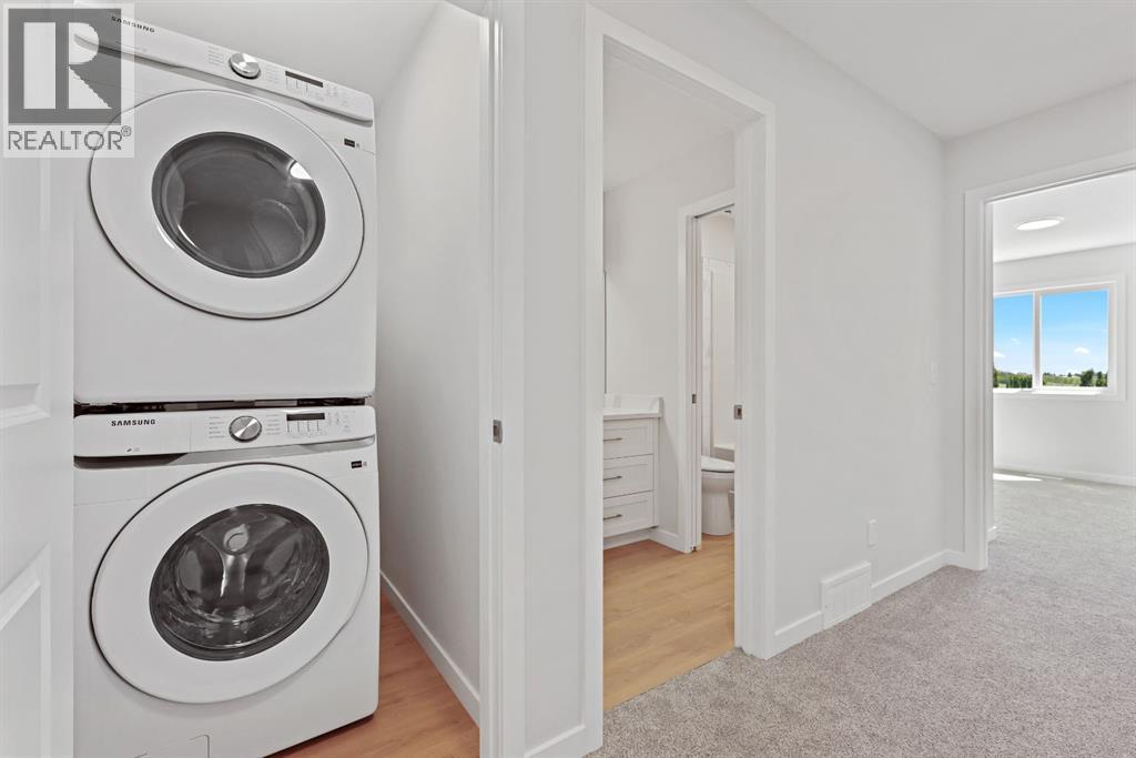Welcome to this stylish and affordable freehold townhouse with no condo fees, built by Jonboyz Construction, a reputable local builder in Didsbury. Located in the desirable community of Valarosa, this home offers nearly 1,300 sq ft of functional living space with thoughtful design and family-friendly features.The main level includes an attached garage, utility room, and direct access to the backyard — offering both practicality and convenience. Upstairs, the bright and spacious main floor boasts an open dining area, cozy living room, and a modern kitchen complete with white soft-close cabinets, white quartz countertops, a pantry, and vinyl plank flooring in a warm, neutral tone. This level also includes a 2-piece bathroom and access to your private rear deck — ideal for relaxing or entertaining.On the third floor, you’ll find two generously sized bedrooms, a 4-piece bathroom, and a convenient upstairs laundry room. The primary bedroom features dual closets, providing excellent storage space. Carpet flooring adds warmth and comfort to the bedrooms and hallway.This townhouse offers a spacious backyard, and front yard — a rare find. The builder will also be including a fully fenced backyard, providing privacy, security, and a safe space for children or pets. Located just steps from a scenic protected forest area with walking paths and local wildlife, and close to a playground and baseball diamond, this home is perfect for families looking for space and community.Don’t miss your chance to own this well-crafted home in a peaceful, family-oriented neighborhood. (id:55577)