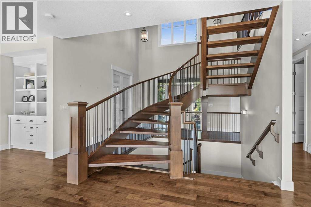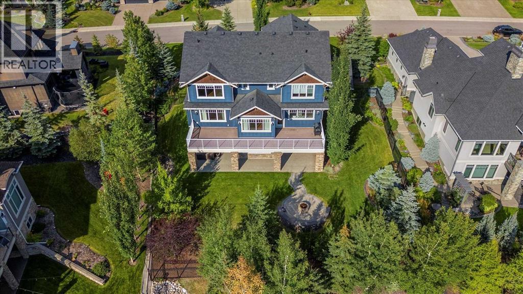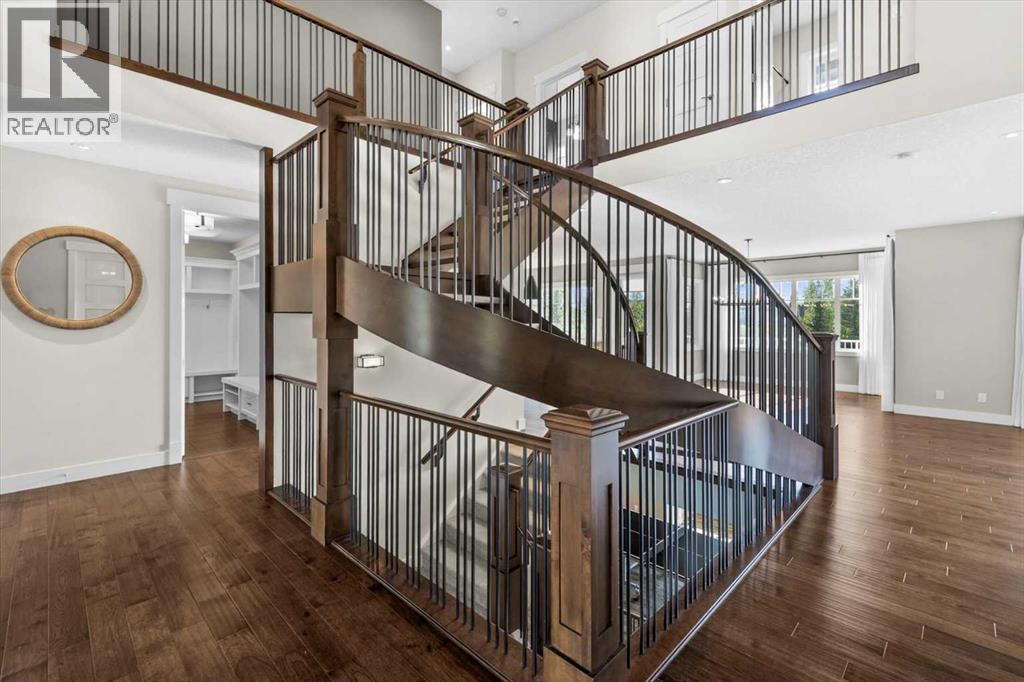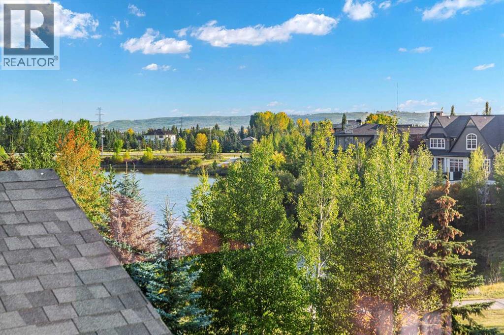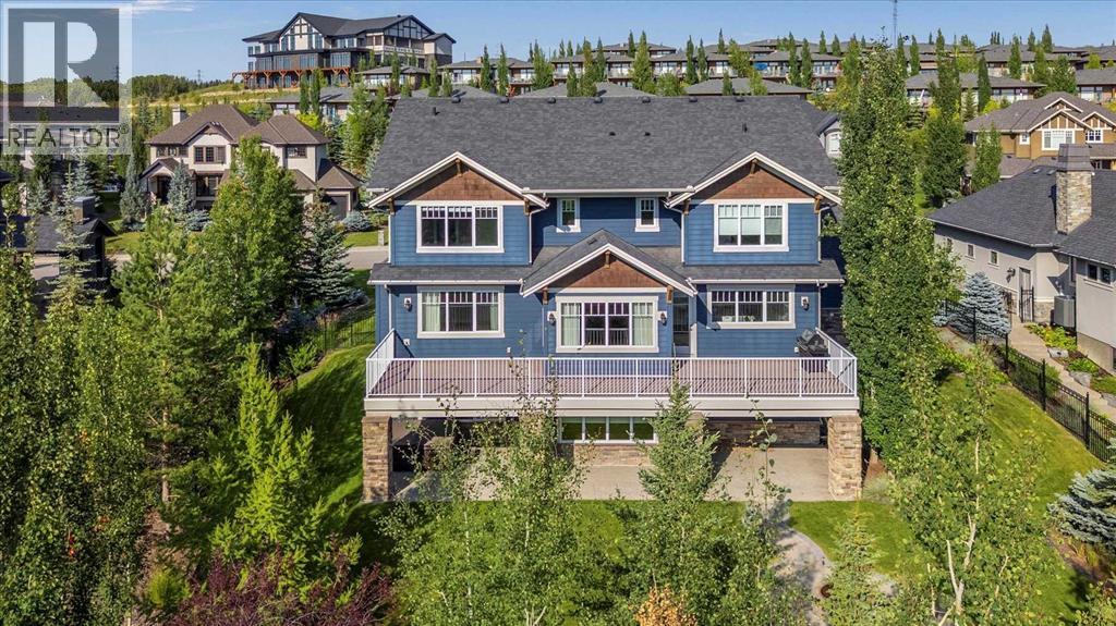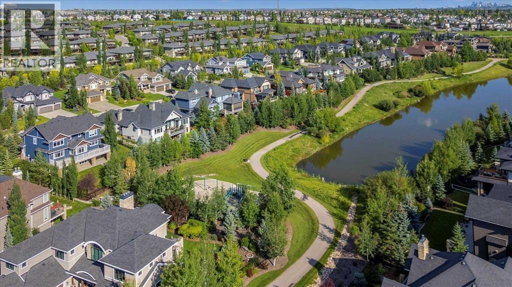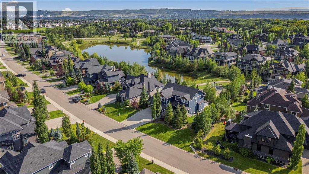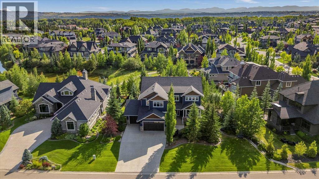 Set in one of Watermark's most coveted locations, a quiet cul-de-sac backing southwest onto green space with tranquil pond and stunning Rocky Mountain views, this custom built two-storey walkout by Wolf Custom Homes offers over 4500sqft of thoughtfully designed living space. Entering the home you are immediately captivated by the millwork on the artisanal curved wood staircase, the natural light streaming throughout the home and the serenity of the stunning views. The main floor is ideal for family connection and entertaining featuring an expansive great room with focal gas fireplace and custom cabinetry, a spacious dining area, and a chef-inspired kitchen with Calcutta Marble quartz countertops, premium JennAir appliances, and walk-through butler’s pantry with exceptional storage. An expansive southwest deck off the kitchen and dining area is perfect for weekend BBQ’s, outdoor dining or simply relaxing in the sunshine. Working from home is easy with the private office with double french doors on the main floor, while the large mudroom with custom built-ins keeps family life organized. On the upper level hardwood floors lead to four generous bedrooms and three full bathrooms, including a luxurious primary suite with vaulted ceilings, spectacular mountain views, a walk-in dressing room with custom cabinetry, and a spa-inspired ensuite featuring heated floors, dual vanities, a deep soaker tub, and a 10mm glass shower with dual rain heads. Two of the upper bedrooms share a Jack & Jill bathroom, and the fourth has its own private bath—ideal for teens or guests. A large laundry room on the upper level adds everyday convenience. The walkout lower level features in-slab heating and is perfect for movie nights or entertaining with the spacious family room and wet bar. Additionally on the lower level is a fifth bedroom that can double as a gym or second home office, a full bathroom, and plentiful storage. The private backyard continues the theme of exceptional living wi th professional landscaping, mature trees, fire pit conversation area, discreetly positioned hot tub, irrigation system and an abundance of space to play and entertain. Not to be missed is the finished oversized triple garage with polyaspartic flooring, slat walls, extensive built-in storage and EV charger. Recent updates to the home include servicing of furnaces, hot water tank, and A/C units; new light fixtures above island and in dining area, new wine fridge and icemaker in wet bar, hot tub, polyaspartic flooring and shelves in garage, mirrored wall in 5th bedroom, re-tiled shower base in ensuite, and addition of children’s play space under the stairs. Awarded Canada’s Community of the Year multiple times, Watermark features over 5km of paved trails, a network of cascading ponds and streams, community playgrounds and a Central Plaza. Exceptional access to several golf courses, the Rocky Mountains, Stoney Trail and downtown Calgary. (id:55577)