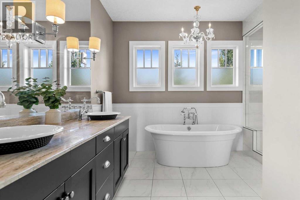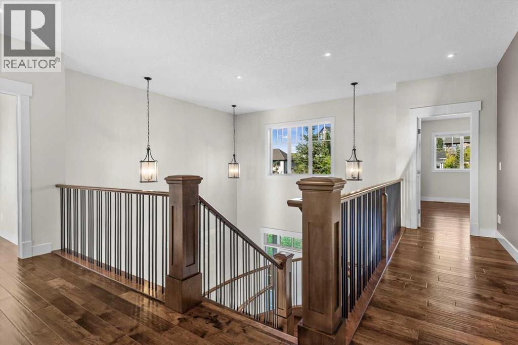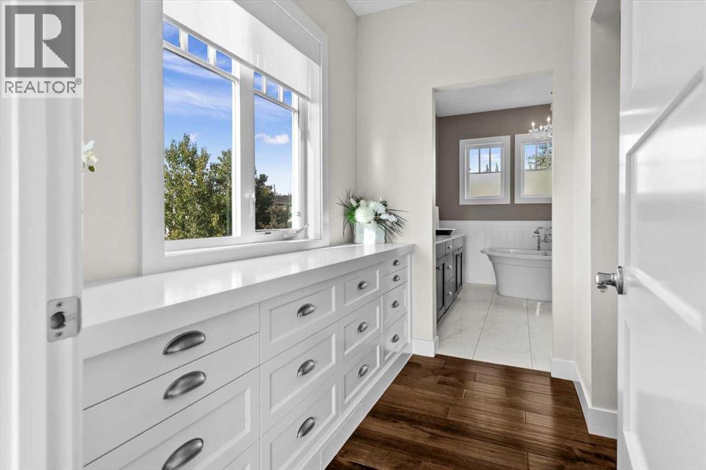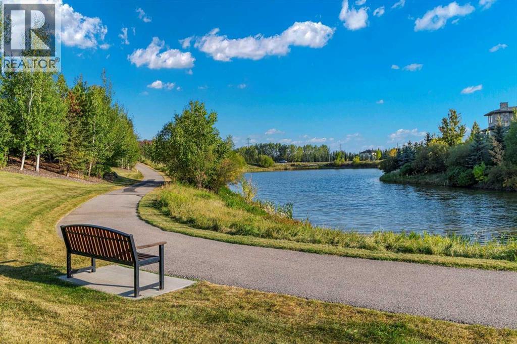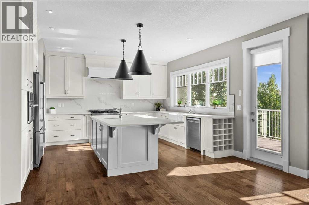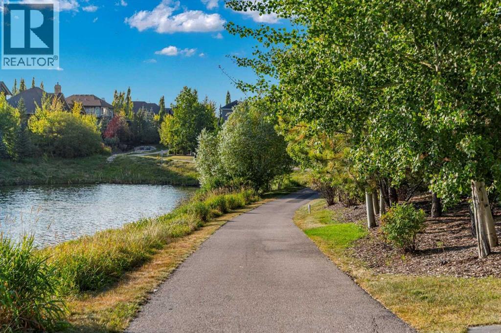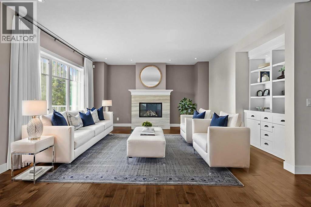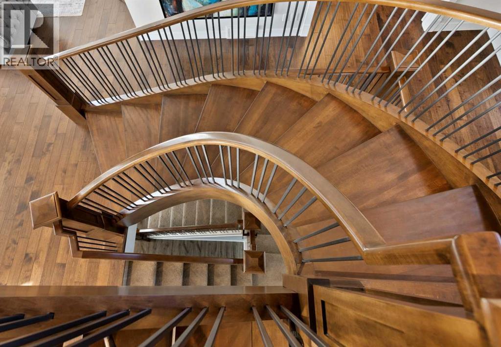 Set in one of Watermark's most coveted locations, a quiet cul-de-sac backing southwest onto green space with tranquil pond and stunning Rocky Mountain views, this custom built two-storey walkout by Wolf Custom Homes offers over 4500sqft of thoughtfully designed living space. Entering the home you are immediately captivated by the millwork on the artisanal curved wood staircase, the natural light streaming throughout the home and the serenity of the stunning views. The main floor is ideal for family connection and entertaining featuring an expansive great room with focal gas fireplace and custom cabinetry, a spacious dining area, and a chef-inspired kitchen with Calcutta Marble quartz countertops, premium JennAir appliances, and walk-through butler’s pantry with exceptional storage. An expansive southwest deck off the kitchen and dining area is perfect for weekend BBQ’s, outdoor dining or simply relaxing in the sunshine. Working from home is easy with the private office with double french doors on the main floor, while the large mudroom with custom built-ins keeps family life organized. On the upper level hardwood floors lead to four generous bedrooms and three full bathrooms, including a luxurious primary suite with vaulted ceilings, spectacular mountain views, a walk-in dressing room with custom cabinetry, and a spa-inspired ensuite featuring heated floors, dual vanities, a deep soaker tub, and a 10mm glass shower with dual rain heads. Two of the upper bedrooms share a Jack & Jill bathroom, and the fourth has its own private bath—ideal for teens or guests. A large laundry room on the upper level adds everyday convenience. The walkout lower level features in-slab heating and is perfect for movie nights or entertaining with the spacious family room and wet bar. Additionally on the lower level is a fifth bedroom that can double as a gym or second home office, a full bathroom, and plentiful storage. The private backyard continues the theme of exceptional living wi th professional landscaping, mature trees, fire pit conversation area, discreetly positioned hot tub, irrigation system and an abundance of space to play and entertain. Not to be missed is the finished oversized triple garage with polyaspartic flooring, slat walls, extensive built-in storage and EV charger. Recent updates to the home include servicing of furnaces, hot water tank, and A/C units; new light fixtures above island and in dining area, new wine fridge and icemaker in wet bar, hot tub, polyaspartic flooring and shelves in garage, mirrored wall in 5th bedroom, re-tiled shower base in ensuite, and addition of children’s play space under the stairs. Awarded Canada’s Community of the Year multiple times, Watermark features over 5km of paved trails, a network of cascading ponds and streams, community playgrounds and a Central Plaza. Exceptional access to several golf courses, the Rocky Mountains, Stoney Trail and downtown Calgary. (id:55577)