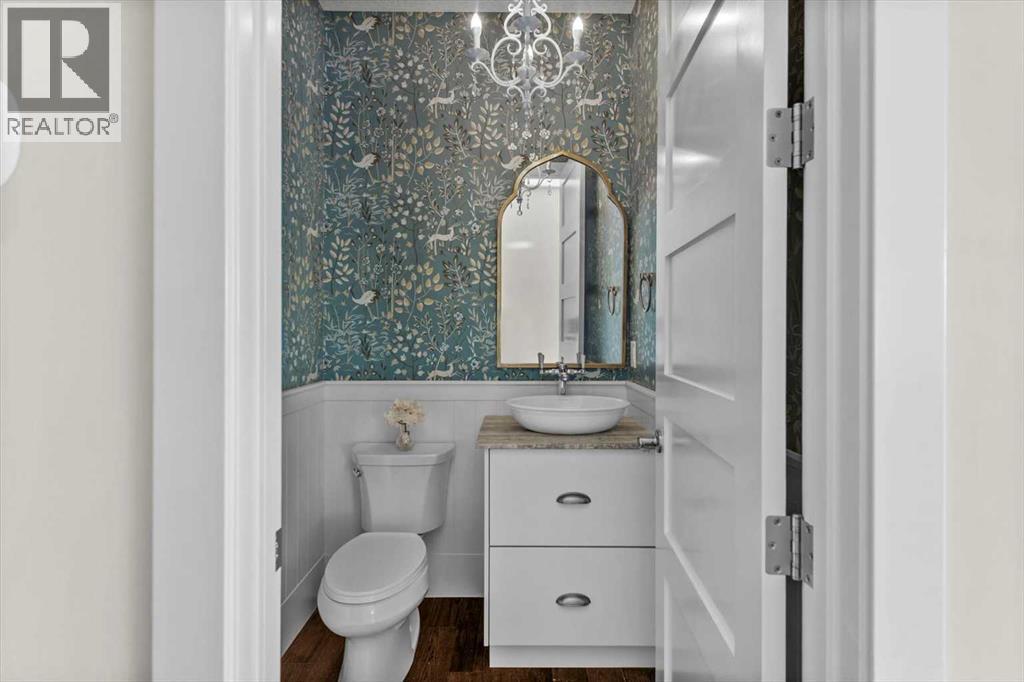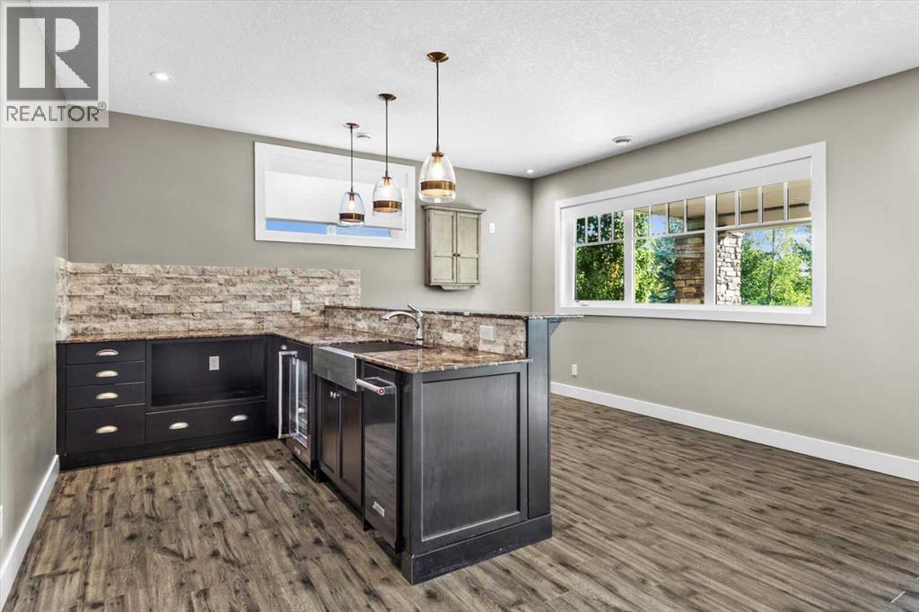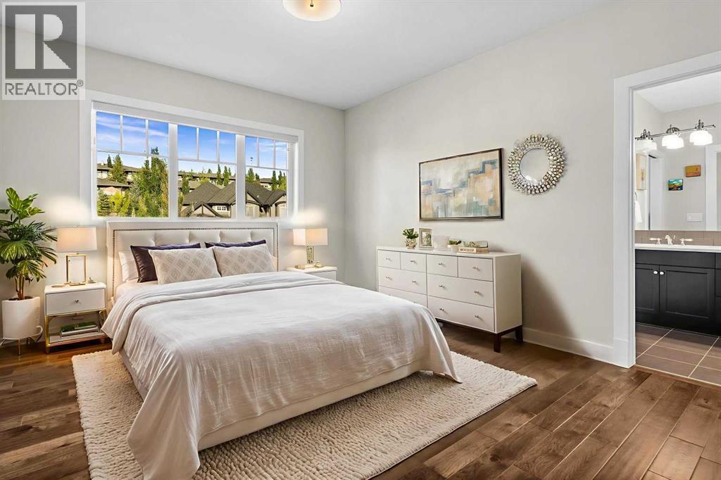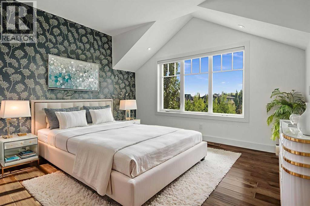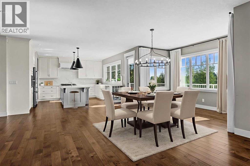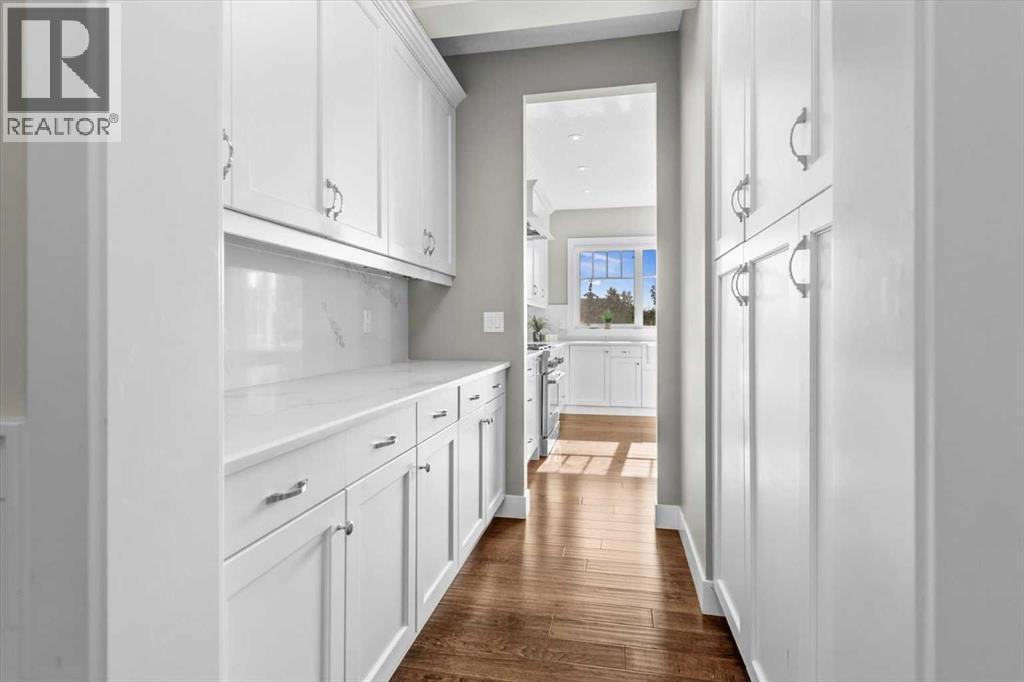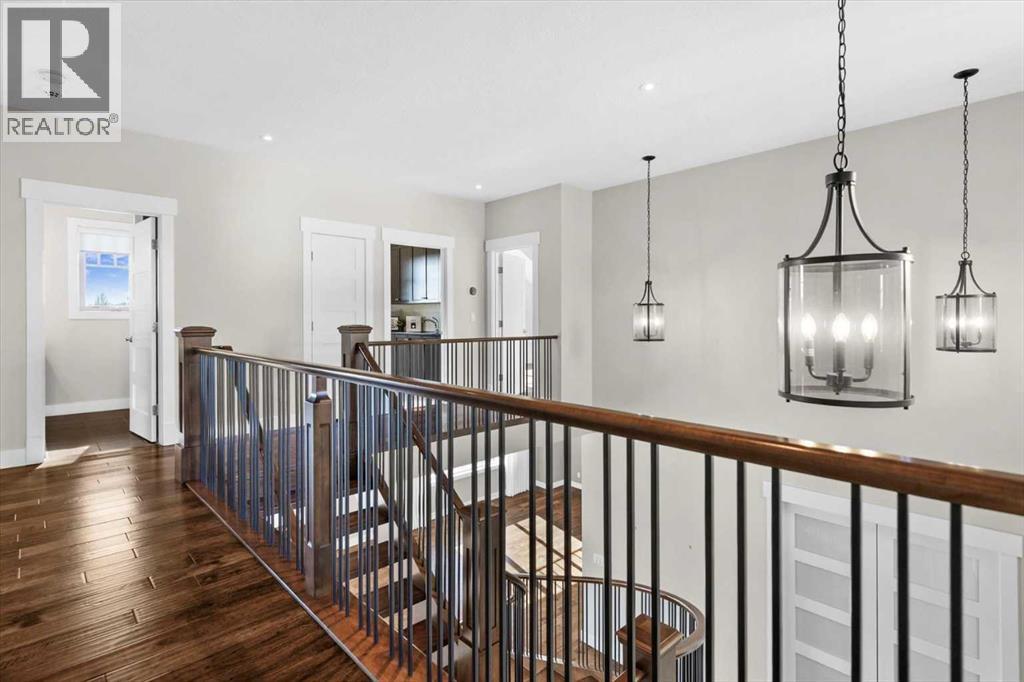 Set in one of Watermark's most coveted locations, a quiet cul-de-sac backing southwest onto green space with tranquil pond and stunning Rocky Mountain views, this custom built two-storey walkout by Wolf Custom Homes offers over 4500sqft of thoughtfully designed living space. Entering the home you are immediately captivated by the millwork on the artisanal curved wood staircase, the natural light streaming throughout the home and the serenity of the stunning views. The main floor is ideal for family connection and entertaining featuring an expansive great room with focal gas fireplace and custom cabinetry, a spacious dining area, and a chef-inspired kitchen with Calcutta Marble quartz countertops, premium JennAir appliances, and walk-through butler’s pantry with exceptional storage. An expansive southwest deck off the kitchen and dining area is perfect for weekend BBQ’s, outdoor dining or simply relaxing in the sunshine. Working from home is easy with the private office with double french doors on the main floor, while the large mudroom with custom built-ins keeps family life organized. On the upper level hardwood floors lead to four generous bedrooms and three full bathrooms, including a luxurious primary suite with vaulted ceilings, spectacular mountain views, a walk-in dressing room with custom cabinetry, and a spa-inspired ensuite featuring heated floors, dual vanities, a deep soaker tub, and a 10mm glass shower with dual rain heads. Two of the upper bedrooms share a Jack & Jill bathroom, and the fourth has its own private bath—ideal for teens or guests. A large laundry room on the upper level adds everyday convenience. The walkout lower level features in-slab heating and is perfect for movie nights or entertaining with the spacious family room and wet bar. Additionally on the lower level is a fifth bedroom that can double as a gym or second home office, a full bathroom, and plentiful storage. The private backyard continues the theme of exceptional living wi th professional landscaping, mature trees, fire pit conversation area, discreetly positioned hot tub, irrigation system and an abundance of space to play and entertain. Not to be missed is the finished oversized triple garage with polyaspartic flooring, slat walls, extensive built-in storage and EV charger. Recent updates to the home include servicing of furnaces, hot water tank, and A/C units; new light fixtures above island and in dining area, new wine fridge and icemaker in wet bar, hot tub, polyaspartic flooring and shelves in garage, mirrored wall in 5th bedroom, re-tiled shower base in ensuite, and addition of children’s play space under the stairs. Awarded Canada’s Community of the Year multiple times, Watermark features over 5km of paved trails, a network of cascading ponds and streams, community playgrounds and a Central Plaza. Exceptional access to several golf courses, the Rocky Mountains, Stoney Trail and downtown Calgary. (id:55577)