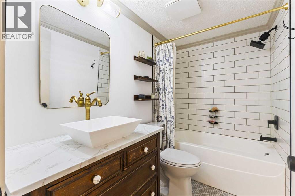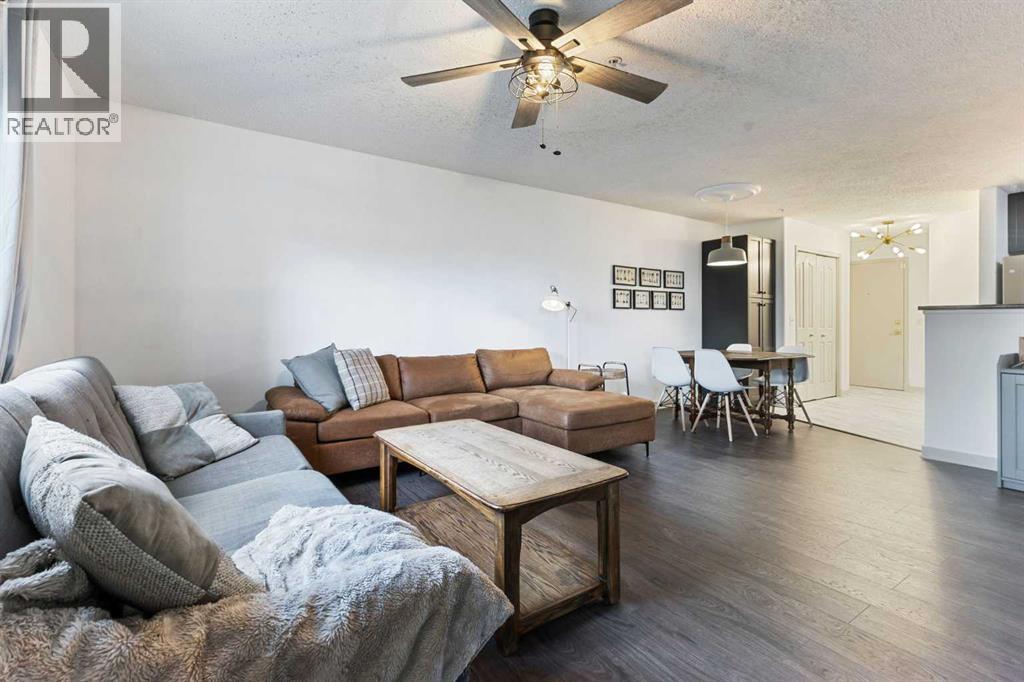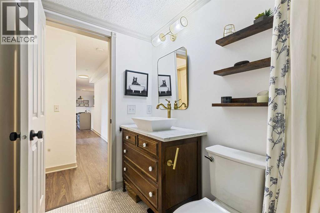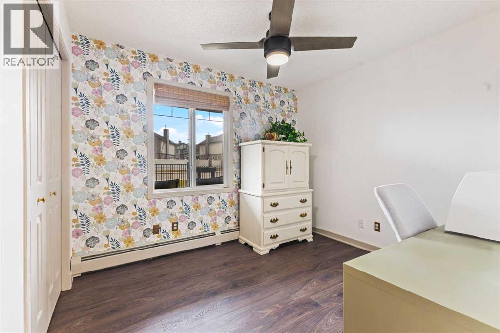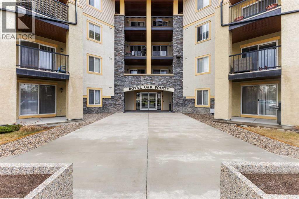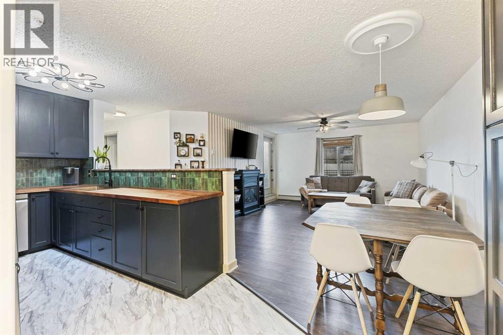 Why settle for a cookie cutter condo?? This one takes the whole cake! Welcome to this beautifully renovated 2 bed/1 bath main floor condo with ALL utilities included in the condo fees, in the desirable community of Royal Oak! This charming home has had extensive upgrades throughout, including paint & wallpaper, beautiful lighting & new laminate flooring throughout the main living & bedroom spaces . The kitchen has been fully refreshed, featuring gorgeous butcher block counters, charcoal painted cabinetry, contemporary vinyl tile backsplash, and new luxury vinyl tile flooring. The generous open concept living/dining space features large sunny windows, a lovely portable electric fireplace w/mantle & display shelves, and easy access to the good sized patio for relaxing on lovely summer evenings. The serene primary bedroom features moody wall paint, large windows & updated contemporary closet doors. The fully refinished 4 pc bath features penny tile flooring, new tile & fixtures in the tub/shower, and a gorgeous vanity refurbished from a 100 year old dresser. The good sized second bedroom and in suite laundry complete the unit. The one titled underground parking spot also has a storage unit, (one of only 10 in the complex!) and plenty of visitor parking for guests. This well managed complex is pet free (as of April 1/25), and is close to parks & playgrounds, schools, shopping, the fantastic YMCA in Rocky Ridge and easy access to Country Hills Blvd and Stoney Trail. This ready to move in property is a must see! (id:55577)