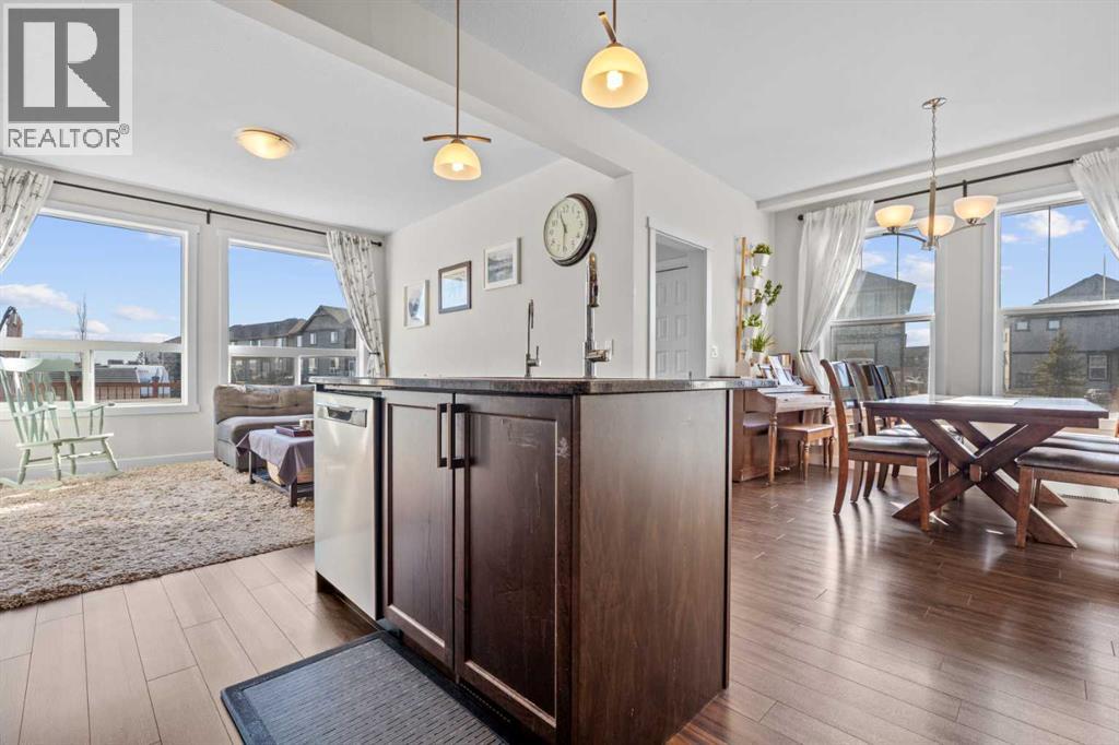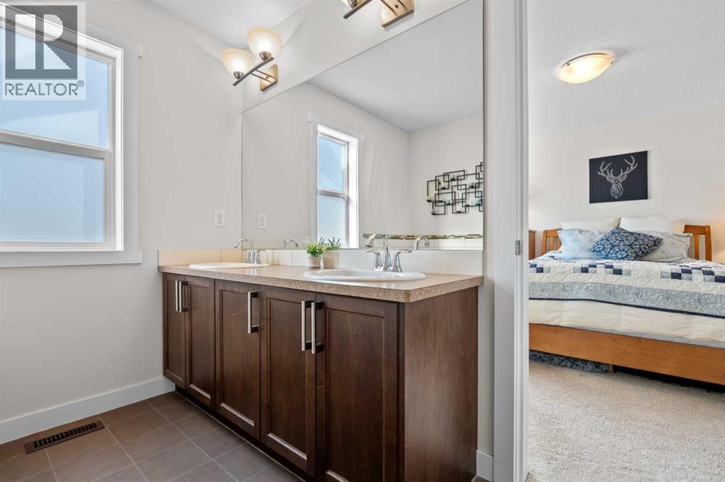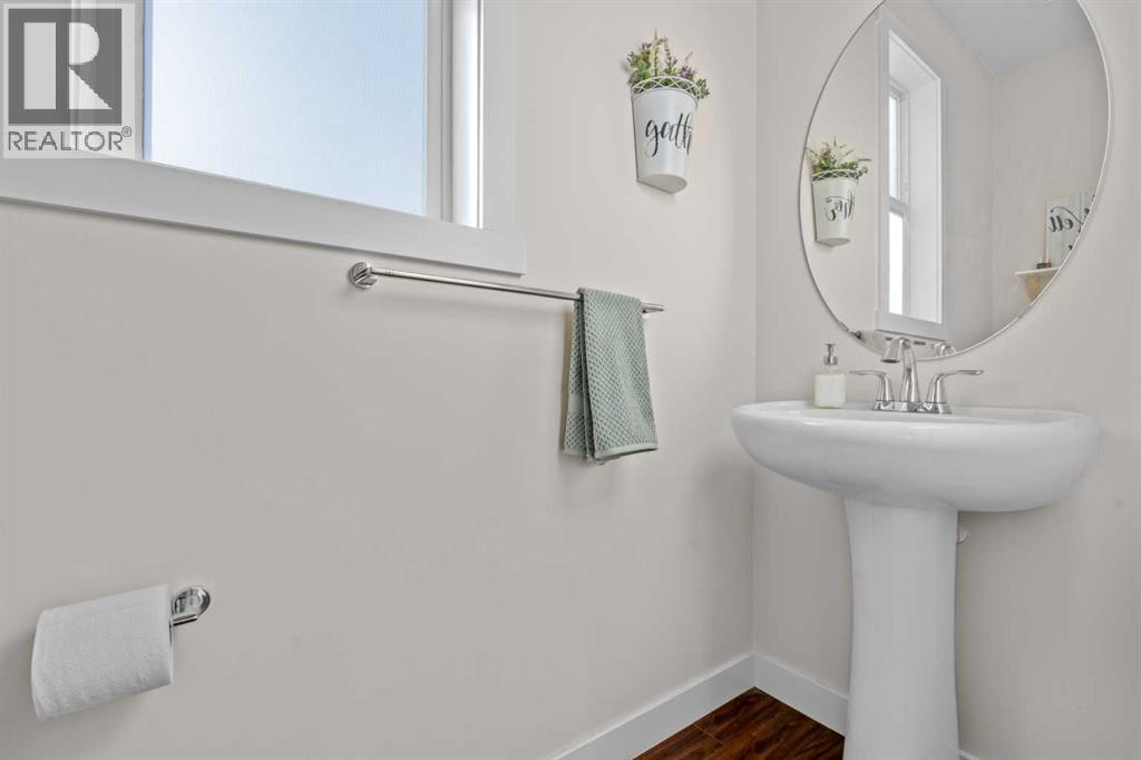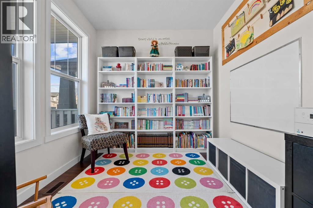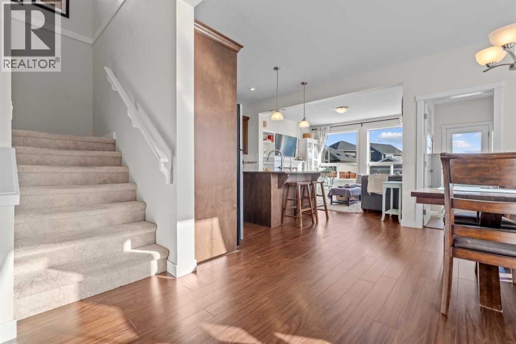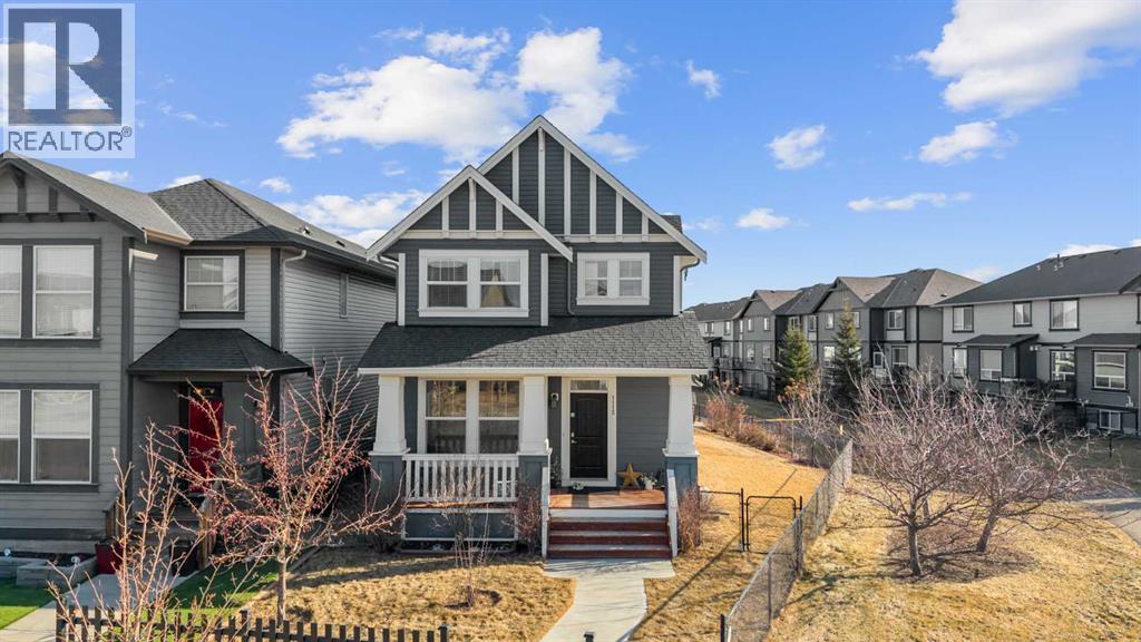 Welcome to this beautifully maintained, original-owner home, perfectly situated on a quiet CORNER LOT beside a scenic WALKING PATH. Thoughtfully designed and ideally located, it’s just STEPS from a SCHOOL, PLAYGROUND, POND, PARK, and a protected nature preserve. Inside, the 9-ft ceilings and open floor plan create a bright, welcoming atmosphere. The main level includes a versatile OFFICE/DEN, a modern kitchen with STAINLESS STEEL APPLIANCES that flows seamlessly into the dining area, and a comfortable living room centered around a cozy FIREPLACE. A convenient powder room and a well-organized mudroom, with both a closet and pantry, add everyday practicality. The backyard offers a generous outdoor space with a huge DECK, SHED, playhouse/platform, and GARDEN BOXES filled with assorted herbs. As spring arrives, the property comes alive with raspberry and haskap bushes, rose bushes, mountain ash, Bailey’s Schubert, Japanese lilac trees, and a charming crabapple tree in the front yard. Upstairs, you’ll find three spacious bedrooms and two full bathrooms. Relax with a book in the sitting area next to the window of the primary bedroom, or soak in the tub in the primary ensuite, with dual sinks, and a walk-in closet. A separate upper-level laundry room adds extra convenience. The undeveloped basement features 9-ft ceilings, large windows, and ample room to create additional living space, whether you envision an office, extra bedroom, or a home gym, with mirrors already included. A brand new hot water tank and water softener is also included. Only a quick 20 minute commute to Calgary city limits, this home offers so much value with a wonderful blend of comfort, function, and family-friendly living in a truly inviting setting. (id:55577)