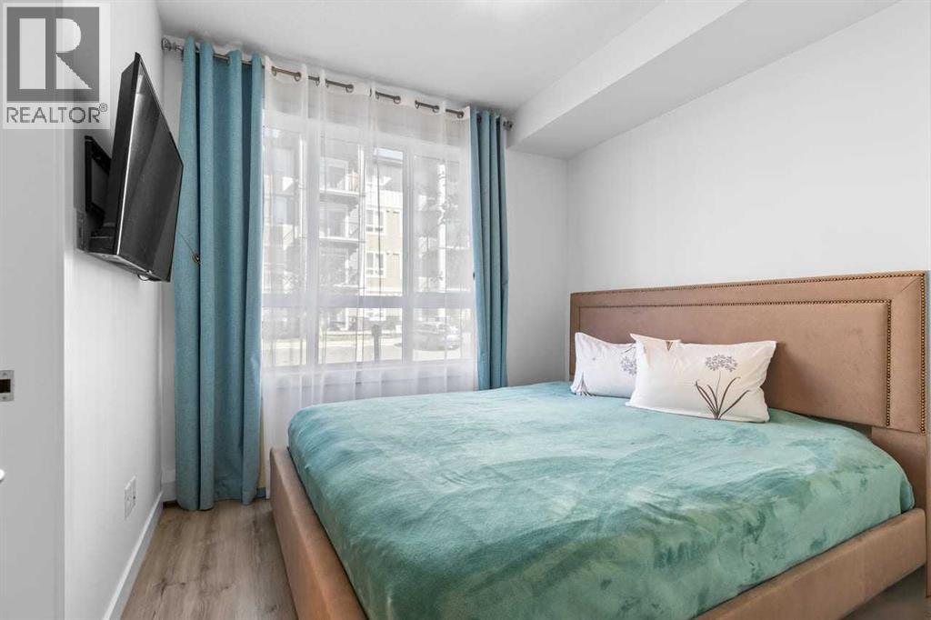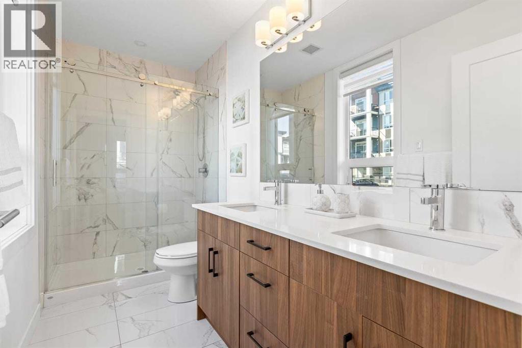 Looking for space + style? This 958 sq. ft. 2 bed/2 bath condo in Walden has tons of upgrades, 2 parking stalls, and a private deck with gate to green space. A true gem in the heart of the community! The unit can be accessed either through the main building entrance or via its own private ground-level entrance. The kitchen and bathrooms showcase custom tilework along with quartz island that comfortably seats four. A chimney-style range hood, counter-depth fridge, smooth cooktop, granite sink, pot lights, and under-cabinet lighting complete this stunning kitchen.The primary bedroom easily fits a king-sized bed and nightstands, and connects to a large walk-through closet leading to a beautiful ensuite with a frameless glass shower, quartz countertops, two sinks and built-in cabinetry. The second bedroom fits a kingsize bed too and offers direct access to the main 4-piece bath. The heated underground stall is conveniently located near the entrance and direct access to the assigned storage locker. With its rare floor plan, extensive upgrades, and unbeatable outdoor space, this condo is truly a gem in family friendly Walden. (id:55577)