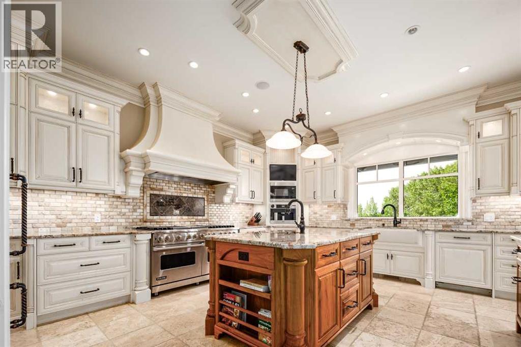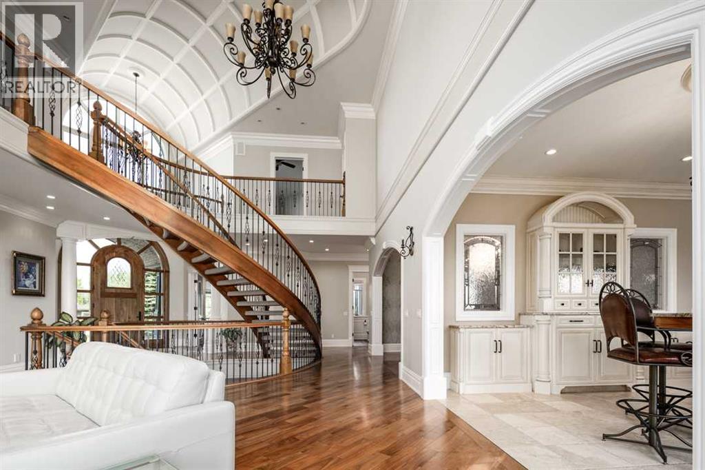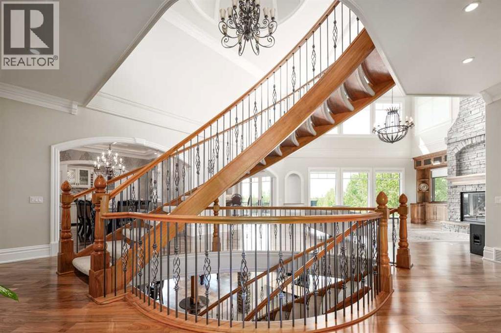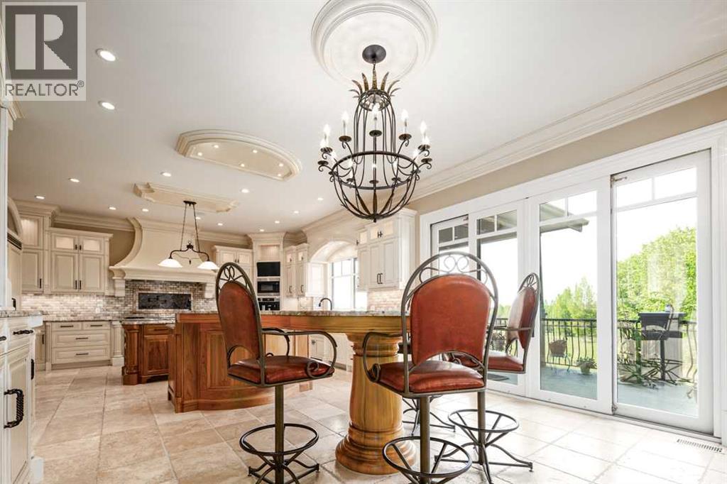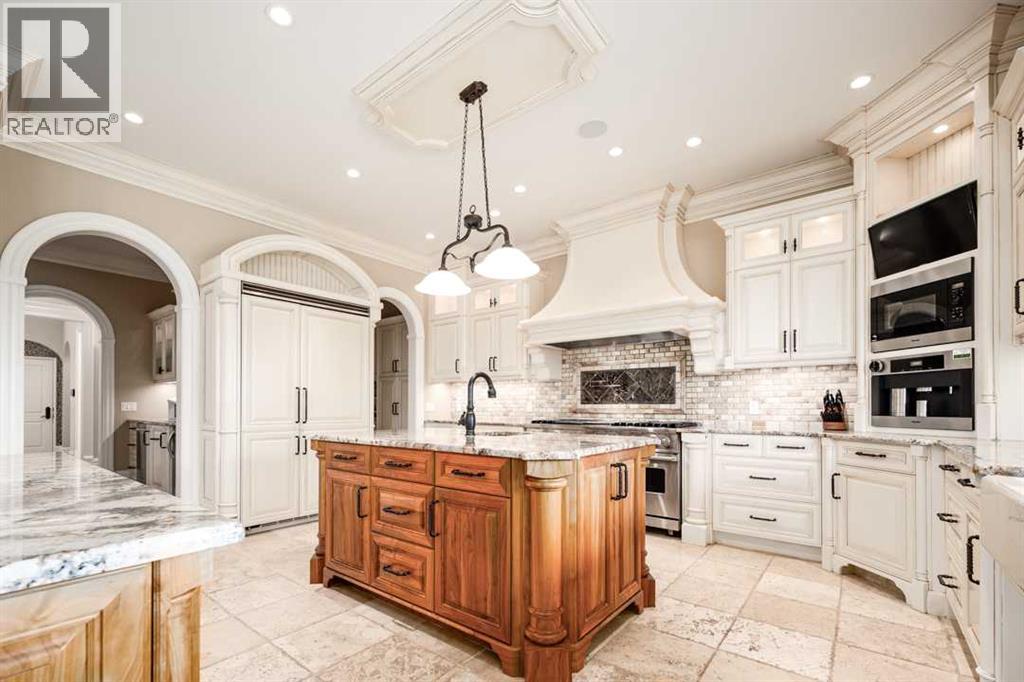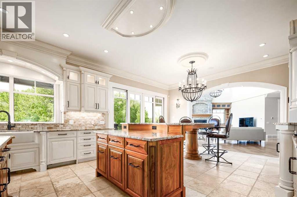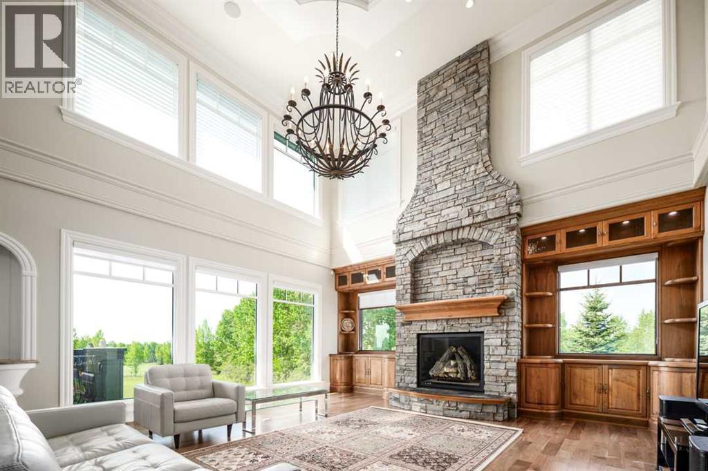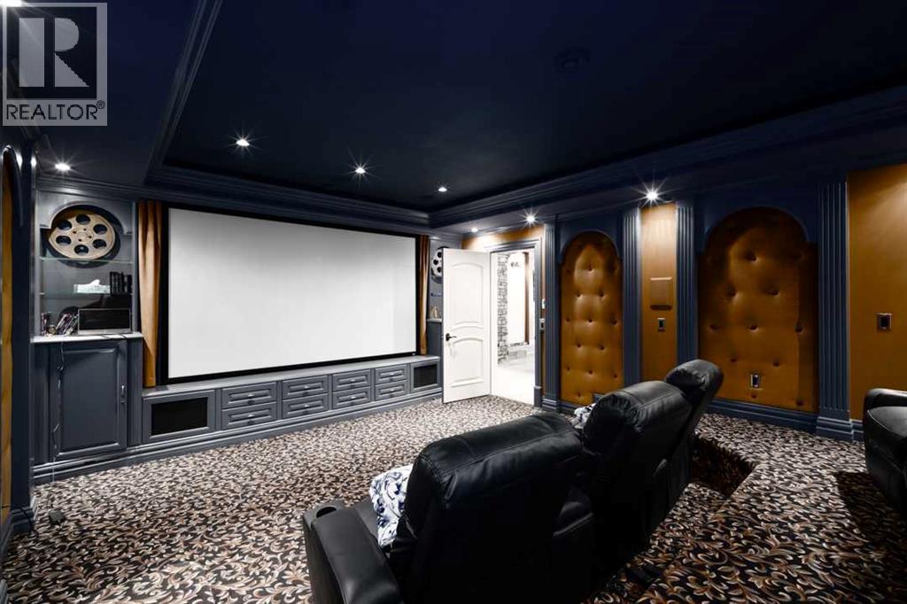Experience timeless elegance in this extraordinary French Country Chateau, designed by Dreamworks, this architectural masterpiece is nestled on a picturesque 2-acre lot with panoramic mountain views. At the heart of the home is a magnificent 2 storey Great Room with a dramatic 20 ft barrel vaulted ceiling and floor-to-ceiling natural stone fireplace. Rich walnut hardwood floors, custom crown mouldings, and a curved walnut staircase set the tone for this warm yet opulent residence. The dream kitchen offers both function and elegance, featuring antiqued cream cabinetry, exotic granite countertops, and two expansive islands. Culinary enthusiasts will appreciate the top-tier appliance package, including a 60” Viking gas range, 48” paneled Viking fridge, KitchenAid Professional dishwasher, ice maker, and wine and beverage fridges. The layout includes a walk-through pantry with custom cabinets and granite counters, offering direct access from the garage for effortless grocery unloading, as well as a separate butler’s pantry with additional storage and prep space, perfect for seamless entertaining. The main floor showcases a luxurious primary suite featuring a double sided fireplace, bay window sitting area, private balcony access, & vaulted ceilings with ambient valence lighting. The spa-like ensuite offers a free standing BainUltra heated air-jet tub, steam shower, and an enormous double dressing room with custom-built cabinetry, drawers, and a central island. Additional main level highlights include two powder rooms, a private office, a richly paneled den with walnut coffered ceilings and custom built-ins, and a well-appointed laundry room. The upper level features two secondary bedrooms, each with private ensuite bathrooms. Downstairs, the fully finished walkout basement is a true entertainer’s paradise. A stunning circular wet bar with pendant lighting anchors the massive recreation and games room, while a dedicated media room features a 135” screen, 1080p projector, elevated theatre seating for seven, and a Dolby THX 14.2 surround sound system. A private gym with cork flooring and adjacent steam bath, a guest bedroom with 5-piece ensuite, a wine cellar with wrought iron glass doors and temperature control, and a Russound 26-speaker home stereo system complete this spectacular level. For the car enthusiast, quadruple oversized attached garages offer parking for up to 6 vehicles, featuring 12.5’ ceilings, epoxy floors with border detailing, floor drains, and direct access to the basement. Located in a serene and private setting, yet minutes from top-rated schools, Aspen Landing, the 69th Street C-Train station, and major routes including Stoney Trail. Enjoy nearby golf courses and community amenities including a playground, outdoor recreation area, pickleball court, skating rink, picnic space, and an extensive network of walking paths. This is more than a home—it’s a lifestyle. A rare and refined estate for the most discerning buyer (id:55577)