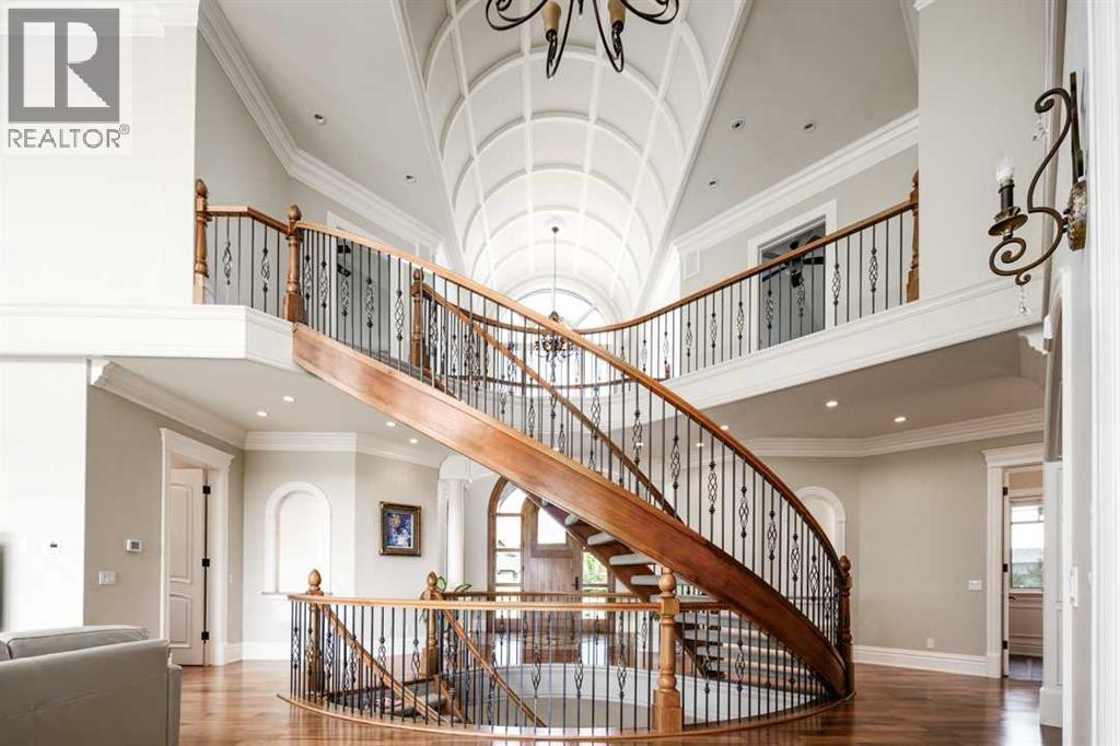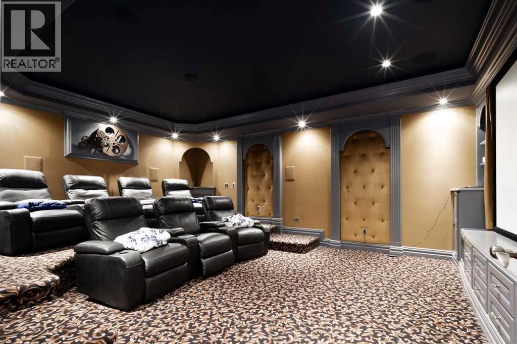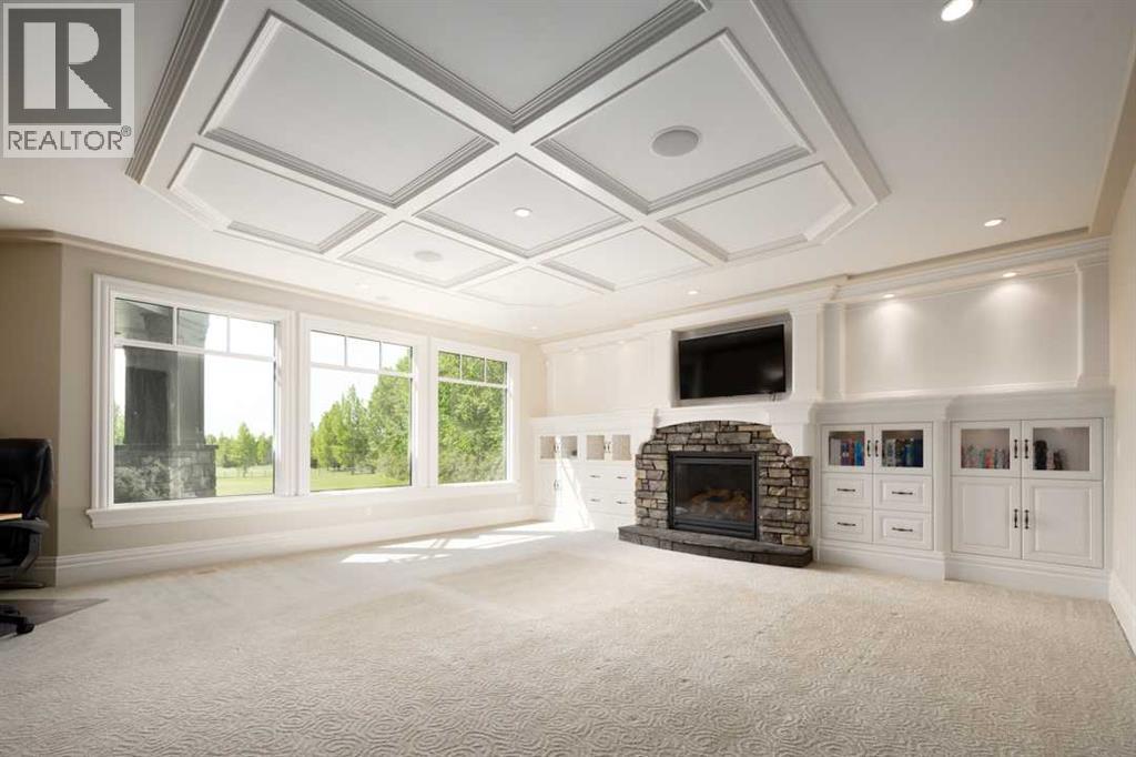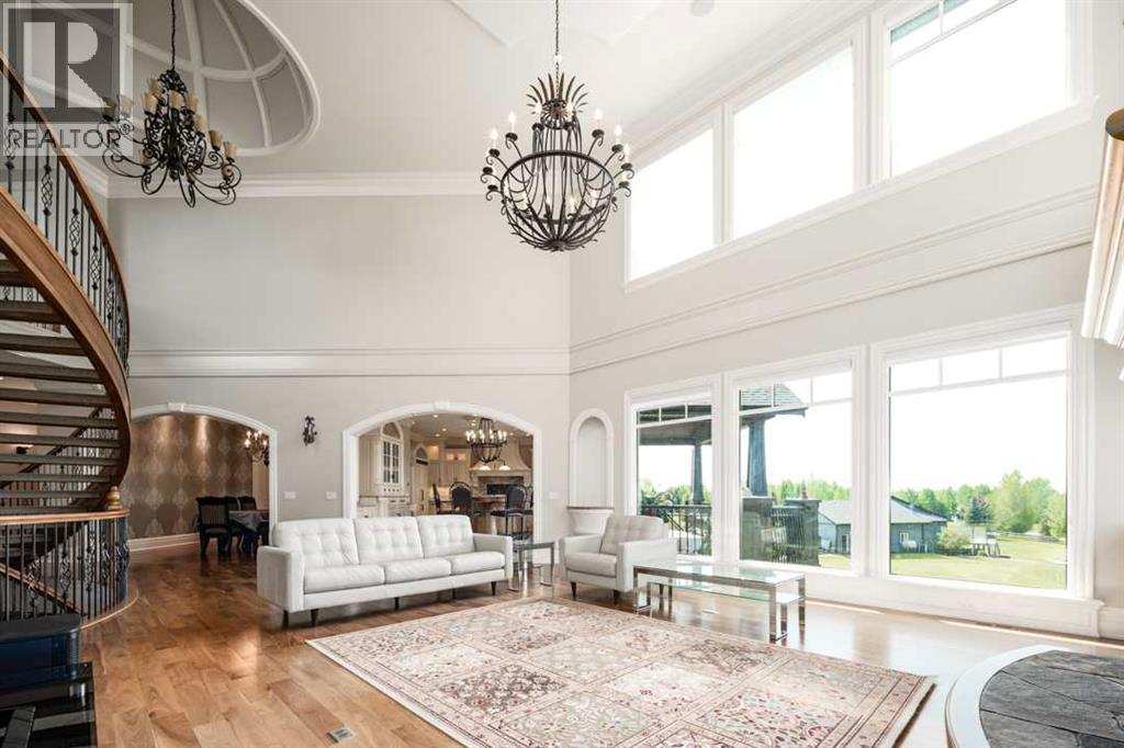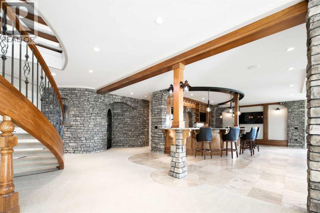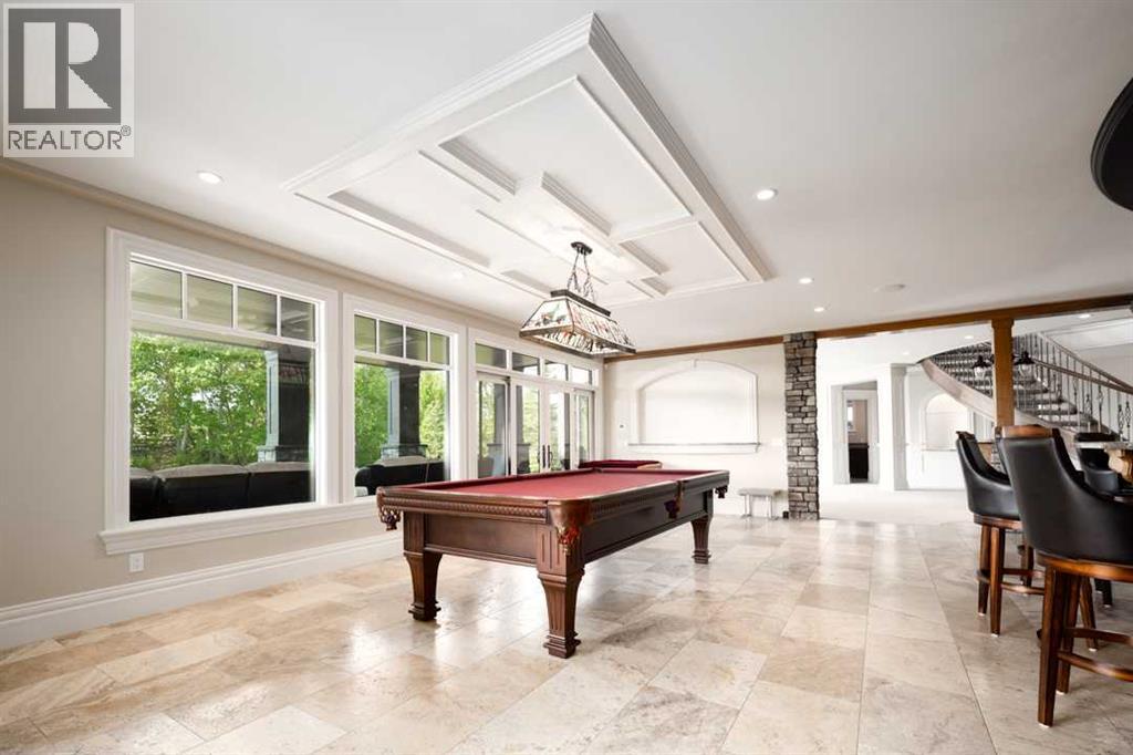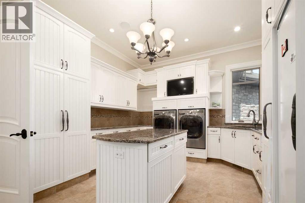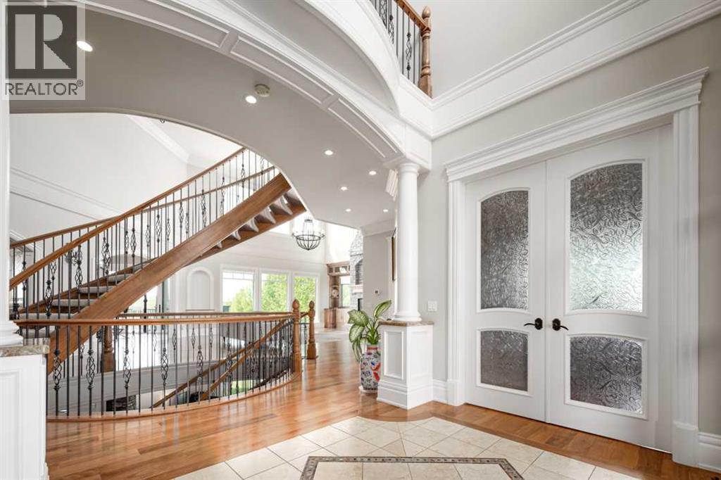 Experience timeless elegance in this extraordinary French Country Chateau, designed by Dreamworks, this architectural masterpiece is nestled on a picturesque 2-acre lot with panoramic mountain views. At the heart of the home is a magnificent 2 storey Great Room with a dramatic 20 ft barrel vaulted ceiling and floor-to-ceiling natural stone fireplace. Rich walnut hardwood floors, custom crown mouldings, and a curved walnut staircase set the tone for this warm yet opulent residence. The dream kitchen offers both function and elegance, featuring antiqued cream cabinetry, exotic granite countertops, and two expansive islands. Culinary enthusiasts will appreciate the top-tier appliance package, including a 60” Viking gas range, 48” paneled Viking fridge, KitchenAid Professional dishwasher, ice maker, and wine and beverage fridges. The layout includes a walk-through pantry with custom cabinets and granite counters, offering direct access from the garage for effortless grocery unloading, as well as a separate butler’s pantry with additional storage and prep space, perfect for seamless entertaining. The main floor showcases a luxurious primary suite featuring a double sided fireplace, bay window sitting area, private balcony access, & vaulted ceilings with ambient valence lighting. The spa-like ensuite offers a free standing BainUltra heated air-jet tub, steam shower, and an enormous double dressing room with custom-built cabinetry, drawers, and a central island. Additional main level highlights include two powder rooms, a private office, a richly paneled den with walnut coffered ceilings and custom built-ins, and a well-appointed laundry room. The upper level features two secondary bedrooms, each with private ensuite bathrooms. Downstairs, the fully finished walkout basement is a true entertainer’s paradise. A stunning circular wet bar with pendant lighting anchors the massive recreation and games room, while a dedicated media room features a 135” screen, 1080p projector, elevated theatre seating for seven, and a Dolby THX 14.2 surround sound system. A private gym with cork flooring and adjacent steam bath, a guest bedroom with 5-piece ensuite, a wine cellar with wrought iron glass doors and temperature control, and a Russound 26-speaker home stereo system complete this spectacular level. For the car enthusiast, quadruple oversized attached garages offer parking for up to 6 vehicles, featuring 12.5’ ceilings, epoxy floors with border detailing, floor drains, and direct access to the basement. Located in a serene and private setting, yet minutes from top-rated schools, Aspen Landing, the 69th Street C-Train station, and major routes including Stoney Trail. Enjoy nearby golf courses and community amenities including a playground, outdoor recreation area, pickleball court, skating rink, picnic space, and an extensive network of walking paths. This is more than a home—it’s a lifestyle. A rare and refined estate for the most discerning buyer (id:55577)