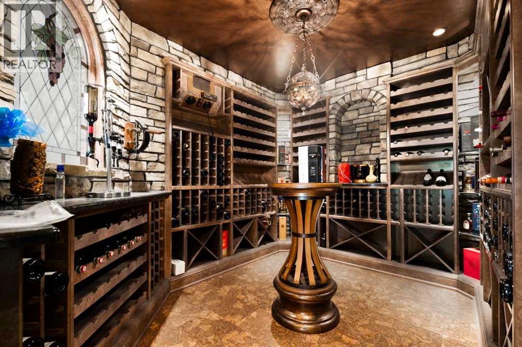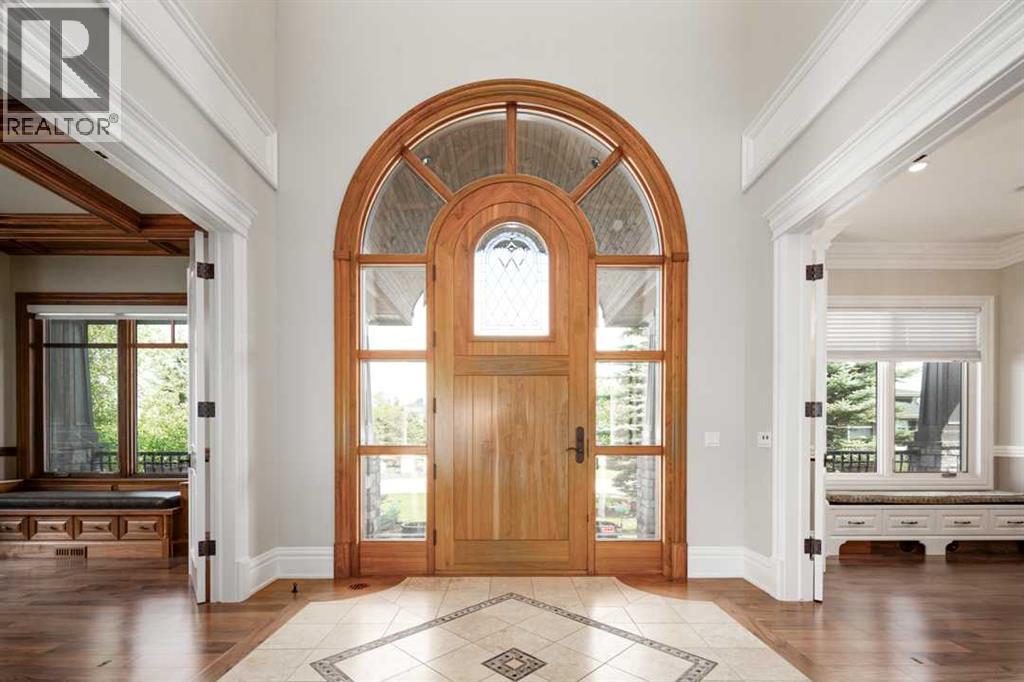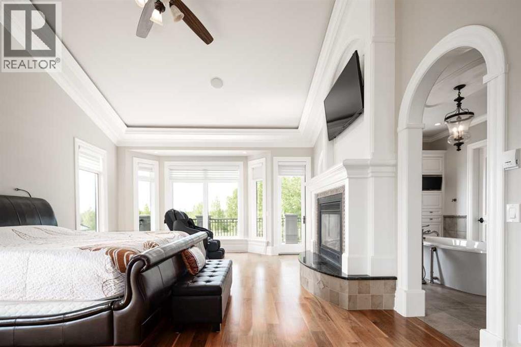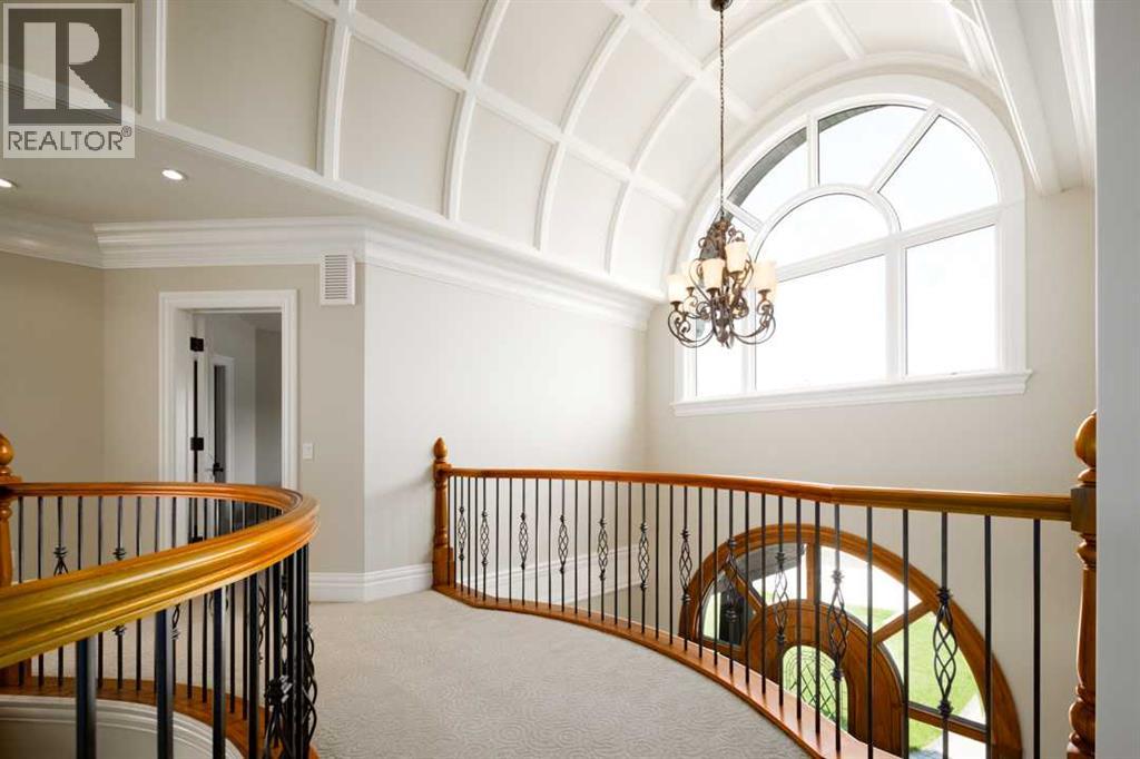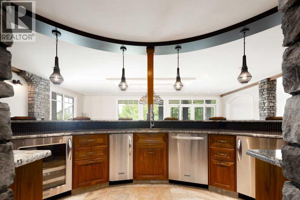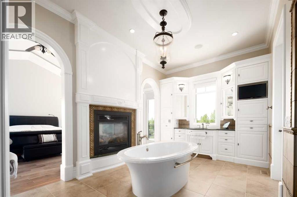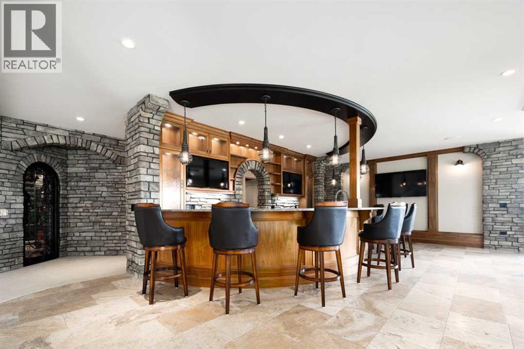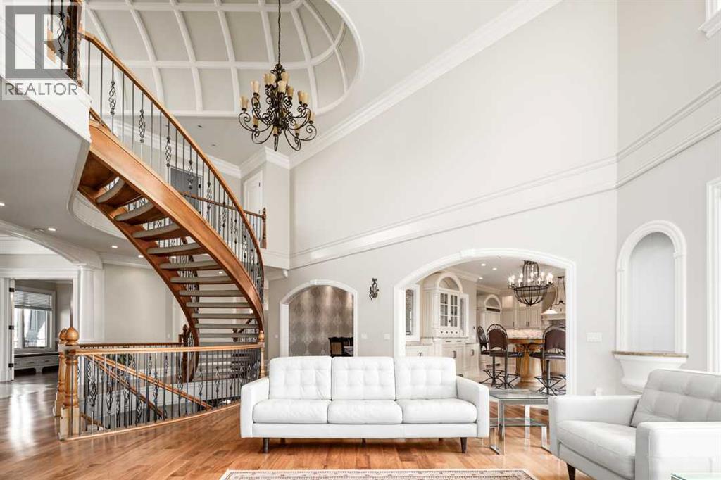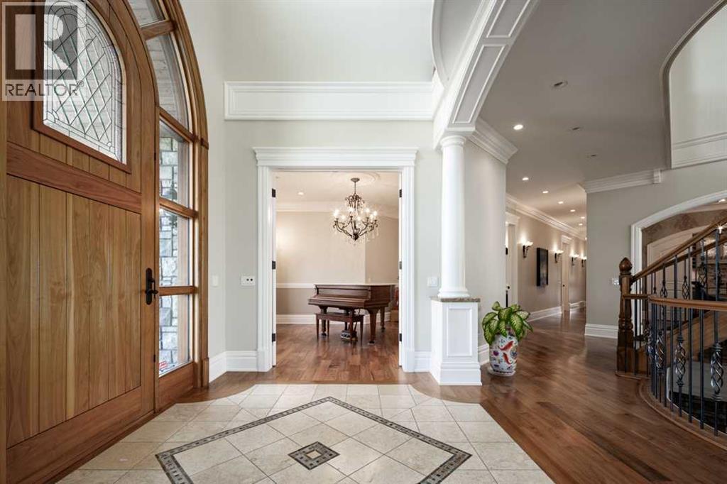 Experience timeless elegance in this extraordinary French Country Chateau, designed by Dreamworks, this architectural masterpiece is nestled on a picturesque 2-acre lot with panoramic mountain views. At the heart of the home is a magnificent 2 storey Great Room with a dramatic 20 ft barrel vaulted ceiling and floor-to-ceiling natural stone fireplace. Rich walnut hardwood floors, custom crown mouldings, and a curved walnut staircase set the tone for this warm yet opulent residence. The dream kitchen offers both function and elegance, featuring antiqued cream cabinetry, exotic granite countertops, and two expansive islands. Culinary enthusiasts will appreciate the top-tier appliance package, including a 60” Viking gas range, 48” paneled Viking fridge, KitchenAid Professional dishwasher, ice maker, and wine and beverage fridges. The layout includes a walk-through pantry with custom cabinets and granite counters, offering direct access from the garage for effortless grocery unloading, as well as a separate butler’s pantry with additional storage and prep space, perfect for seamless entertaining. The main floor showcases a luxurious primary suite featuring a double sided fireplace, bay window sitting area, private balcony access, & vaulted ceilings with ambient valence lighting. The spa-like ensuite offers a free standing BainUltra heated air-jet tub, steam shower, and an enormous double dressing room with custom-built cabinetry, drawers, and a central island. Additional main level highlights include two powder rooms, a private office, a richly paneled den with walnut coffered ceilings and custom built-ins, and a well-appointed laundry room. The upper level features two secondary bedrooms, each with private ensuite bathrooms. Downstairs, the fully finished walkout basement is a true entertainer’s paradise. A stunning circular wet bar with pendant lighting anchors the massive recreation and games room, while a dedicated media room features a 135” screen, 1080p projector, elevated theatre seating for seven, and a Dolby THX 14.2 surround sound system. A private gym with cork flooring and adjacent steam bath, a guest bedroom with 5-piece ensuite, a wine cellar with wrought iron glass doors and temperature control, and a Russound 26-speaker home stereo system complete this spectacular level. For the car enthusiast, quadruple oversized attached garages offer parking for up to 6 vehicles, featuring 12.5’ ceilings, epoxy floors with border detailing, floor drains, and direct access to the basement. Located in a serene and private setting, yet minutes from top-rated schools, Aspen Landing, the 69th Street C-Train station, and major routes including Stoney Trail. Enjoy nearby golf courses and community amenities including a playground, outdoor recreation area, pickleball court, skating rink, picnic space, and an extensive network of walking paths. This is more than a home—it’s a lifestyle. A rare and refined estate for the most discerning buyer (id:55577)