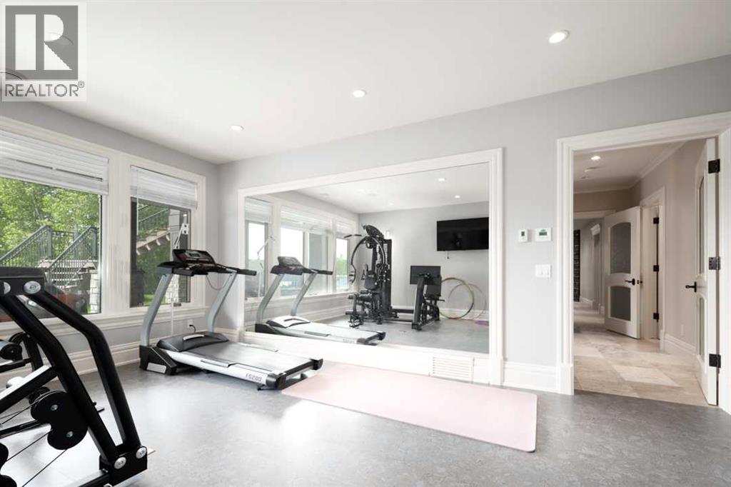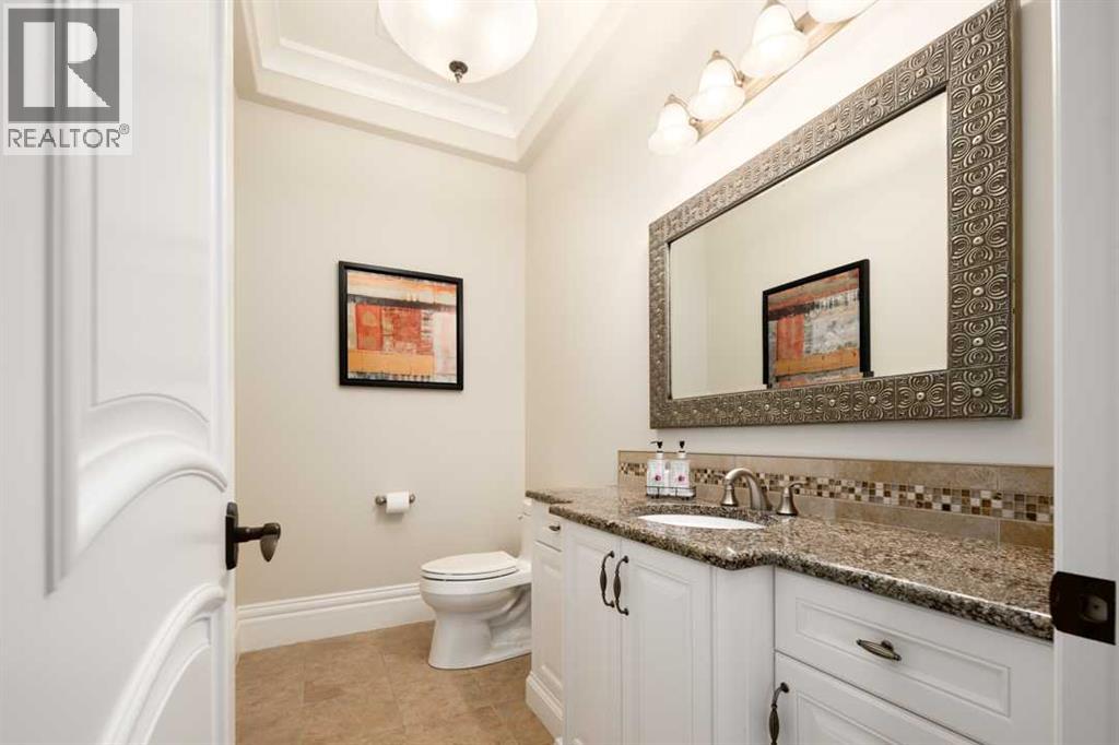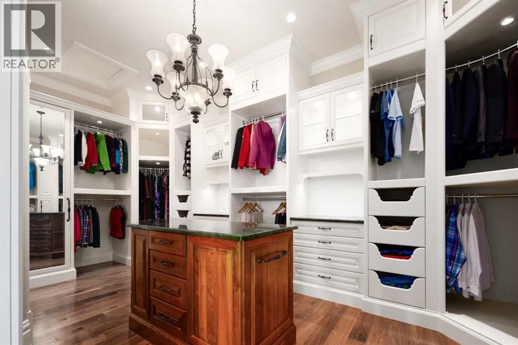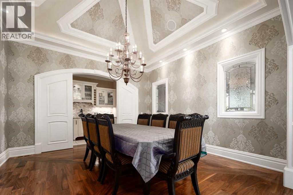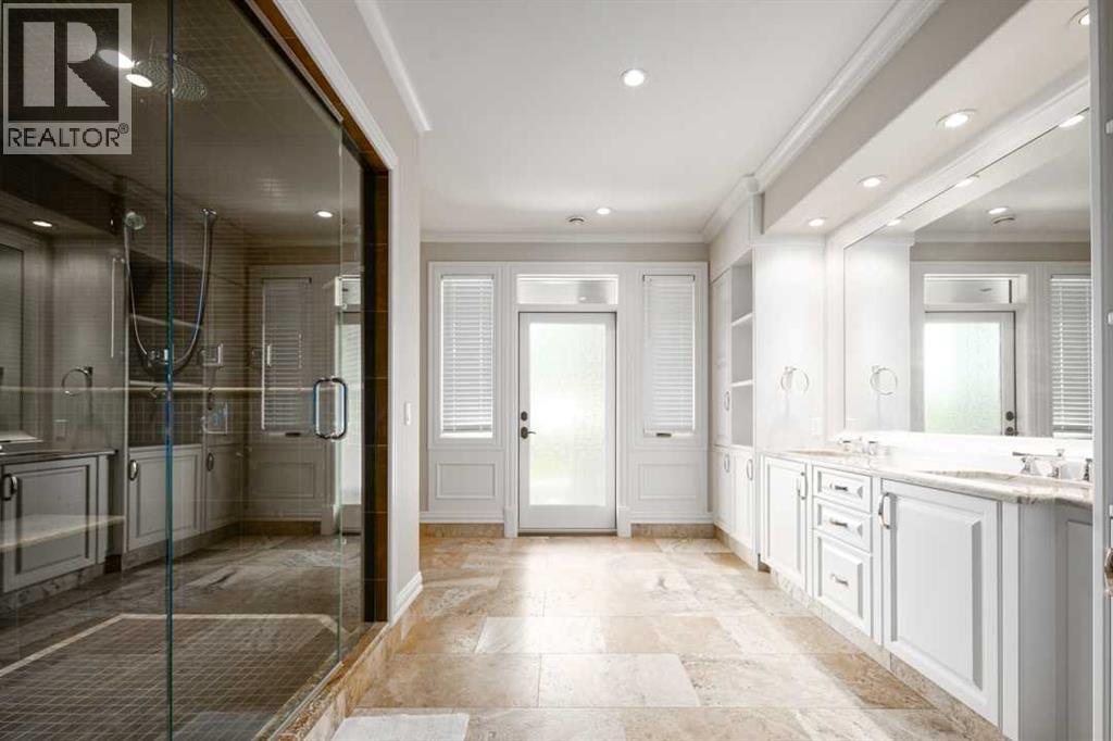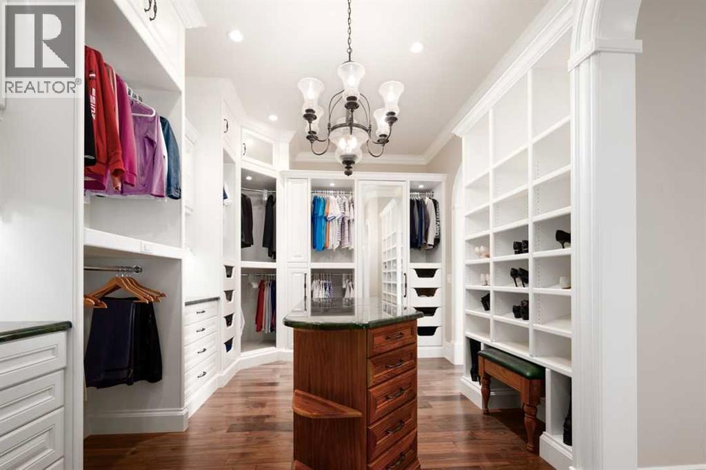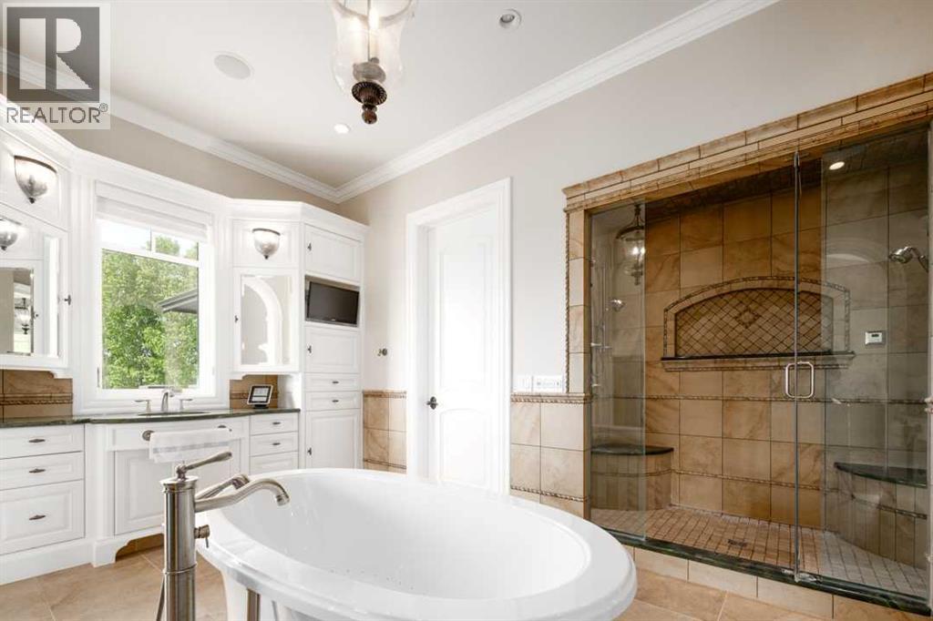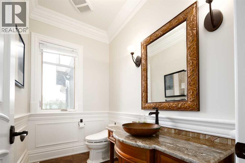 Experience timeless elegance in this extraordinary French Country Chateau, designed by Dreamworks, this architectural masterpiece is nestled on a picturesque 2-acre lot with panoramic mountain views. At the heart of the home is a magnificent 2 storey Great Room with a dramatic 20 ft barrel vaulted ceiling and floor-to-ceiling natural stone fireplace. Rich walnut hardwood floors, custom crown mouldings, and a curved walnut staircase set the tone for this warm yet opulent residence. The dream kitchen offers both function and elegance, featuring antiqued cream cabinetry, exotic granite countertops, and two expansive islands. Culinary enthusiasts will appreciate the top-tier appliance package, including a 60” Viking gas range, 48” paneled Viking fridge, KitchenAid Professional dishwasher, ice maker, and wine and beverage fridges. The layout includes a walk-through pantry with custom cabinets and granite counters, offering direct access from the garage for effortless grocery unloading, as well as a separate butler’s pantry with additional storage and prep space, perfect for seamless entertaining. The main floor showcases a luxurious primary suite featuring a double sided fireplace, bay window sitting area, private balcony access, & vaulted ceilings with ambient valence lighting. The spa-like ensuite offers a free standing BainUltra heated air-jet tub, steam shower, and an enormous double dressing room with custom-built cabinetry, drawers, and a central island. Additional main level highlights include two powder rooms, a private office, a richly paneled den with walnut coffered ceilings and custom built-ins, and a well-appointed laundry room. The upper level features two secondary bedrooms, each with private ensuite bathrooms. Downstairs, the fully finished walkout basement is a true entertainer’s paradise. A stunning circular wet bar with pendant lighting anchors the massive recreation and games room, while a dedicated media room features a 135” screen, 1080p projector, elevated theatre seating for seven, and a Dolby THX 14.2 surround sound system. A private gym with cork flooring and adjacent steam bath, a guest bedroom with 5-piece ensuite, a wine cellar with wrought iron glass doors and temperature control, and a Russound 26-speaker home stereo system complete this spectacular level. For the car enthusiast, quadruple oversized attached garages offer parking for up to 6 vehicles, featuring 12.5’ ceilings, epoxy floors with border detailing, floor drains, and direct access to the basement. Located in a serene and private setting, yet minutes from top-rated schools, Aspen Landing, the 69th Street C-Train station, and major routes including Stoney Trail. Enjoy nearby golf courses and community amenities including a playground, outdoor recreation area, pickleball court, skating rink, picnic space, and an extensive network of walking paths. This is more than a home—it’s a lifestyle. A rare and refined estate for the most discerning buyer (id:55577)