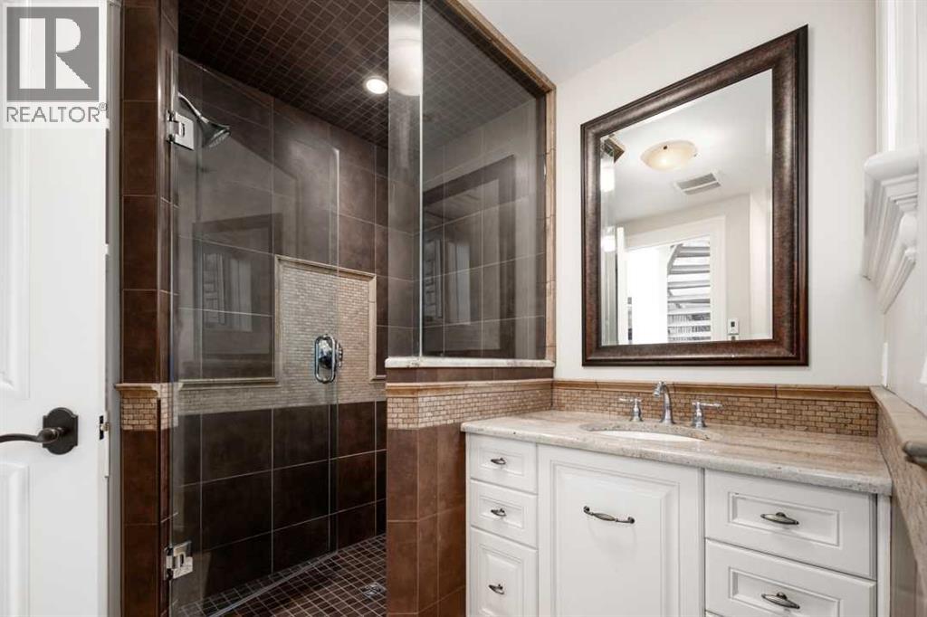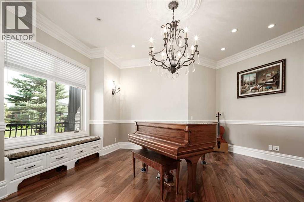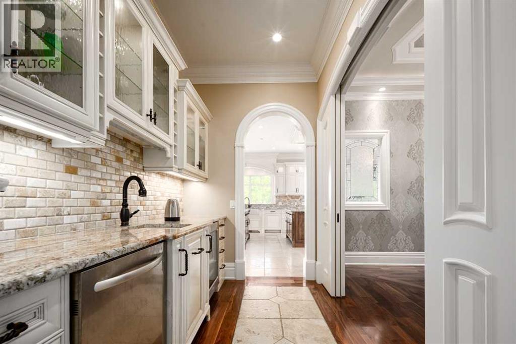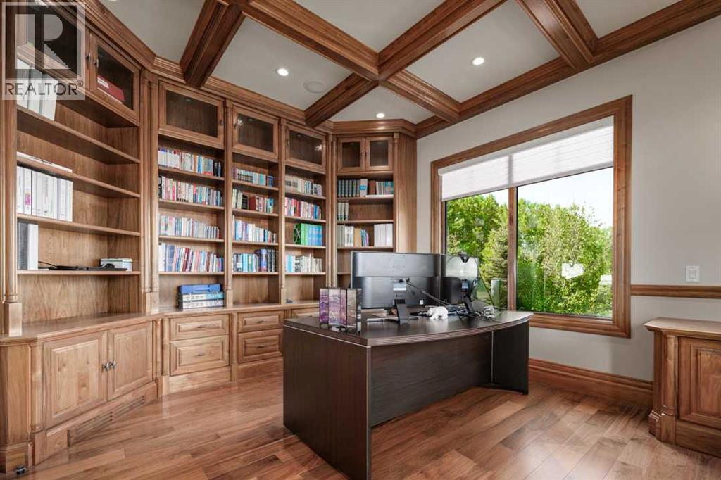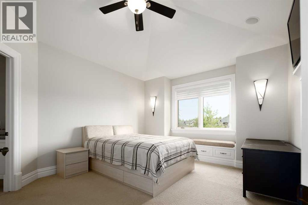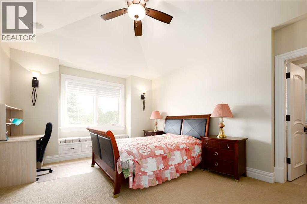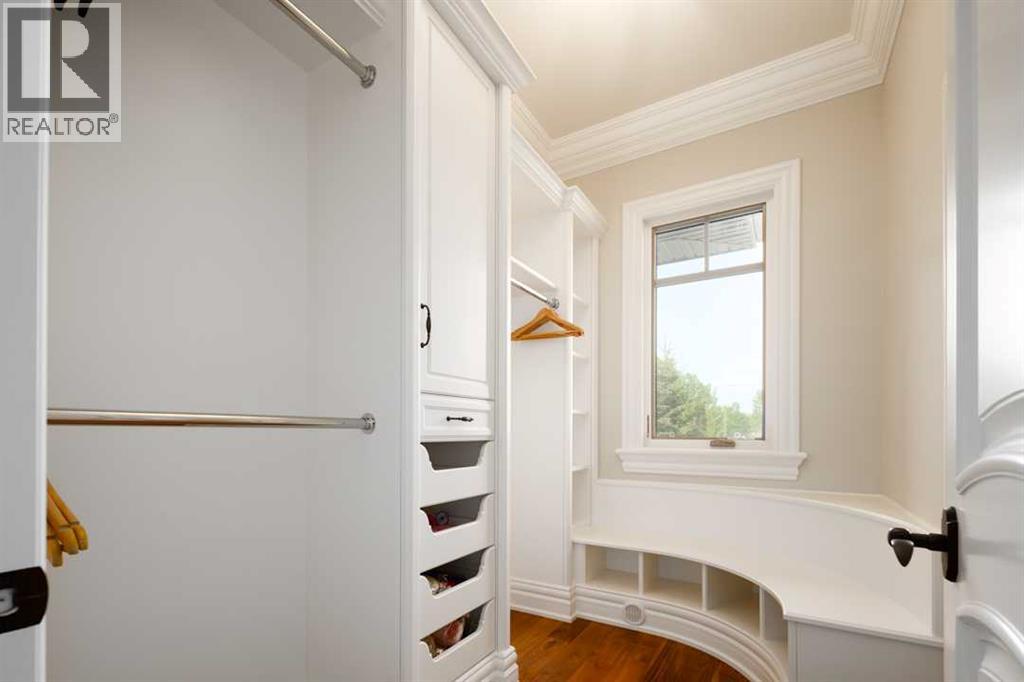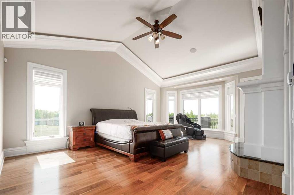 Experience timeless elegance in this extraordinary French Country Chateau, designed by Dreamworks, this architectural masterpiece is nestled on a picturesque 2-acre lot with panoramic mountain views. At the heart of the home is a magnificent 2 storey Great Room with a dramatic 20 ft barrel vaulted ceiling and floor-to-ceiling natural stone fireplace. Rich walnut hardwood floors, custom crown mouldings, and a curved walnut staircase set the tone for this warm yet opulent residence. The dream kitchen offers both function and elegance, featuring antiqued cream cabinetry, exotic granite countertops, and two expansive islands. Culinary enthusiasts will appreciate the top-tier appliance package, including a 60” Viking gas range, 48” paneled Viking fridge, KitchenAid Professional dishwasher, ice maker, and wine and beverage fridges. The layout includes a walk-through pantry with custom cabinets and granite counters, offering direct access from the garage for effortless grocery unloading, as well as a separate butler’s pantry with additional storage and prep space, perfect for seamless entertaining. The main floor showcases a luxurious primary suite featuring a double sided fireplace, bay window sitting area, private balcony access, & vaulted ceilings with ambient valence lighting. The spa-like ensuite offers a free standing BainUltra heated air-jet tub, steam shower, and an enormous double dressing room with custom-built cabinetry, drawers, and a central island. Additional main level highlights include two powder rooms, a private office, a richly paneled den with walnut coffered ceilings and custom built-ins, and a well-appointed laundry room. The upper level features two secondary bedrooms, each with private ensuite bathrooms. Downstairs, the fully finished walkout basement is a true entertainer’s paradise. A stunning circular wet bar with pendant lighting anchors the massive recreation and games room, while a dedicated media room features a 135” screen, 1080p projector, elevated theatre seating for seven, and a Dolby THX 14.2 surround sound system. A private gym with cork flooring and adjacent steam bath, a guest bedroom with 5-piece ensuite, a wine cellar with wrought iron glass doors and temperature control, and a Russound 26-speaker home stereo system complete this spectacular level. For the car enthusiast, quadruple oversized attached garages offer parking for up to 6 vehicles, featuring 12.5’ ceilings, epoxy floors with border detailing, floor drains, and direct access to the basement. Located in a serene and private setting, yet minutes from top-rated schools, Aspen Landing, the 69th Street C-Train station, and major routes including Stoney Trail. Enjoy nearby golf courses and community amenities including a playground, outdoor recreation area, pickleball court, skating rink, picnic space, and an extensive network of walking paths. This is more than a home—it’s a lifestyle. A rare and refined estate for the most discerning buyer (id:55577)