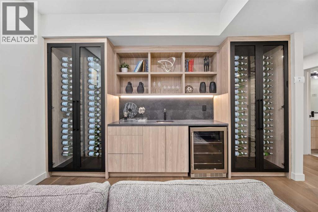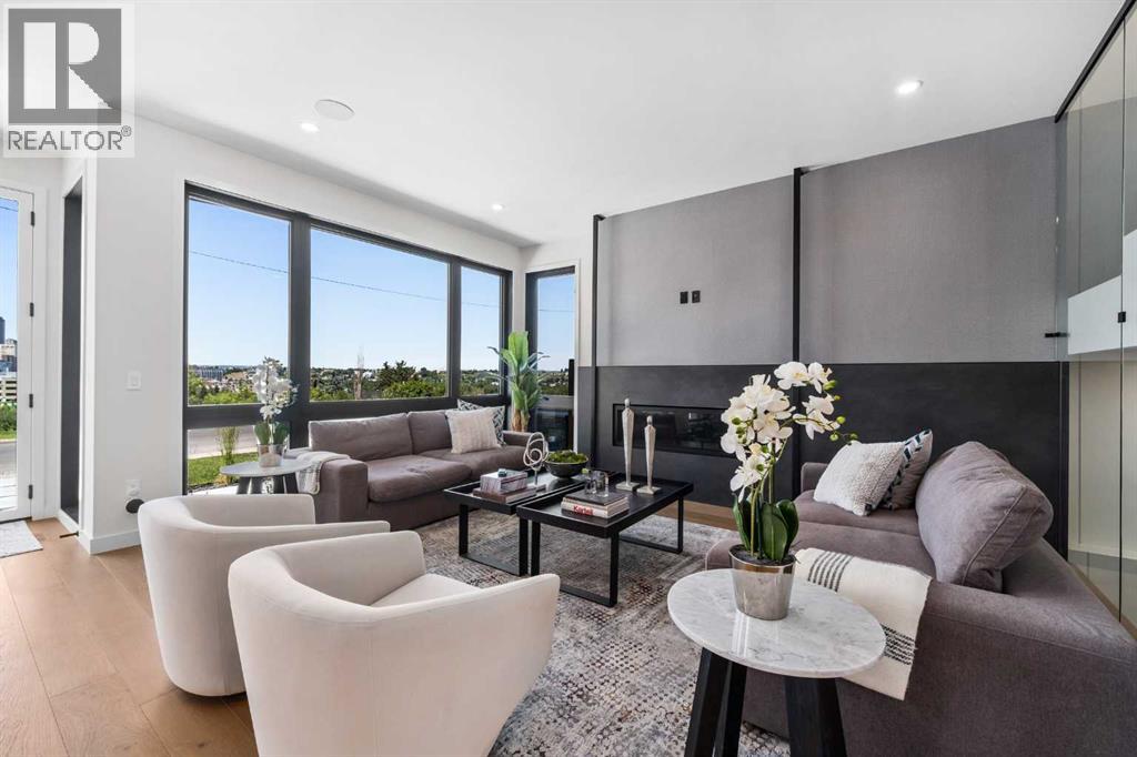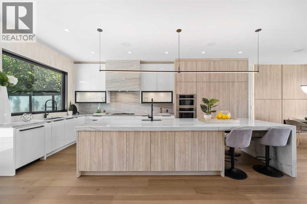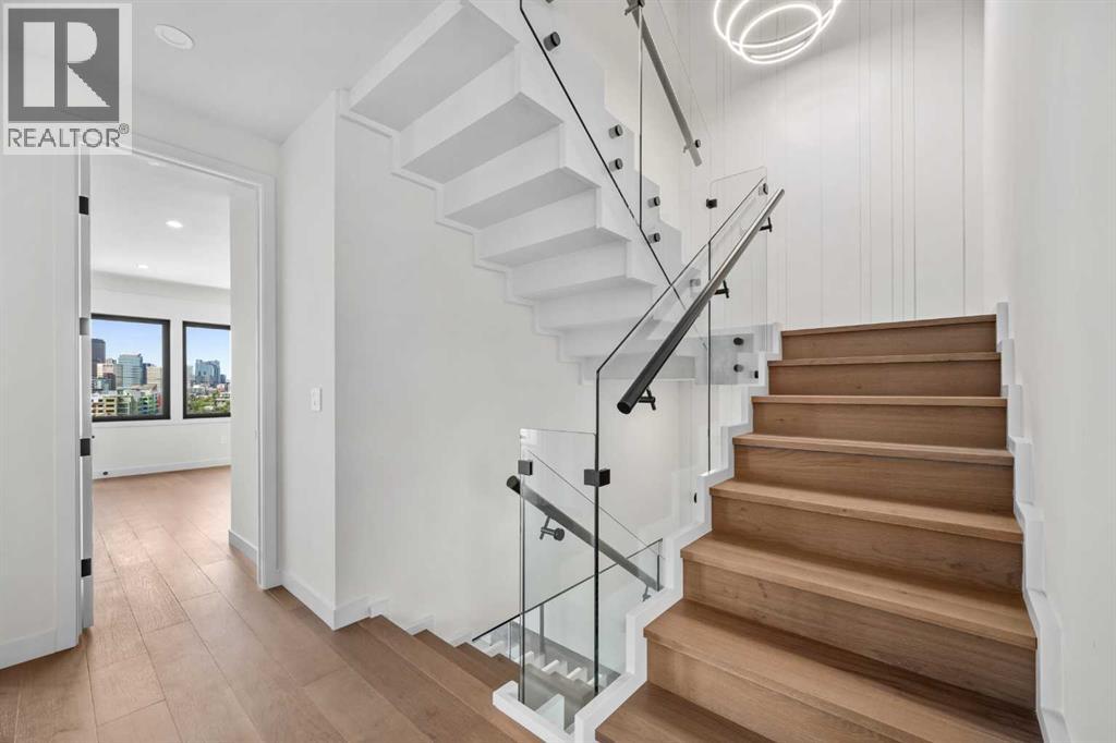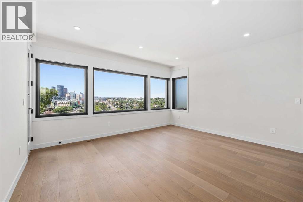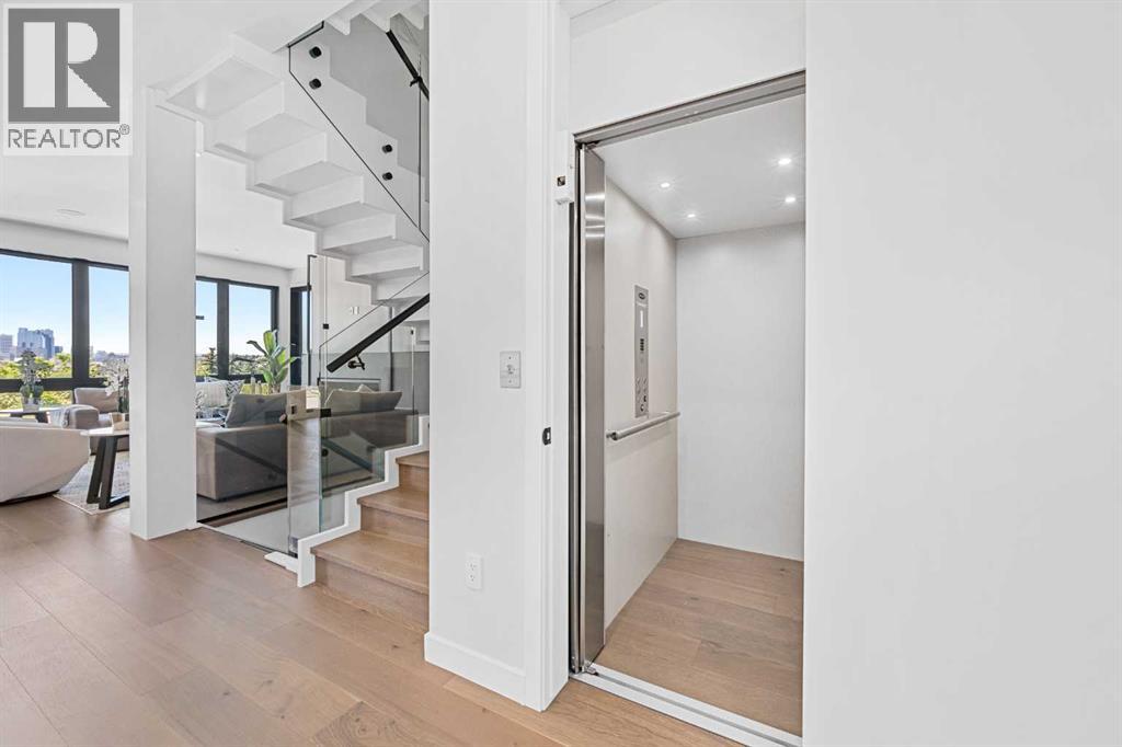An architectural masterpiece by Silverpoint Custom Homes and Paul Lavoie Interior Design. Perched on a spectacular lot overlooking Bridgeland, and offering breathtaking views of the City and Rocky Mountains. A 5,200-square-foot gem, which seamlessly blends Hollywood Hills vibes, in a meticulous and one of a kind design. A fantastic open floor plan with a separate formal living and dining rooms overlooking the city. Boasting a truly magnificent kitchen, featuring a 13ft waterfall island and all MIELE appliances. Hardwood floors weave throughout the four levels including the basement, creating a harmonious atmosphere of seamless design. The main level surprises you with a hidden coat closet, a spacious mudroom, and a private den overlooking a backyard oasis with a large deck, (hot-tub ready) Move effortlessly between levels via the elevator or a captivating floor to ceiling glass-walled staircase leading to three generous bedrooms and a master top suite, simply like no other. The second floor offers 3 spacious bedrooms with panoramic city views from 2 bedrooms, private balconies, and a separate family lounge with access to a full guest bath. A fabulous laundry room and linen closet complete this level, not to mention large picture windows offering fulll sunrise worthy east views. The third-floor PRINCIPAL BEDROOM is a showstopper with a HUGE BALCONY showcasing the best panoramic city and mountain vews. A separate lounge area with coffee bar, fridge and a built in TV LIFT separate the bedroom area. As you enter the ensuite, flooded with natural light, a magical SMARTGLASS window gives you the option of privacy, or to enjoy the fabulous city views while soaking in the tub. A luxurious dual vanity, dual spa shower area surrounded by glass, featuring heated floors and shower bench. The walk-in wardrobe suite is a one of a kind dream space, with built in's that will rival a designer shop. Large skylights, a huge window and your own washer/dryer, make this the perfect dres sing area. The lower level caters to the extended family and features a media area with full bar, gym, and a large bedroom. A full bath including a steam shower completes this level with all heated hardwood flooring. The outdoor spaces surrounding the house lets you indulge in extended year round outdoor living. A large front patio with a fire pit option, and seating lets you indulge in the west city and mountain views. The rear yard offers you a great dining space, and private relaxation areas with an optional hot tub, and a multi purpose sports area or green space. This home as expected includes all Smart home features, an elevator, extensive internal glass walls, AC, infloor heat, and an oversized garage with a full third car garage option which can be built prior to possession for the buyer at cost. An amazingly unique home with modern, yet classic design elements, encompassing every luxury option a discerning home owner would desire in their dream home. (id:55577)