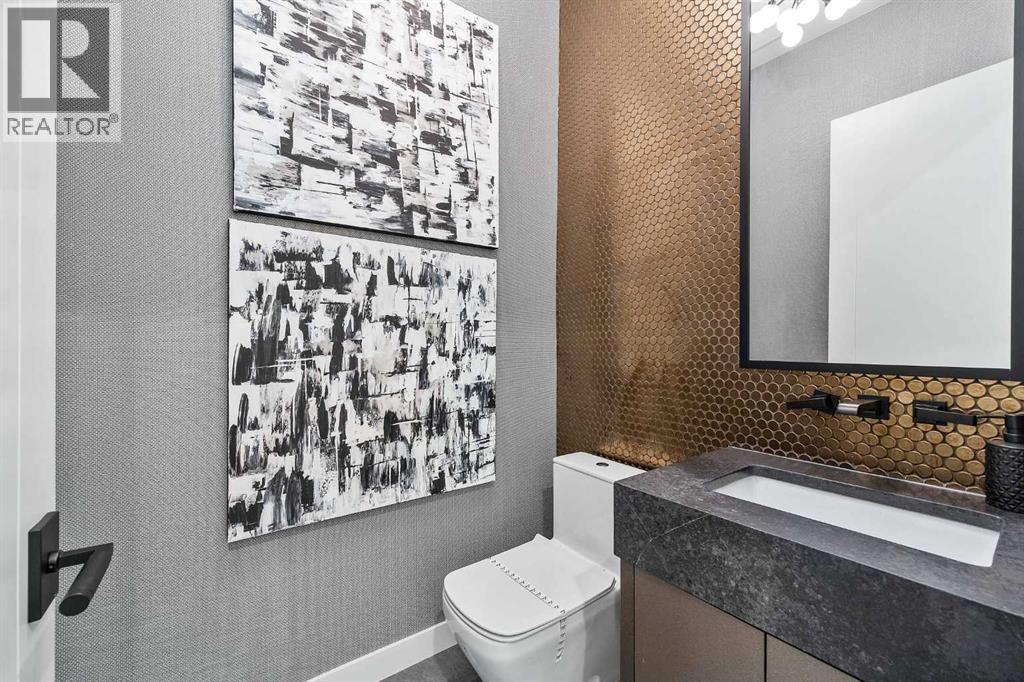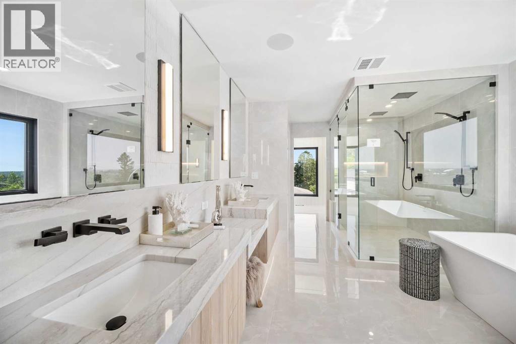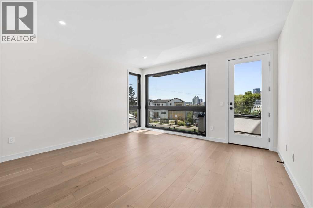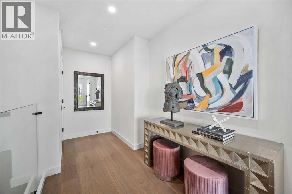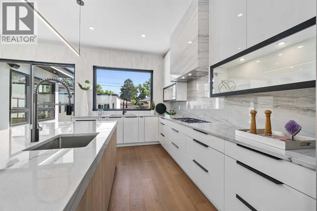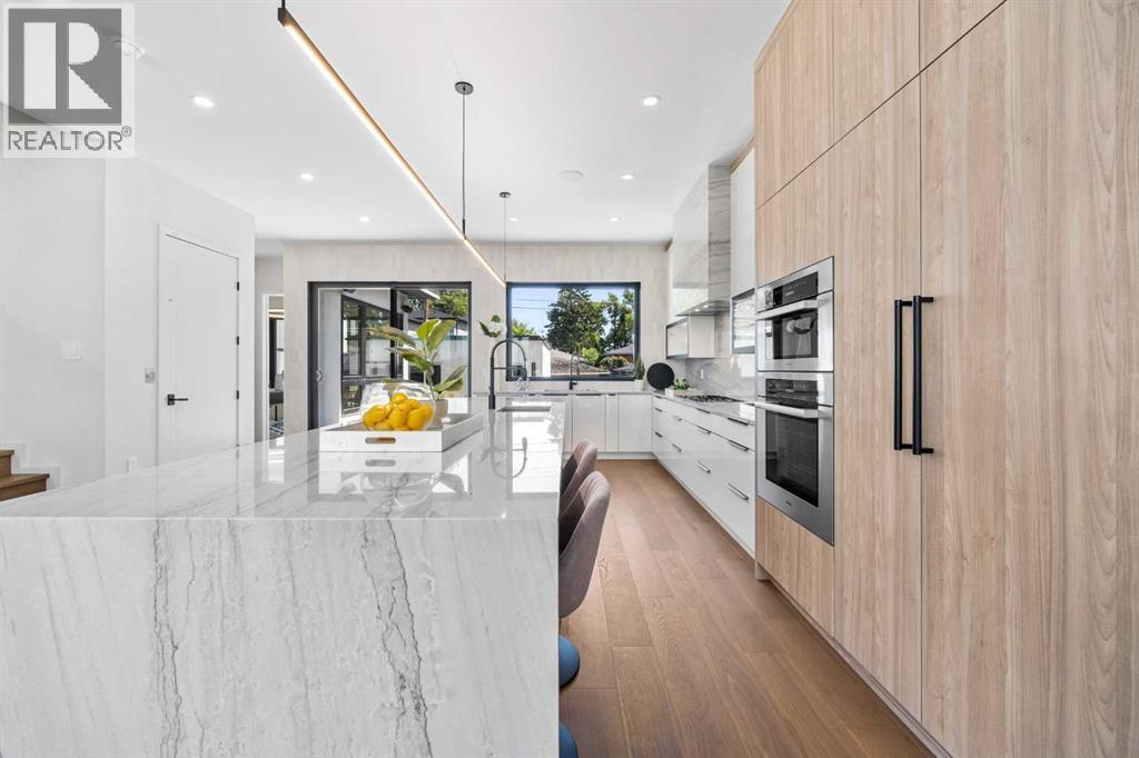 An architectural masterpiece by Silverpoint Custom Homes and Paul Lavoie Interior Design. Perched on a spectacular lot overlooking Bridgeland, and offering breathtaking views of the City and Rocky Mountains. A 5,200-square-foot gem, which seamlessly blends Hollywood Hills vibes, in a meticulous and one of a kind design. A fantastic open floor plan with a separate formal living and dining rooms overlooking the city. Boasting a truly magnificent kitchen, featuring a 13ft waterfall island and all MIELE appliances. Hardwood floors weave throughout the four levels including the basement, creating a harmonious atmosphere of seamless design. The main level surprises you with a hidden coat closet, a spacious mudroom, and a private den overlooking a backyard oasis with a large deck, (hot-tub ready) Move effortlessly between levels via the elevator or a captivating floor to ceiling glass-walled staircase leading to three generous bedrooms and a master top suite, simply like no other. The second floor offers 3 spacious bedrooms with panoramic city views from 2 bedrooms, private balconies, and a separate family lounge with access to a full guest bath. A fabulous laundry room and linen closet complete this level, not to mention large picture windows offering fulll sunrise worthy east views. The third-floor PRINCIPAL BEDROOM is a showstopper with a HUGE BALCONY showcasing the best panoramic city and mountain vews. A separate lounge area with coffee bar, fridge and a built in TV LIFT separate the bedroom area. As you enter the ensuite, flooded with natural light, a magical SMARTGLASS window gives you the option of privacy, or to enjoy the fabulous city views while soaking in the tub. A luxurious dual vanity, dual spa shower area surrounded by glass, featuring heated floors and shower bench. The walk-in wardrobe suite is a one of a kind dream space, with built in's that will rival a designer shop. Large skylights, a huge window and your own washer/dryer, make this the perfect dres sing area. The lower level caters to the extended family and features a media area with full bar, gym, and a large bedroom. A full bath including a steam shower completes this level with all heated hardwood flooring. The outdoor spaces surrounding the house lets you indulge in extended year round outdoor living. A large front patio with a fire pit option, and seating lets you indulge in the west city and mountain views. The rear yard offers you a great dining space, and private relaxation areas with an optional hot tub, and a multi purpose sports area or green space. This home as expected includes all Smart home features, an elevator, extensive internal glass walls, AC, infloor heat, and an oversized garage with a full third car garage option which can be built prior to possession for the buyer at cost. An amazingly unique home with modern, yet classic design elements, encompassing every luxury option a discerning home owner would desire in their dream home. (id:55577)
