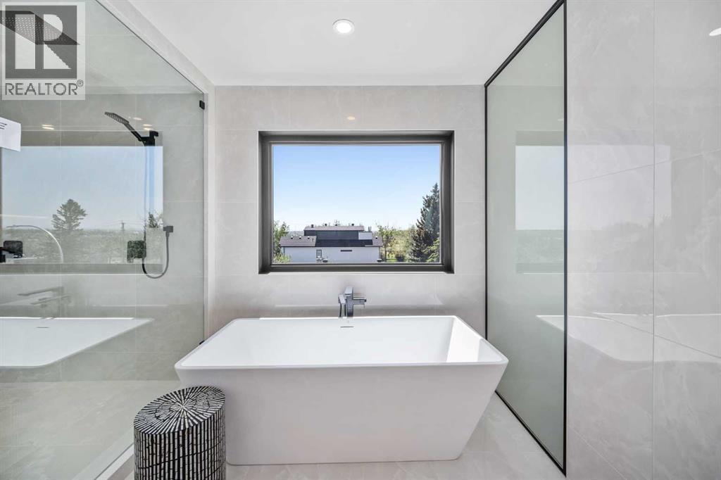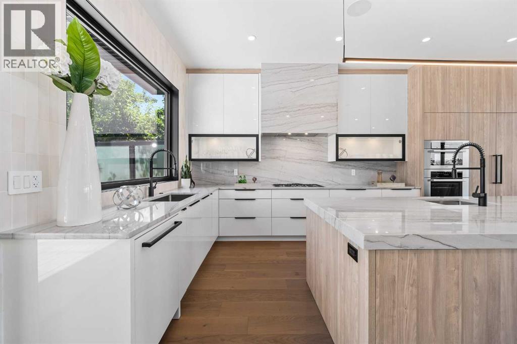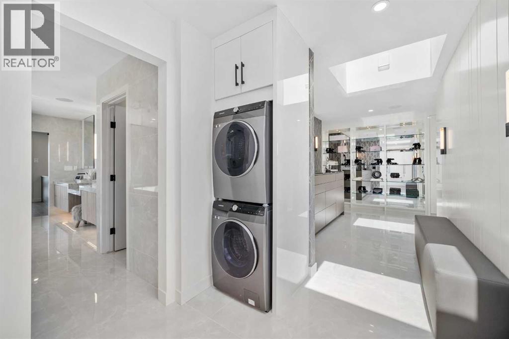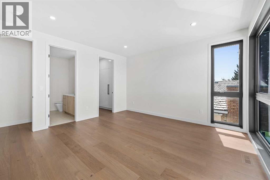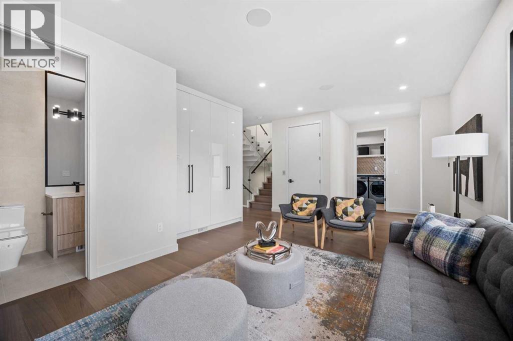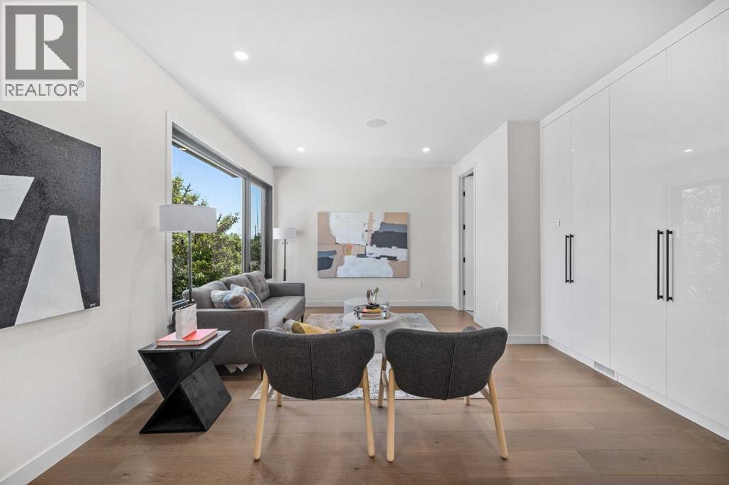An architectural masterpiece by Silverpoint Custom Homes and Paul Lavoie Interior Design. Perched on a spectacular lot overlooking Bridgeland, and offering breathtaking views of the City and Rocky Mountains. A 5,200-square-foot gem, which seamlessly blends Hollywood Hills vibes, in a meticulous and one of a kind design. A fantastic open floor plan with a separate formal living and dining rooms overlooking the city. Boasting a truly magnificent kitchen, featuring a 13ft waterfall island and all MIELE appliances. Hardwood floors weave throughout the four levels including the basement, creating a harmonious atmosphere of seamless design. The main level surprises you with a hidden coat closet, a spacious mudroom, and a private den overlooking a backyard oasis with a large deck, (hot-tub ready) Move effortlessly between levels via the elevator or a captivating floor to ceiling glass-walled staircase leading to three generous bedrooms and a master top suite, simply like no other. The second floor offers 3 spacious bedrooms with panoramic city views from 2 bedrooms, private balconies, and a separate family lounge with access to a full guest bath. A fabulous laundry room and linen closet complete this level, not to mention large picture windows offering fulll sunrise worthy east views. The third-floor PRINCIPAL BEDROOM is a showstopper with a HUGE BALCONY showcasing the best panoramic city and mountain vews. A separate lounge area with coffee bar, fridge and a built in TV LIFT separate the bedroom area. As you enter the ensuite, flooded with natural light, a magical SMARTGLASS window gives you the option of privacy, or to enjoy the fabulous city views while soaking in the tub. A luxurious dual vanity, dual spa shower area surrounded by glass, featuring heated floors and shower bench. The walk-in wardrobe suite is a one of a kind dream space, with built in's that will rival a designer shop. Large skylights, a huge window and your own washer/dryer, make this the perfect dres sing area. The lower level caters to the extended family and features a media area with full bar, gym, and a large bedroom. A full bath including a steam shower completes this level with all heated hardwood flooring. The outdoor spaces surrounding the house lets you indulge in extended year round outdoor living. A large front patio with a fire pit option, and seating lets you indulge in the west city and mountain views. The rear yard offers you a great dining space, and private relaxation areas with an optional hot tub, and a multi purpose sports area or green space. This home as expected includes all Smart home features, an elevator, extensive internal glass walls, AC, infloor heat, and an oversized garage with a full third car garage option which can be built prior to possession for the buyer at cost. An amazingly unique home with modern, yet classic design elements, encompassing every luxury option a discerning home owner would desire in their dream home. (id:55577)