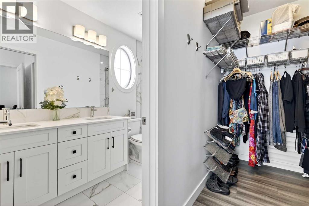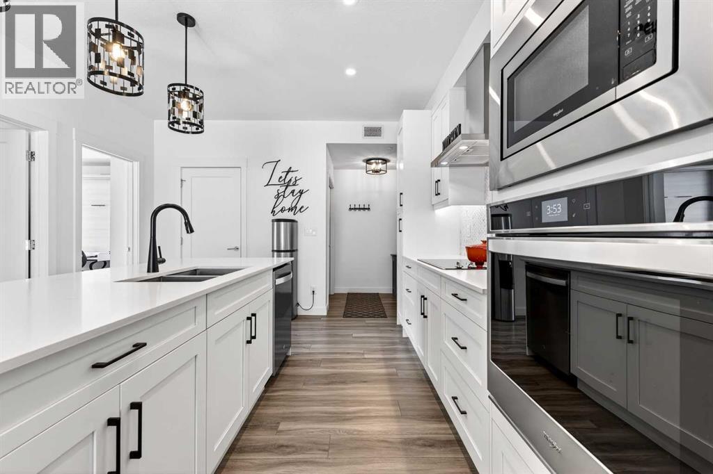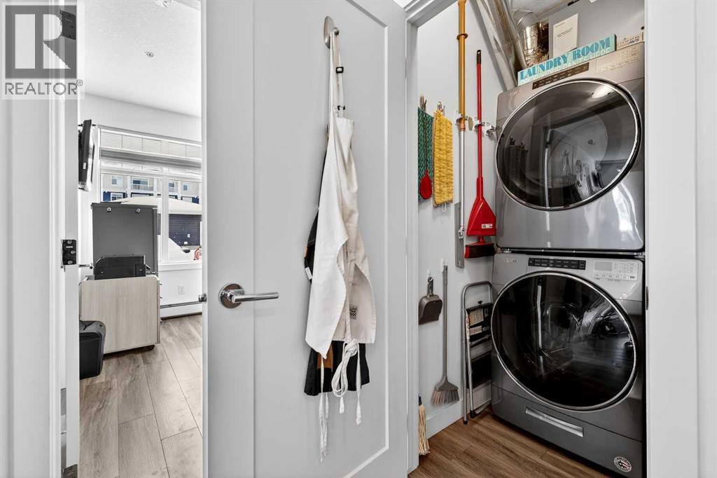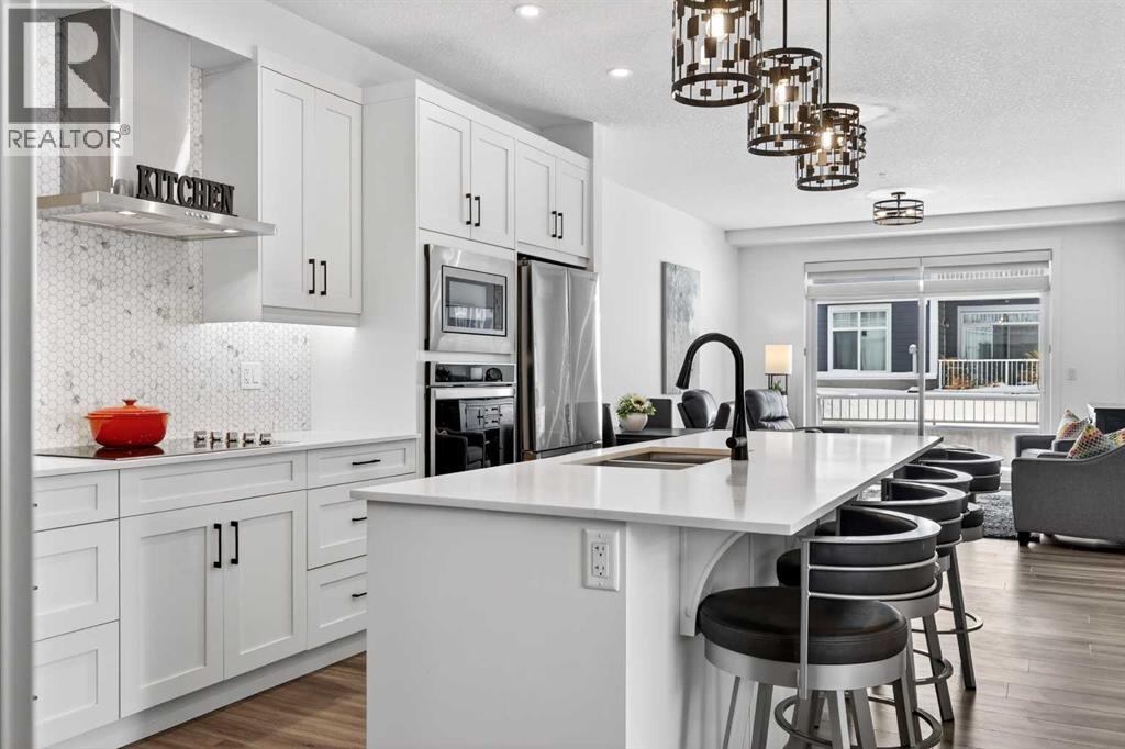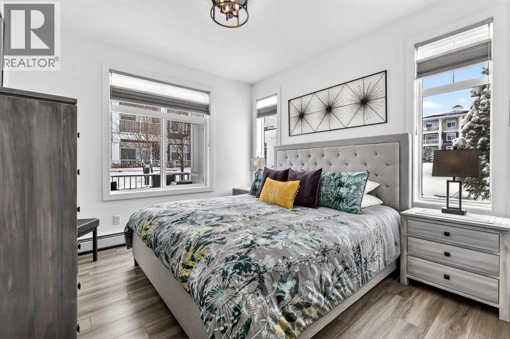 Auburn Rise is a newer built condo building built by Logel Homes in the amazing south-east Calgary community of Auburn Bay. Large size, upgrades and special features make this unit one of the better condos buys available right now. A titled tandem underground parking stall guarantees you can keep two vehicles safe and warm. From there you can either take the very short climb up one flight of stairs directly adjacent to your stall right to this ground floor unit or take the buildings elevator as intended. Situated on the south west corner of the 400 building this home gets plenty of natural light and warmth yet keeps cool inside in the summer with air conditioning already in place. The 958 square foot Atwood plan is well laid out with 9-foot ceilings, an attractive modern color scheme and numerous upgrades at the time of building including LVP flooring and tile throughout the home (no carpets), plumbing fixtures, closet organizers, pot lights, 41-inch upper cabinets, cabinet drawers, upgraded appliances, dual ensuite sinks, pot lights and more totaling over $25,000. More was done after building including all light fixtures and window coverings. The lichen is anchored with a large quartz island which seats 4 comfortably. There is a 25-foot deck for enjoying the outdoors and a newer building which you will be proud to call home. Ample visitor parking right outside this building and a center green space add to the aesthetics of this desirable complex. There are many grocery stores, restaurants and other shopping amenities right in the area within very short walking distance. The 302 BRT bus line stops right outside, biding the time until the green line LRT makes its way down here. You also get access to enjoy the private Auburn Bay Lake year-round recreation area and numerous pathways and green spaces in the community. All this and easy access to both Deerfoot and Stoney Trail to get you where you need to go. Come and see for yourself today! (id:55577)