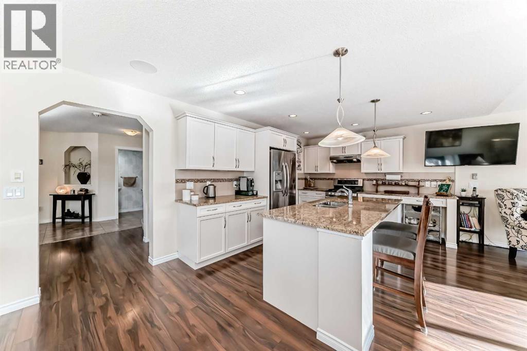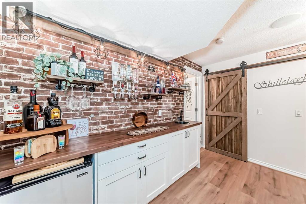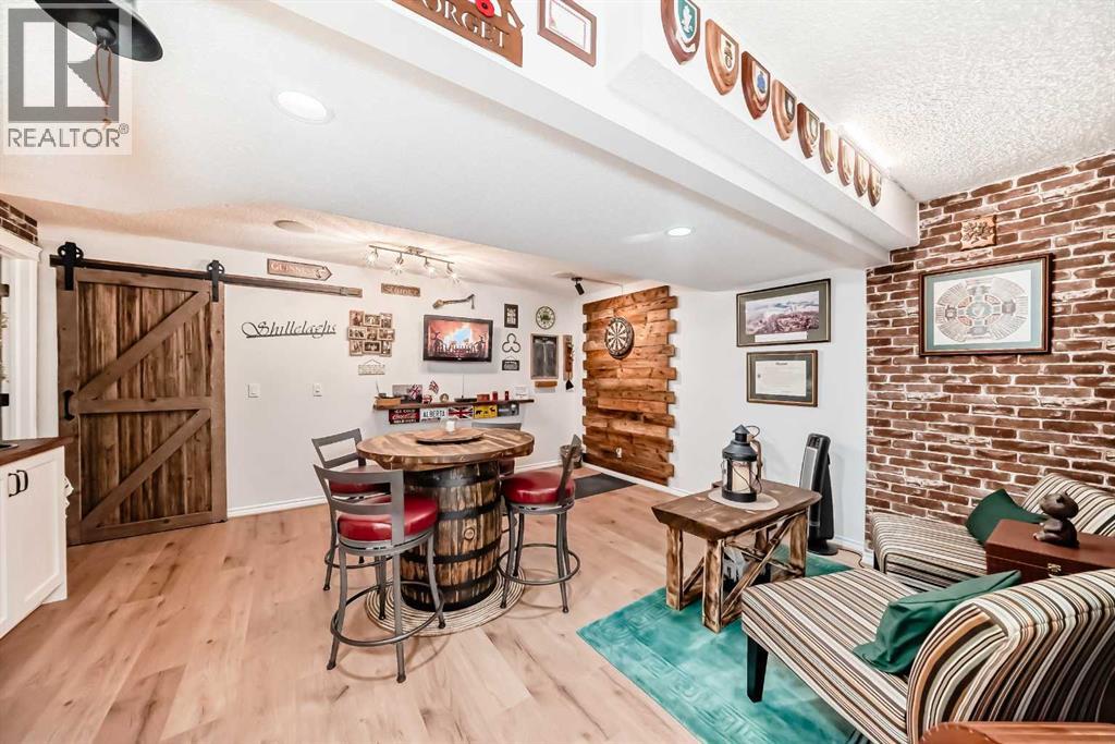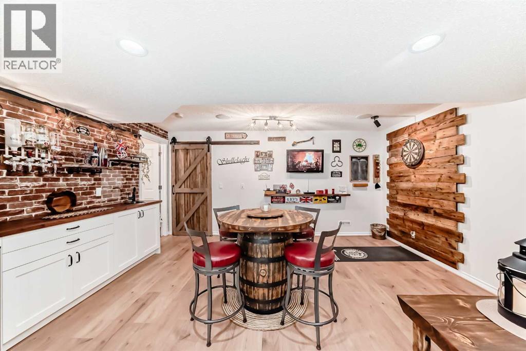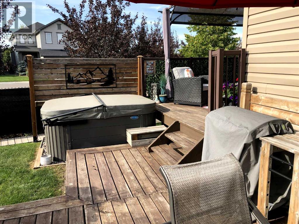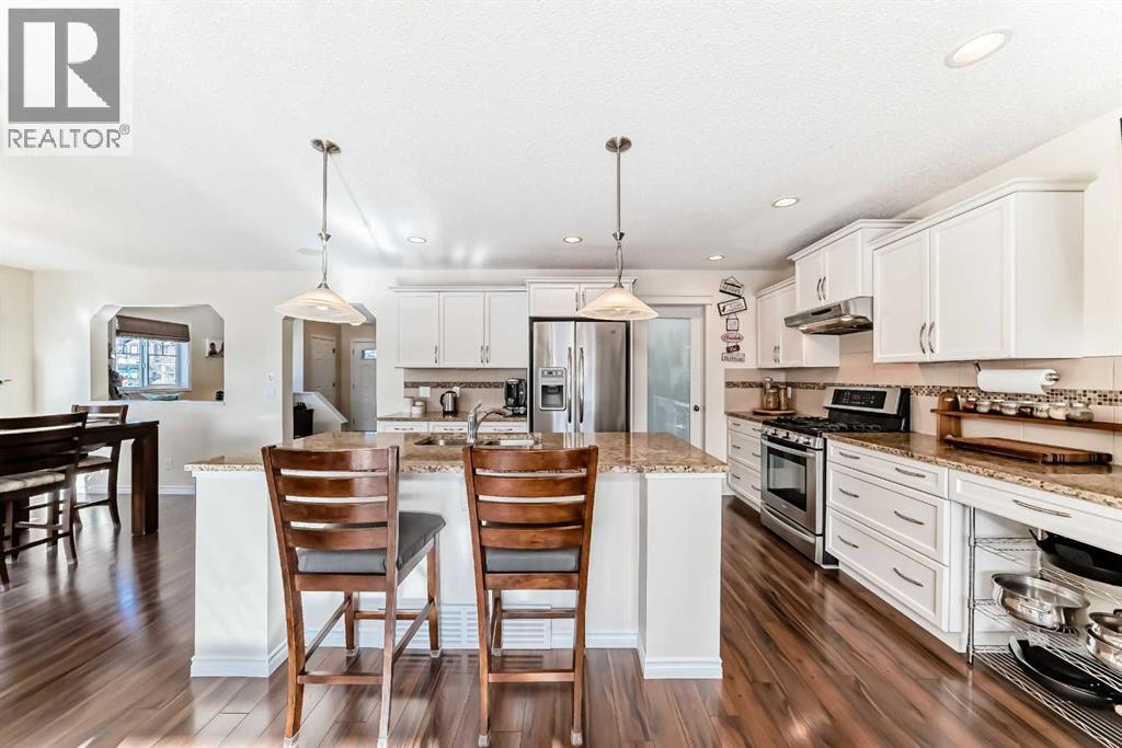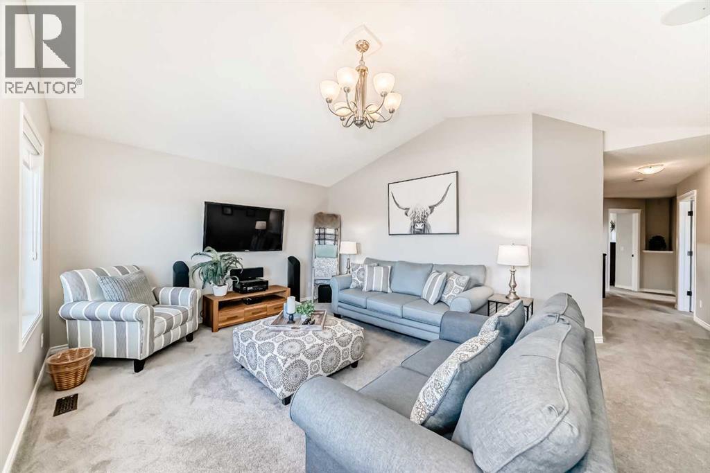 Welcome to this 4 bdrm, 3.5 bath, fully finished, immaculate one-owner home, built by Mckee Homes, in the beautiful, family-friendly, sought-after community of Ravenswood Airdrie. Situated with city greenspace to the north (no shovelling), walking paths behind, with a large sun-catching south/west-facing yard and a 2-tiered deck. With over 2,900 sq ft of finished living space and the flex/poss 5th bdrm in the basement, there is room here for a growing family. Walking in, you will love the open concept, which includes a 2-piece bath to the left, a door to the mudroom that connects to the laundry room, pantry and kitchen, and the garage entrance. Ahead is an office space, then into the open kitchen, dining and living room area. Large south/west windows fill the rooms with an abundance of natural light. The kitchen is for someone who loves to cook and entertain with modern white cabinetry, granite counters with ample counter space and an island. SS appliances, a 5-burner gas stove, a DBL Door refrigerator w water and ice maker and a large pantry make this plan ideal. The living room is vaulted and has a cozy gas fireplace with a fan and a stone front, and the dining area will fit a large table for family meals. Then through the sliding patio doors onto an extra-large 2-tiered deck w a hot tub, paved patio area with a firepit, privacy screen, extra power outlets, and a huge backyard for gardening and entertaining. Upstairs is a vaulted, bright bonus room, perfect for an extra TV room or play area for the kids. 3 bedrooms and 2 bathrooms. All the rooms are a good size, with the primary large enough to fit not only a king-size bed but also all your large bedroom furniture and your extensive wardrobe in the walk-in closet. The ensuite is very spacious with dual vanities on a long counter, a large separateshower and a soaker tub with a separate shower head. Downstairs, you will find a 4 th bdrm without a closet, another flex room with two windows that could easily be turn ed into a 5 th bdrm. As well as another bathroom, plus a fabulous bar and entertainment room, with a natural theme for relaxing. All TVs and TV mounts throughout the house stay, as do the hot tub, shed, bar fridge, SONOS soundsystem, and built-in speakers throughout the house, including both back decks, the lower deck is also fitted with low level lighting. New roof shingles in 2021, Gas hot water tank 2020, carpets upstairs 2024, built-in Telus security system that the buyer can take over, the seller is paying $25 + tax a month. The smoke detector is also linked to Telus security. This home is a one-owner home and is immaculate and feels like new inside. You will not be disappointed. It's got quick access to parks, pathways, nearby schools, and shopping at the Yankee Valley Crossing Shopping Plaza, the Kingsview Plaza Sierra Springs Plaza. Access the rest of the city and Calgary through several nearby major roadways, including Deerfoot Trail, Yankee Valley Blvd. Downtown Calgary is a 23 min drive. (id:55577)