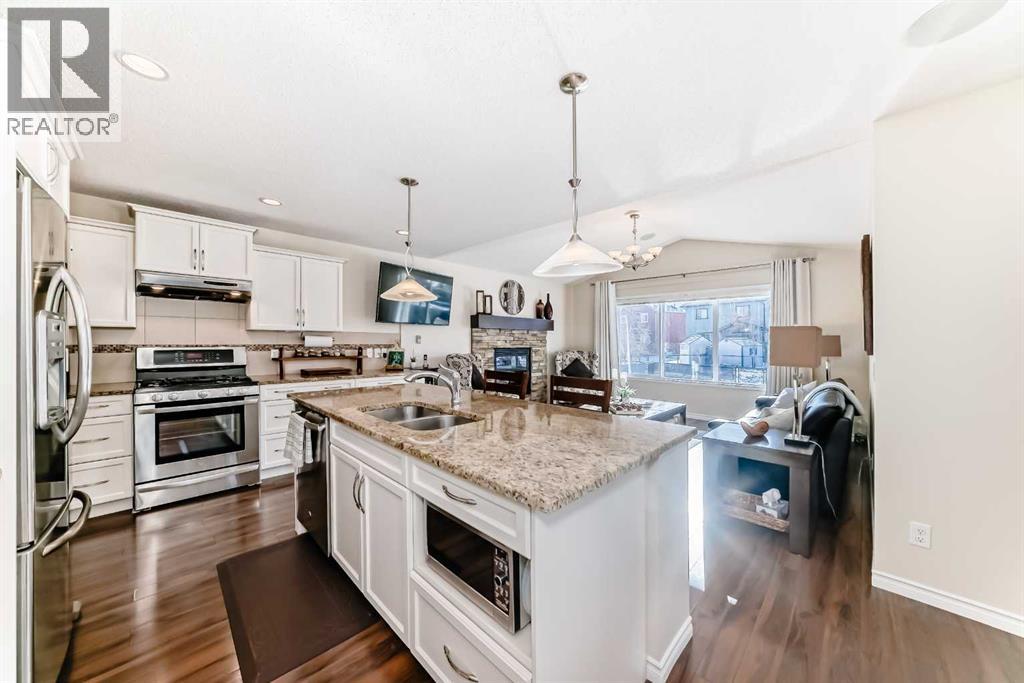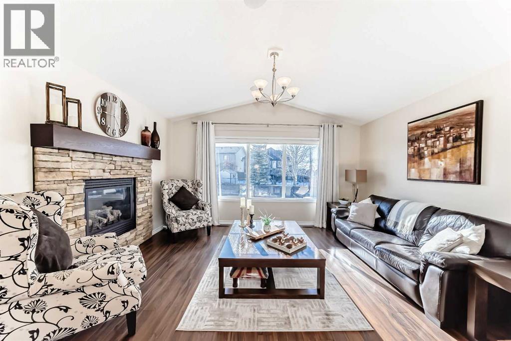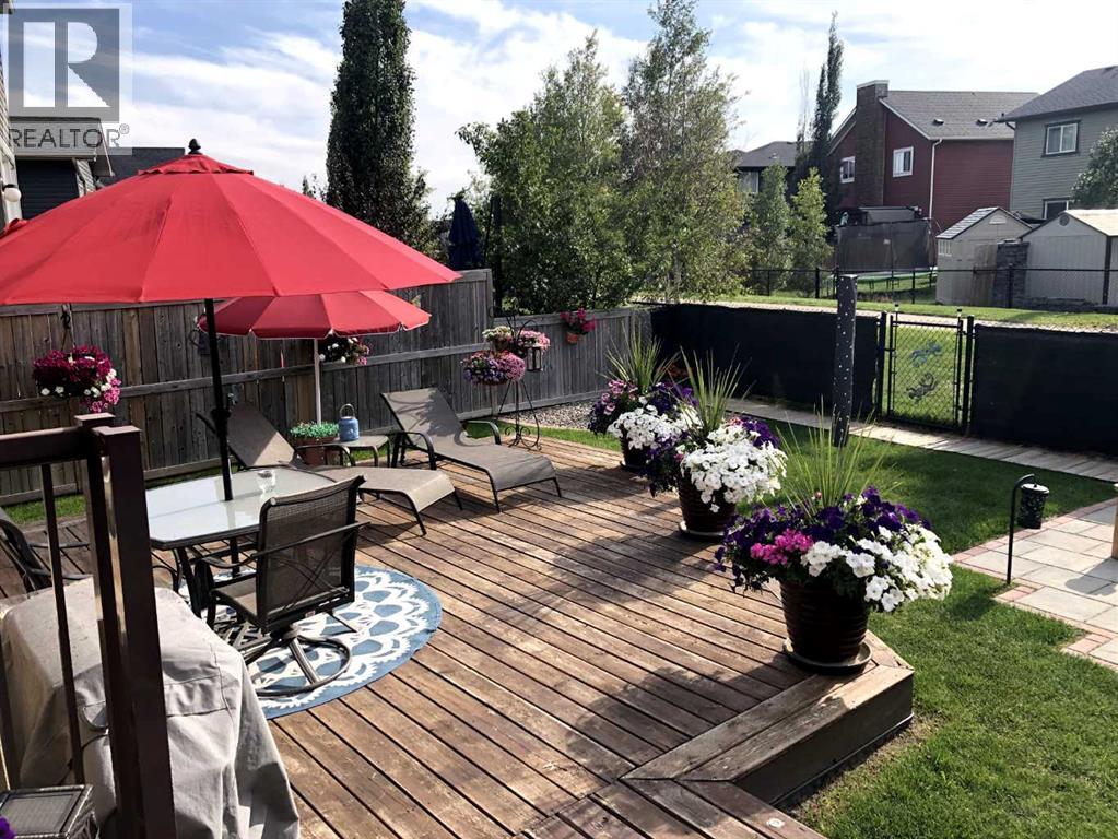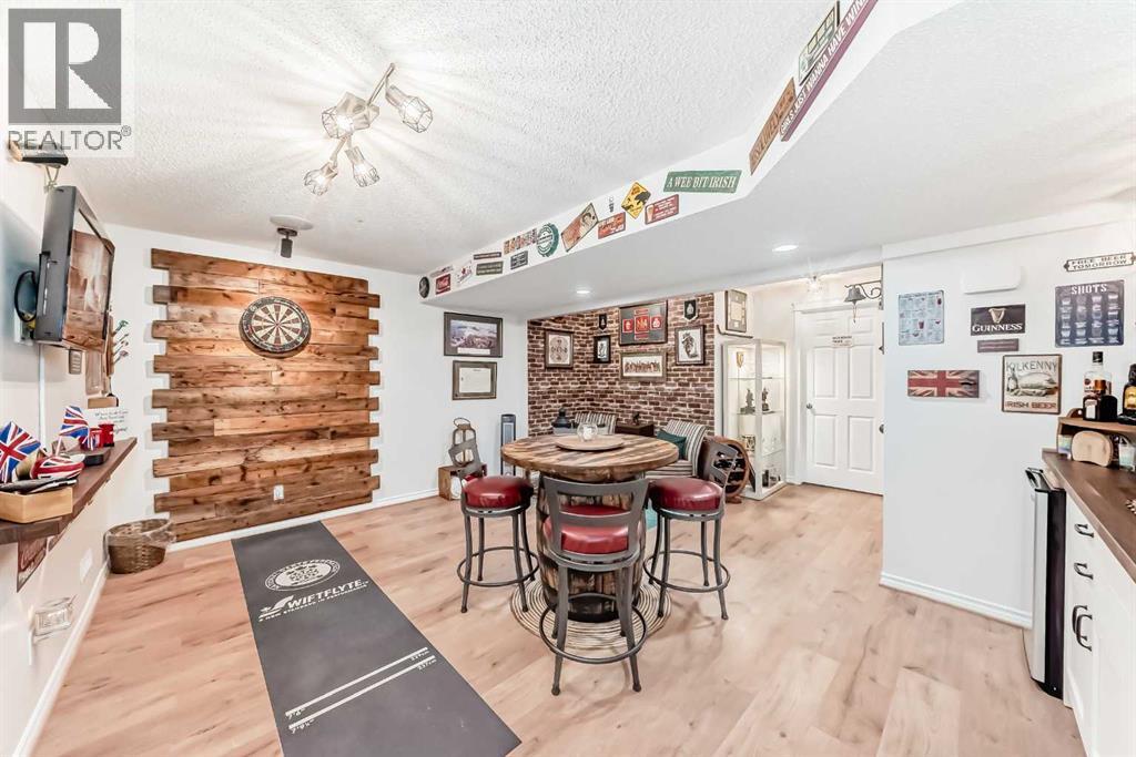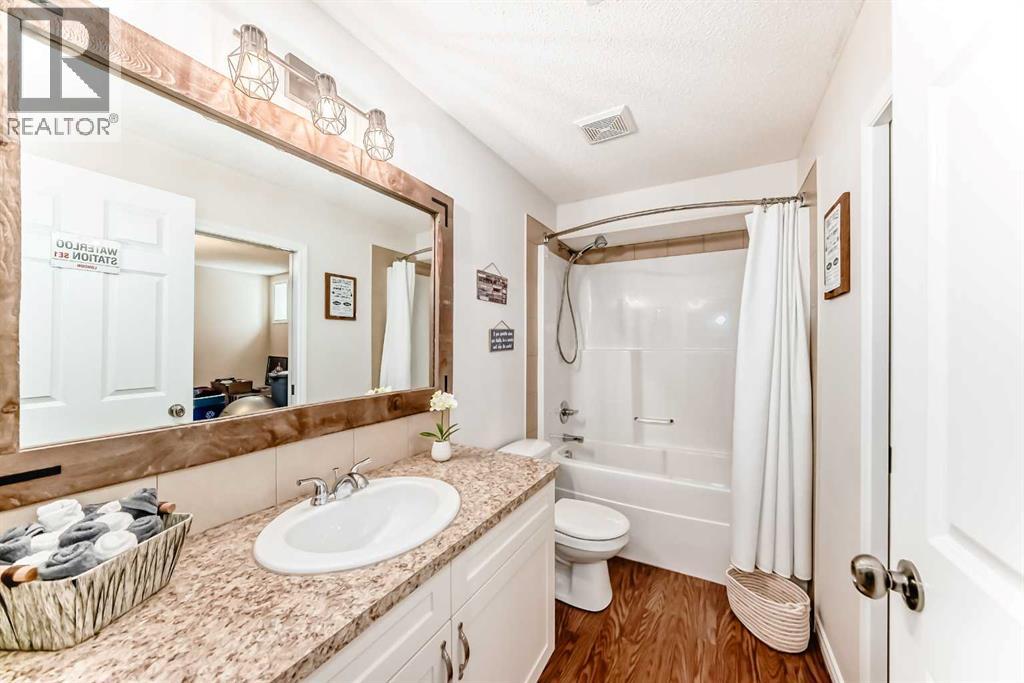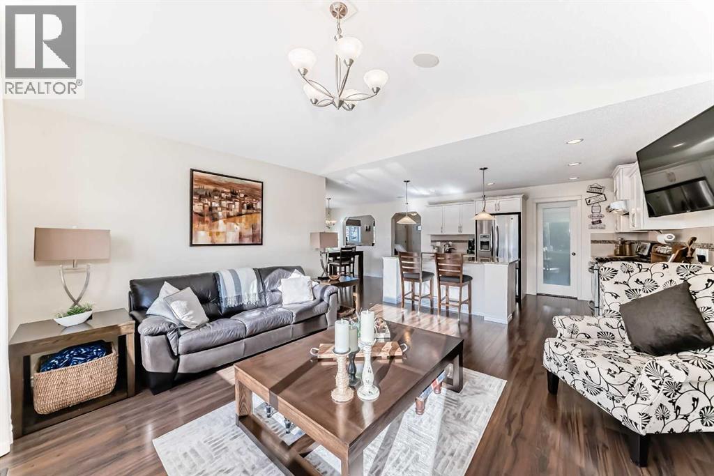 Welcome to this 4 bdrm, 3.5 bath, fully finished, immaculate one-owner home, built by Mckee Homes, in the beautiful, family-friendly, sought-after community of Ravenswood Airdrie. Situated with city greenspace to the north (no shovelling), walking paths behind, with a large sun-catching south/west-facing yard and a 2-tiered deck. With over 2,900 sq ft of finished living space and the flex/poss 5th bdrm in the basement, there is room here for a growing family. Walking in, you will love the open concept, which includes a 2-piece bath to the left, a door to the mudroom that connects to the laundry room, pantry and kitchen, and the garage entrance. Ahead is an office space, then into the open kitchen, dining and living room area. Large south/west windows fill the rooms with an abundance of natural light. The kitchen is for someone who loves to cook and entertain with modern white cabinetry, granite counters with ample counter space and an island. SS appliances, a 5-burner gas stove, a DBL Door refrigerator w water and ice maker and a large pantry make this plan ideal. The living room is vaulted and has a cozy gas fireplace with a fan and a stone front, and the dining area will fit a large table for family meals. Then through the sliding patio doors onto an extra-large 2-tiered deck w a hot tub, paved patio area with a firepit, privacy screen, extra power outlets, and a huge backyard for gardening and entertaining. Upstairs is a vaulted, bright bonus room, perfect for an extra TV room or play area for the kids. 3 bedrooms and 2 bathrooms. All the rooms are a good size, with the primary large enough to fit not only a king-size bed but also all your large bedroom furniture and your extensive wardrobe in the walk-in closet. The ensuite is very spacious with dual vanities on a long counter, a large separateshower and a soaker tub with a separate shower head. Downstairs, you will find a 4 th bdrm without a closet, another flex room with two windows that could easily be turn ed into a 5 th bdrm. As well as another bathroom, plus a fabulous bar and entertainment room, with a natural theme for relaxing. All TVs and TV mounts throughout the house stay, as do the hot tub, shed, bar fridge, SONOS soundsystem, and built-in speakers throughout the house, including both back decks, the lower deck is also fitted with low level lighting. New roof shingles in 2021, Gas hot water tank 2020, carpets upstairs 2024, built-in Telus security system that the buyer can take over, the seller is paying $25 + tax a month. The smoke detector is also linked to Telus security. This home is a one-owner home and is immaculate and feels like new inside. You will not be disappointed. It's got quick access to parks, pathways, nearby schools, and shopping at the Yankee Valley Crossing Shopping Plaza, the Kingsview Plaza Sierra Springs Plaza. Access the rest of the city and Calgary through several nearby major roadways, including Deerfoot Trail, Yankee Valley Blvd. Downtown Calgary is a 23 min drive. (id:55577)