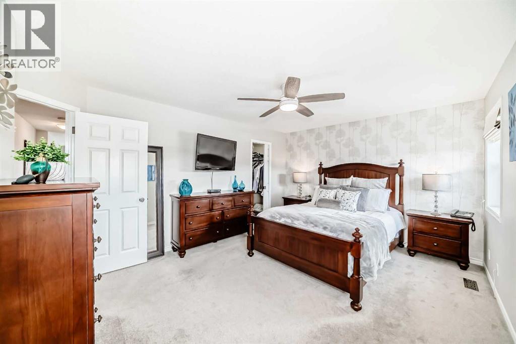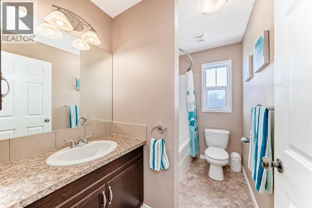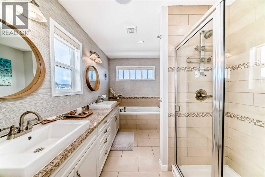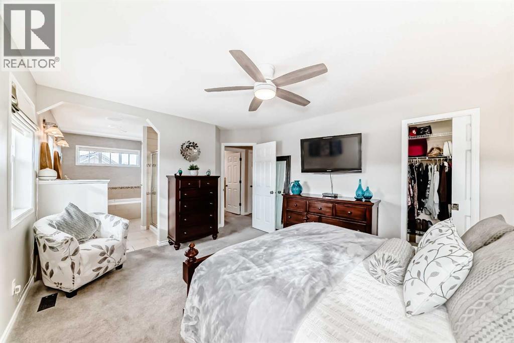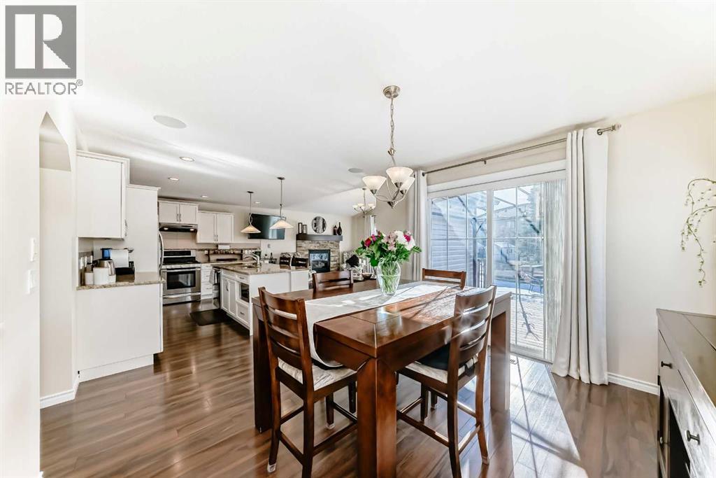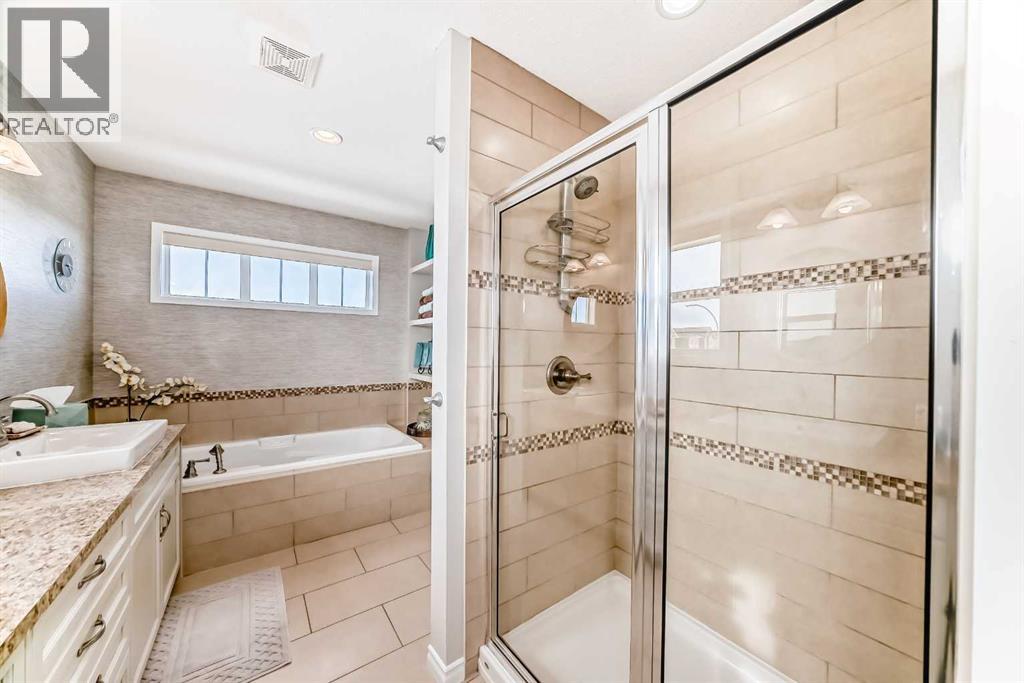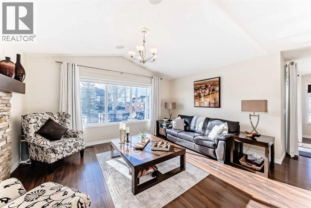 Welcome to this 4 bdrm, 3.5 bath, fully finished, immaculate one-owner home, built by Mckee Homes, in the beautiful, family-friendly, sought-after community of Ravenswood Airdrie. Situated with city greenspace to the north (no shovelling), walking paths behind, with a large sun-catching south/west-facing yard and a 2-tiered deck. With over 2,900 sq ft of finished living space and the flex/poss 5th bdrm in the basement, there is room here for a growing family. Walking in, you will love the open concept, which includes a 2-piece bath to the left, a door to the mudroom that connects to the laundry room, pantry and kitchen, and the garage entrance. Ahead is an office space, then into the open kitchen, dining and living room area. Large south/west windows fill the rooms with an abundance of natural light. The kitchen is for someone who loves to cook and entertain with modern white cabinetry, granite counters with ample counter space and an island. SS appliances, a 5-burner gas stove, a DBL Door refrigerator w water and ice maker and a large pantry make this plan ideal. The living room is vaulted and has a cozy gas fireplace with a fan and a stone front, and the dining area will fit a large table for family meals. Then through the sliding patio doors onto an extra-large 2-tiered deck w a hot tub, paved patio area with a firepit, privacy screen, extra power outlets, and a huge backyard for gardening and entertaining. Upstairs is a vaulted, bright bonus room, perfect for an extra TV room or play area for the kids. 3 bedrooms and 2 bathrooms. All the rooms are a good size, with the primary large enough to fit not only a king-size bed but also all your large bedroom furniture and your extensive wardrobe in the walk-in closet. The ensuite is very spacious with dual vanities on a long counter, a large separateshower and a soaker tub with a separate shower head. Downstairs, you will find a 4 th bdrm without a closet, another flex room with two windows that could easily be turn ed into a 5 th bdrm. As well as another bathroom, plus a fabulous bar and entertainment room, with a natural theme for relaxing. All TVs and TV mounts throughout the house stay, as do the hot tub, shed, bar fridge, SONOS soundsystem, and built-in speakers throughout the house, including both back decks, the lower deck is also fitted with low level lighting. New roof shingles in 2021, Gas hot water tank 2020, carpets upstairs 2024, built-in Telus security system that the buyer can take over, the seller is paying $25 + tax a month. The smoke detector is also linked to Telus security. This home is a one-owner home and is immaculate and feels like new inside. You will not be disappointed. It's got quick access to parks, pathways, nearby schools, and shopping at the Yankee Valley Crossing Shopping Plaza, the Kingsview Plaza Sierra Springs Plaza. Access the rest of the city and Calgary through several nearby major roadways, including Deerfoot Trail, Yankee Valley Blvd. Downtown Calgary is a 23 min drive. (id:55577)