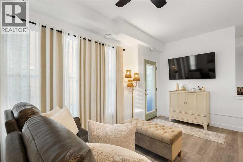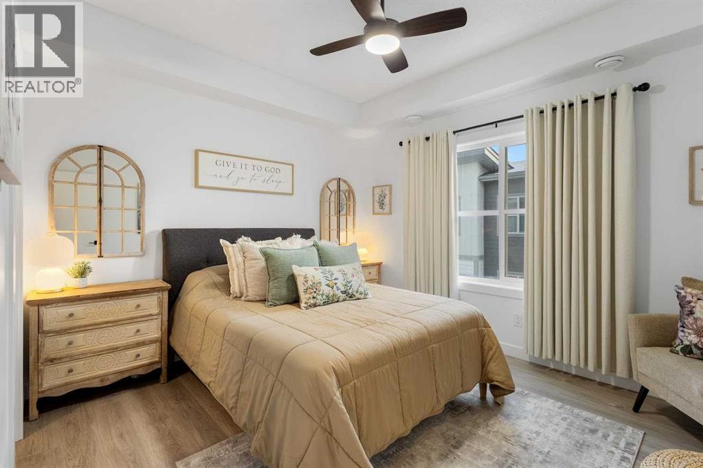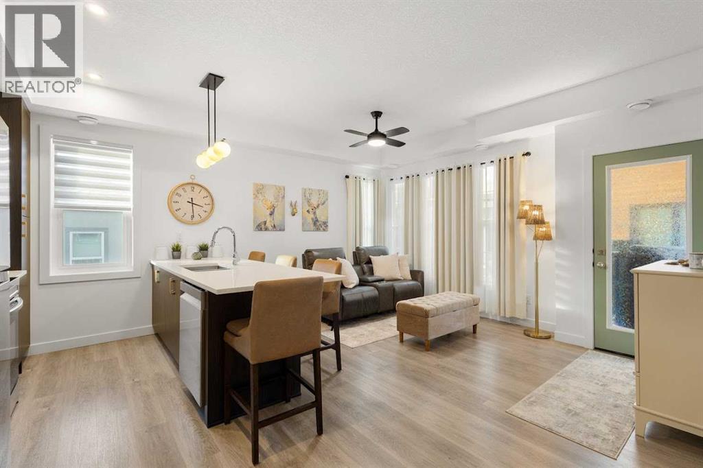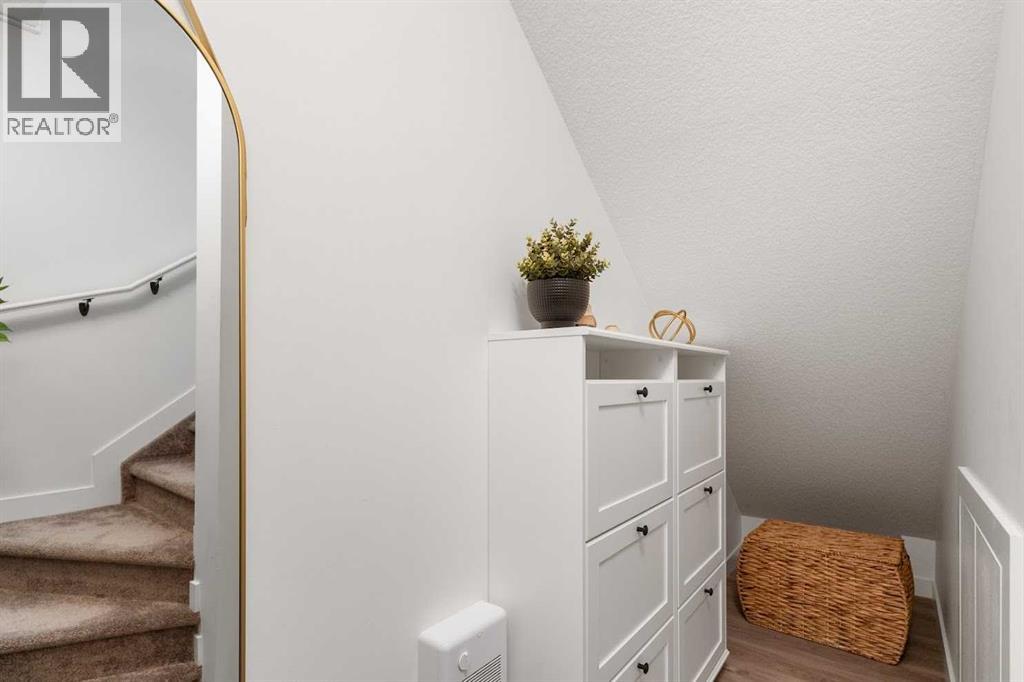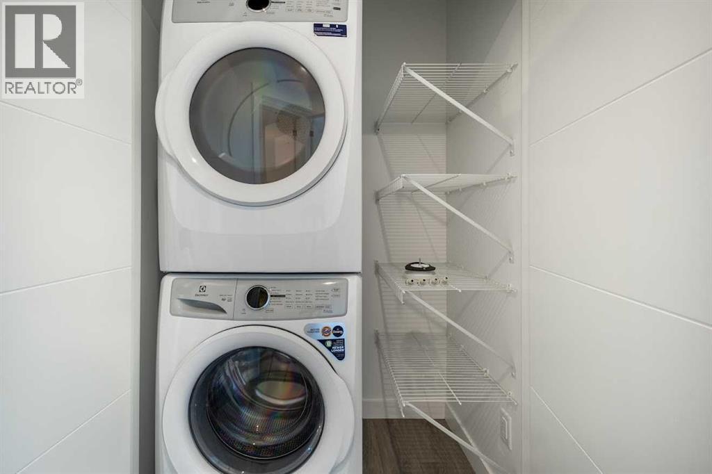 Contemporary European-style townhome with 2 beds, 2 baths, a spacious balcony on the TOP floor & a tree-lined view. From the moment you enter, the home showcases a designer show-home feel. The open-concept 2-storey stacked townhouse features 9' ceilings, double-pane windows, fully installed CENTRAL AIR-CONDITIONING, a HIGH EFFICIENCY FURNACE, humidifier, water tank, water-proof durable LVP flooring throughout the kitchen, living, dining area, bathrooms, & bedrooms. The European-inspired kitchen is finished with Quartz countertops, High-quality cabinets, Soft-close doors, Backsplashes, new UPGRADED SAMSUNG stainless-steel appliances, microwave hood fan, and front-load washer & dryer. The newly completed Elkwood Townhouse (Phase 2) offers affordable luxury & convenient living, close to Aspen Landing Shopping. Bordered by a natural environmental reserve & walking trails that connect throughout the community, it is a perfect location for active living & relaxation. Built by Slokker Homes, a quality builder since 1935, these homes offer the best value in Aspen and Springbank Hill. (id:55577)