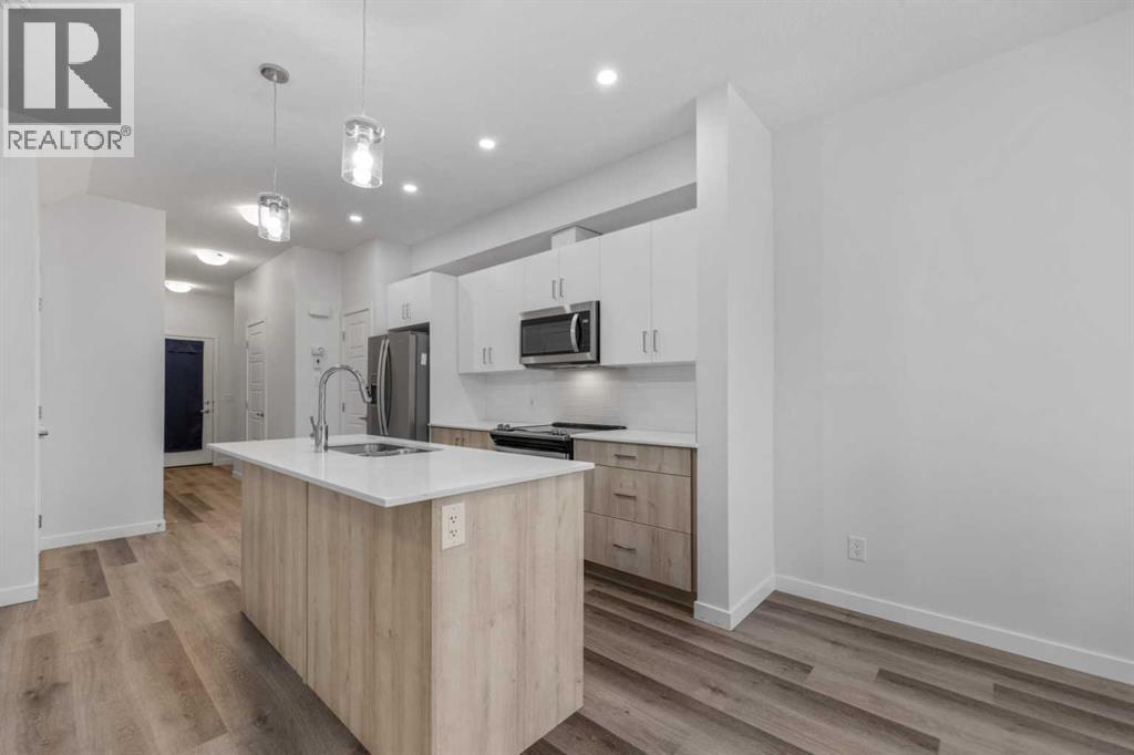 Welcome to Unit 137 in Red Embers Point, perfectly situated in the heart of Redstone. 3 BED | 2.5 BATH | FRONT ATTACHED GARAGE | PREMIUM FINISHES | LOW CONDO FEES | GREAT REDSTONE LOCATIONThis impressive, modern 2-storey townhouse combines style and functionality throughout. It offers 3 well-sized bedrooms, 2.5 bathrooms, a single attached garage with a driveway, and a bright, open-concept main floor accented by durable vinyl flooring and contemporary design elements. The kitchen stands out with its quartz countertops, stylish two-tone cabinetry, stainless steel appliances, and a central island with seating—ideal for casual meals or entertaining. On the upper level, you’ll find a comfortable primary bedroom with a 4-piece ensuite, two additional bedrooms, another full bathroom, and a convenient laundry space.The unfinished basement provides a blank canvas for future development, while the spacious back deck is perfect for outdoor enjoyment. Located in a welcoming, family-oriented community close to parks, schools, shopping, and major routes, this home offers quick access to CrossIron Mills, Costco, and the airport. Book your private showing today! (id:55577)