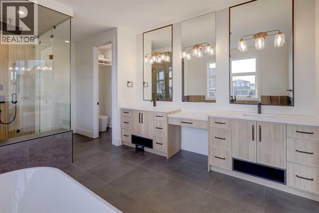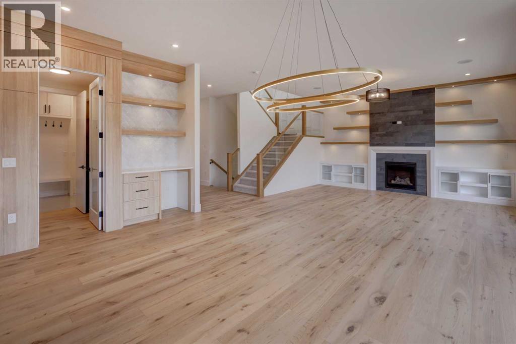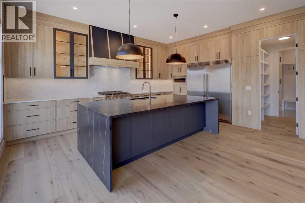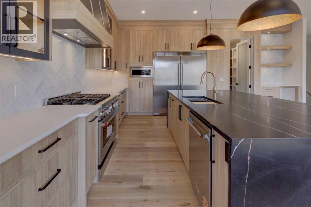 Welcome to this stunning home located in the highly sought-after community of Coopers Crossing! Boasting exceptional curb appeal and backing onto beautiful green space, this home is ideally situated close to schools with convenient access to major roads.The main floor offers 10’ ceiling, engineered hardwood flooring, a spacious and inviting entryway, an office with glass features and custom finishes, and a large living room featuring a cozy gas fireplace and built-in shelving. The elegant dining area opens onto a generous sized deck with bbq gas line, perfect for entertaining. The gourmet kitchen is a chefs dream, complete with a waterfall island, built-in stainless steel appliances, quartz countertops, and a walk-through pantry. You will also find a large mudroom and a convenient powder room on this level.Upstairs, you are welcomed by a cozy loft area with custom built book shelf and a thoughtfully designed laundry room with a sink and lots of storage space. The luxurious primary suite includes a spacious walk-in closet and a spa-inspired ensuite with a custom walk-in steam shower, in floor heating, dual vanities and a freestanding tub. There are three additional generously sized bedrooms, each with custom-built closet shelving. One bedroom features its own ensuite, while a well-appointed main bathroom serves the other two.The fully finished basement adds even more living space, offering an additional bedroom, full bathroom, and a large recreation room complete with a wet bar—perfect for hosting guests.Throughout the home, you will find elegant lighting, custom woodwork and large windows that flood the space with natural light. The oversized triple tandem garage is insulated, finished to paint grade with texture ceiling and features high ceilings designed to accommodate a car lift, offering plenty of room for vehicles and storage.This exceptional home is truly a must-see! (id:55577)