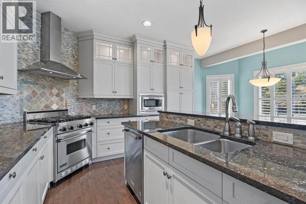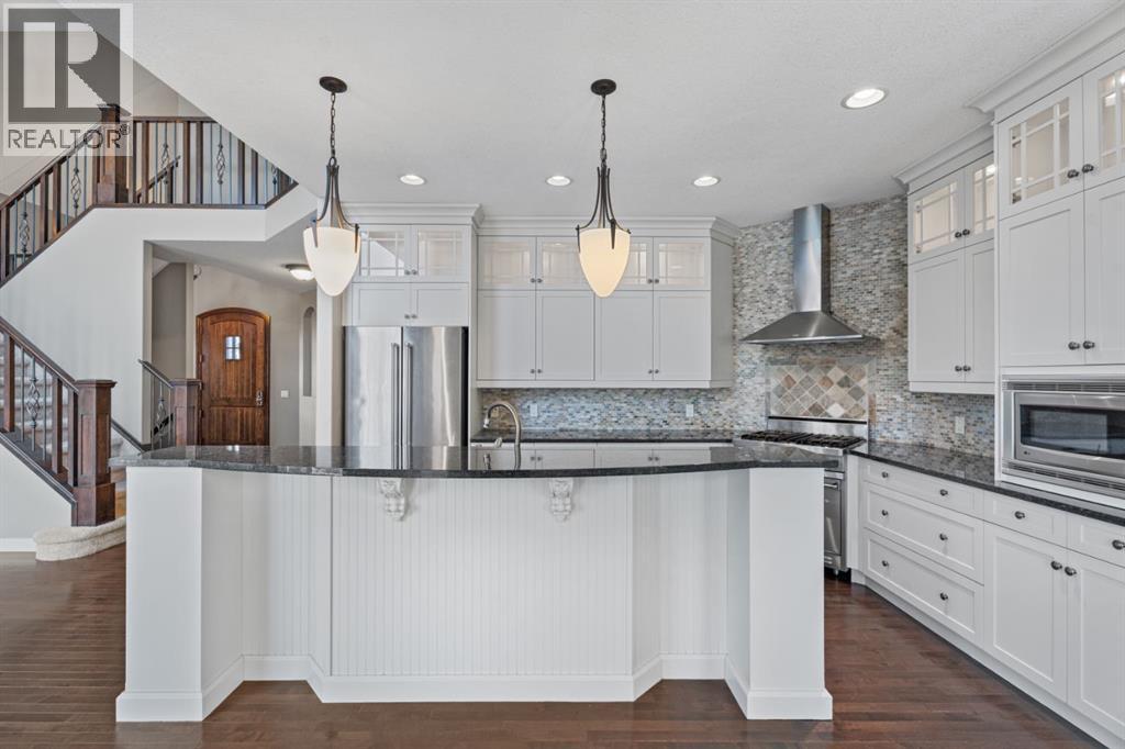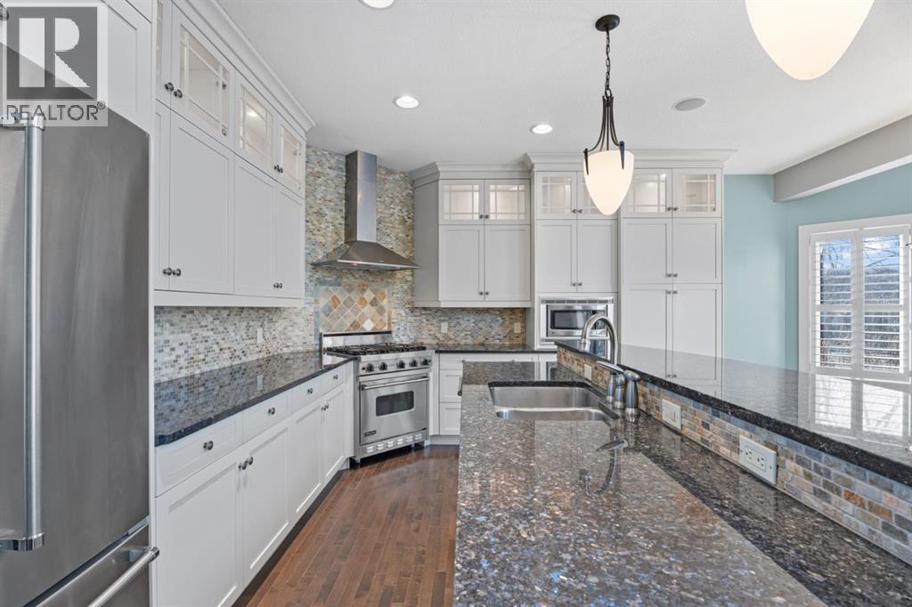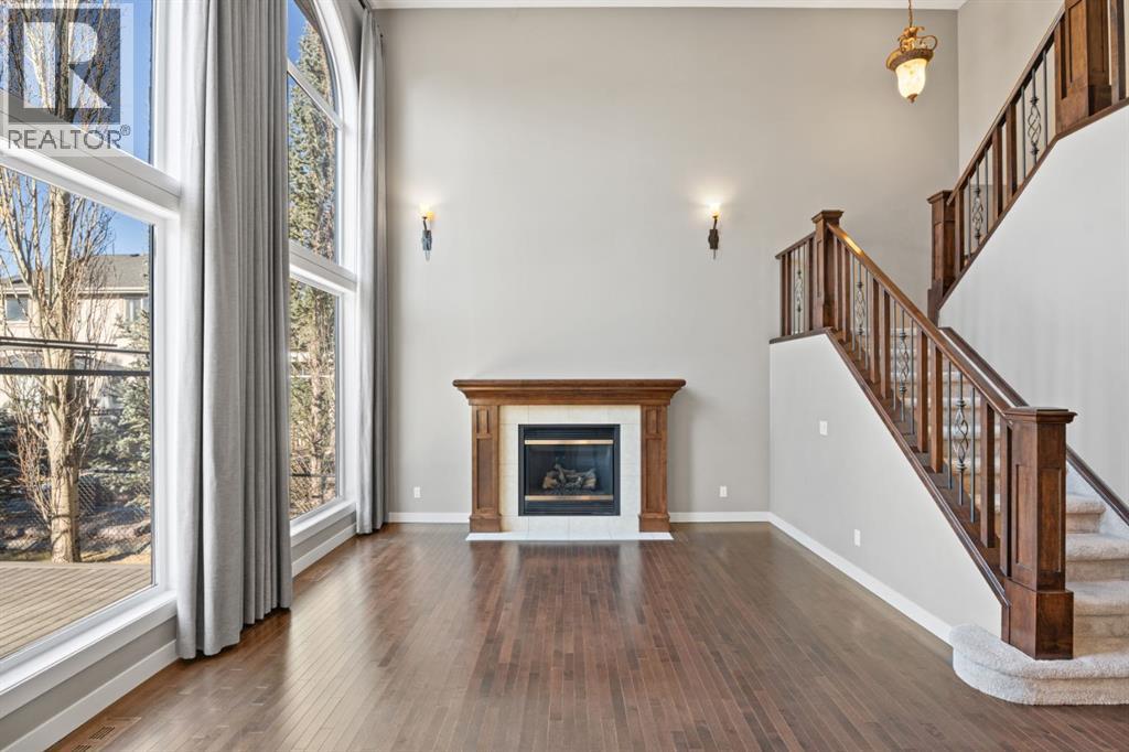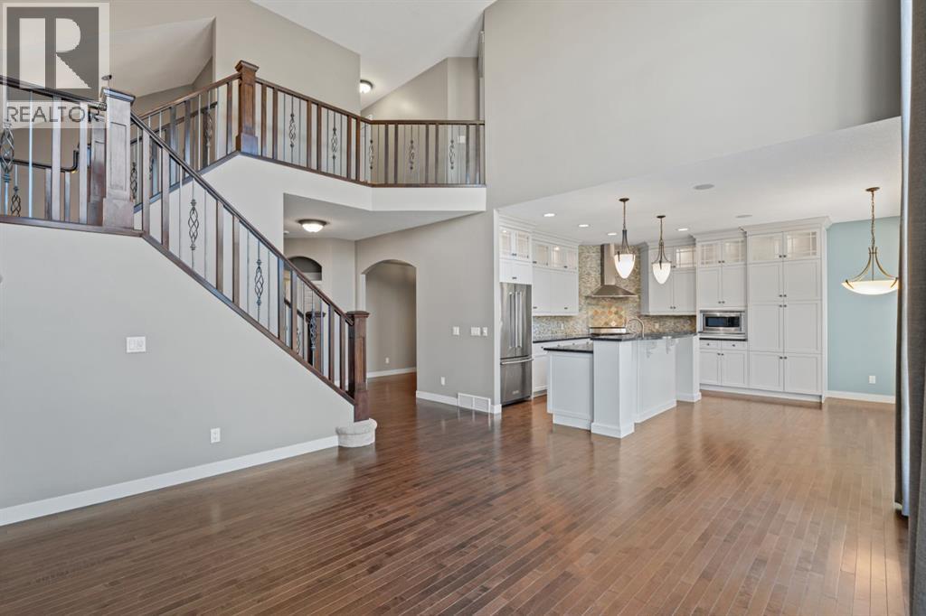 Cancelled Open House Sunday. Welcome to 15 Cranleigh Way SE - Premier Cranston Ridge Living - Original owners, first time on market. This meticulously maintained estate captures everything that makes Cranston one of Calgary's most desirable communities. From arrival, curb appeal commands attention with its distinctive stone archway entrance, substantial pillars, and grand custom wooden front door handcrafted for this home. Mature evergreens and ornamental trees anchor the landscaping, while aggregate stone driveway and walkway lead to this elegant entrance. Step inside to a breathtaking vaulted foyer where soaring ceilings and rich hardwood flowing throughout the main level create impressive welcome. Continue into the formal dining room showcasing elegant coffered ceiling insets and custom statement chandelier. Upgraded lighting fixtures in most rooms, plantation shutters on most windows, and custom millwork elevate this home beyond standard builds, adding character throughout. The living room opens with stunning 18-foot ceilings and open to below design with elegant wrought iron railings. The floor-to-ceiling feature wall commands attention, anchored by gas fireplace. Oversized picturesque windows frame incredible greenspace views while flooding the space with natural light. The chef's kitchen flows seamlessly, featuring expansive granite countertops, substantial center island seating four, gas stove, premium stainless appliances, floor-to-ceiling cabinetry, and pantry with custom drawers. Custom pendant lighting highlights the island. Kitchen opens to eating area with west-facing windows overlooking the private backyard. Main floor offers laundry room and two-piece bathroom. Step outside to your west-facing private backyard with mature trees and foliage, perfect for entertaining. Composite deck features pergola, while mature landscaping balances beauty and low maintenance. Backing onto greenspace and pathway system - steps down the path to elevated positioning wit h unobstructed views of the ridge and valley that make this Cranston Ridge location desirable. Bow River paths and Fish Creek Park access moments away. Upstairs with open to above views of foyer and living room, the master suite offers true retreat. Luxurious five-piece ensuite features soaker tub, separate shower with glass enclosure, granite vanity, and walk-in closet with shelving. Two additional bedrooms share four-piece bathroom. Fully finished basement extends living space with fourth bedroom, full bathroom, and recreation room perfect for media, gym, or entertaining. Premium features include central air, on-demand hot water (2021), wired for sound with speakers, roughed in 240V for hot tub, drywalled insulated garage with gas heater and attic storage. New shingles (2022) and carpet (2021). Minutes to schools, shopping, highway access. Virtual tour in the links, book your exclusive showing today! (id:55577)