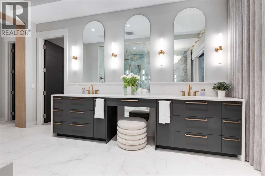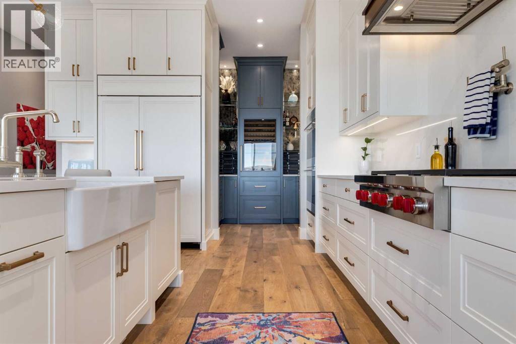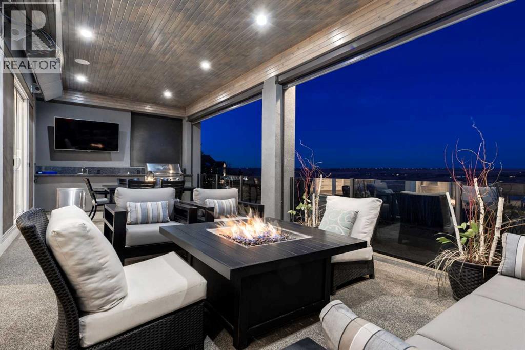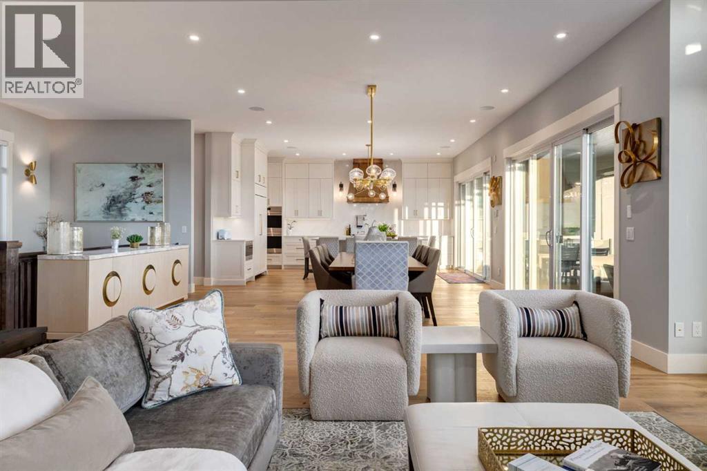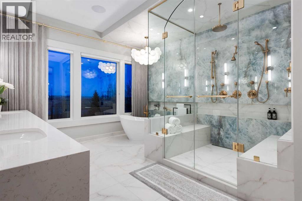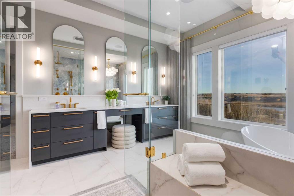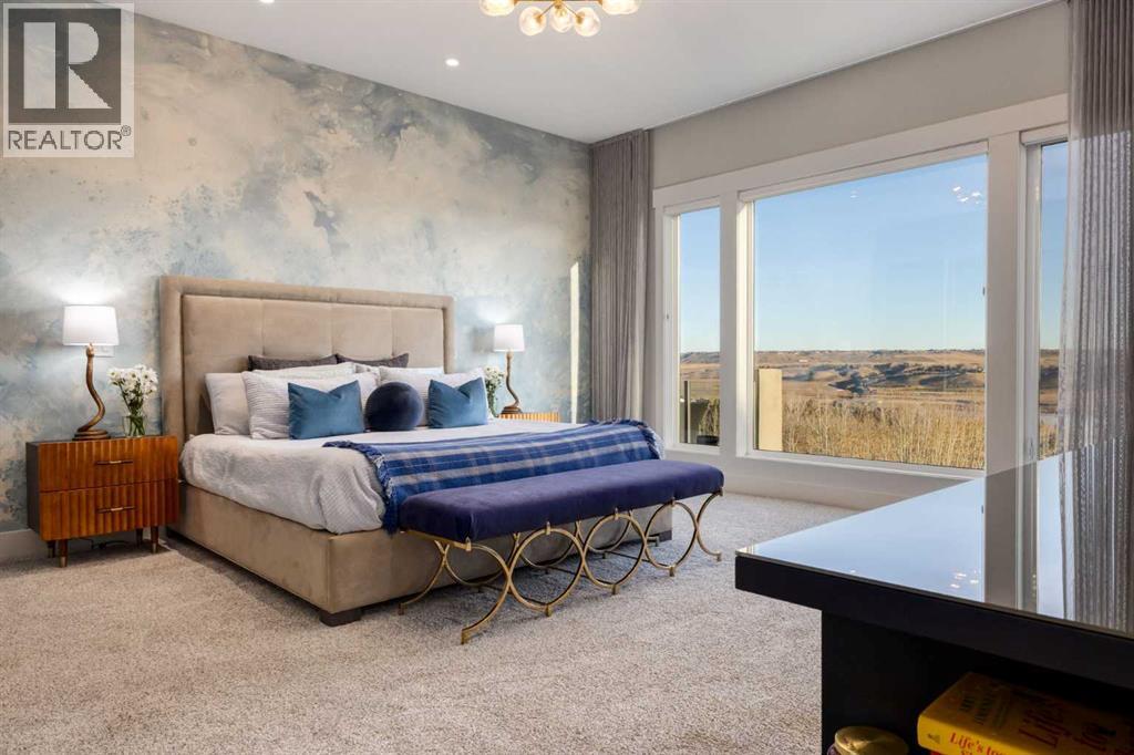 Set high on the escarpment in North Springbank is the most beautiful bungalow with unobstructed views of the city skyline, Bow River, the Springbank Links golf course, the mountains to the West and the breathtaking valley set below. Extensively renovated in 2022 and 2024, this property features over 2800 SF on the main level, over 400 SF on the outdoor living room deck, and another 2400 SF on the lower-level walk-out. The designer kitchen is gorgeous and has a beautiful butler’s pantry with a full wet bar and wine fridge. The living room is open to the dining room and kitchen areas and overlooks the stupendous views. The primary suite encompasses the entire SE wing of the home and has the most luxurious ensuite showcasing a gold framed shower, freestanding bathtub and waterfall vanities. The lower level features a games room, media area, home gym and three large bedrooms, each with their own ensuites and walk-in closets. The yard is professionally landscaped with mature trees and extensive garden areas. The oversized four car garage features a second mud room. This is a very special property in a unique location at the end of a private cul-de-sac and is within 10 minutes to local and private schools, shopping and recreational facilities. (id:55577)