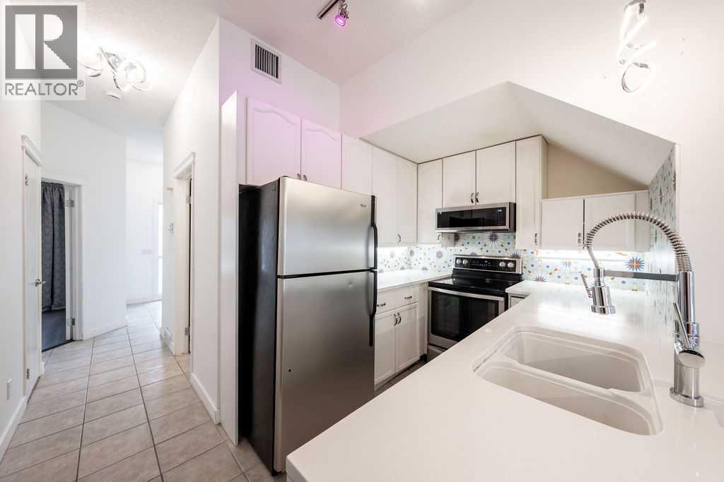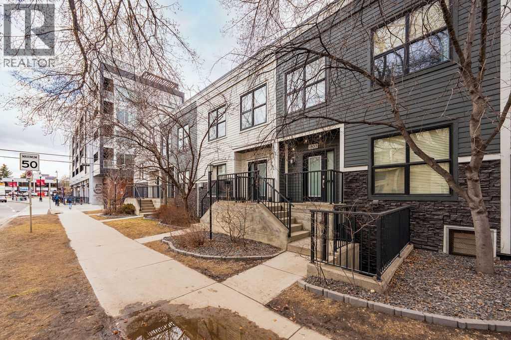 Welcome to this beautifully maintained townhouse condo with street access in an unbeatable location, just steps from the vibrant lifestyle of 17th Avenue. This spacious home features an open concept layout highlighted by a versatile DEN/OFFICE with double french doors and a full wall of built-in shelving and cabinetry. The kitchen has quartz countertops, stainless steel appliances and ample cabinetry. The inviting living room is filled with natural light and showcases hardwood flooring, a cozy gas fireplace, and patio doors leading to a spectacular WEST FACING 14’ X 16’ PATIO. This outdoor space opens directly onto a beautiful shared courtyard that must be seen to be appreciated. Additional features include underground parking with storage, in-floor heating combined with forced air, and numerous recent upgrades over the past 3 - 4 years including new washer, dryer, stove, microwave hood fan, hardwood flooring in the bedroom, and COMPLETE REPLACEMENT OF POLY-B PLUMBING. Located in Chateau Falls, a well managed, PRIVATE GATED COMPLEX that underwent extensive renovations in 2015, including newer windows, doors, roof and exterior paint. A great opportunity in a highly sought after location – viewing is highly recommended. (id:55577)