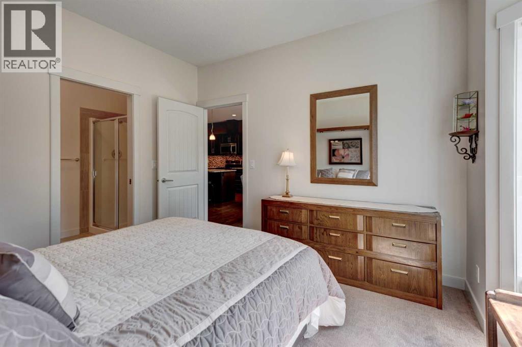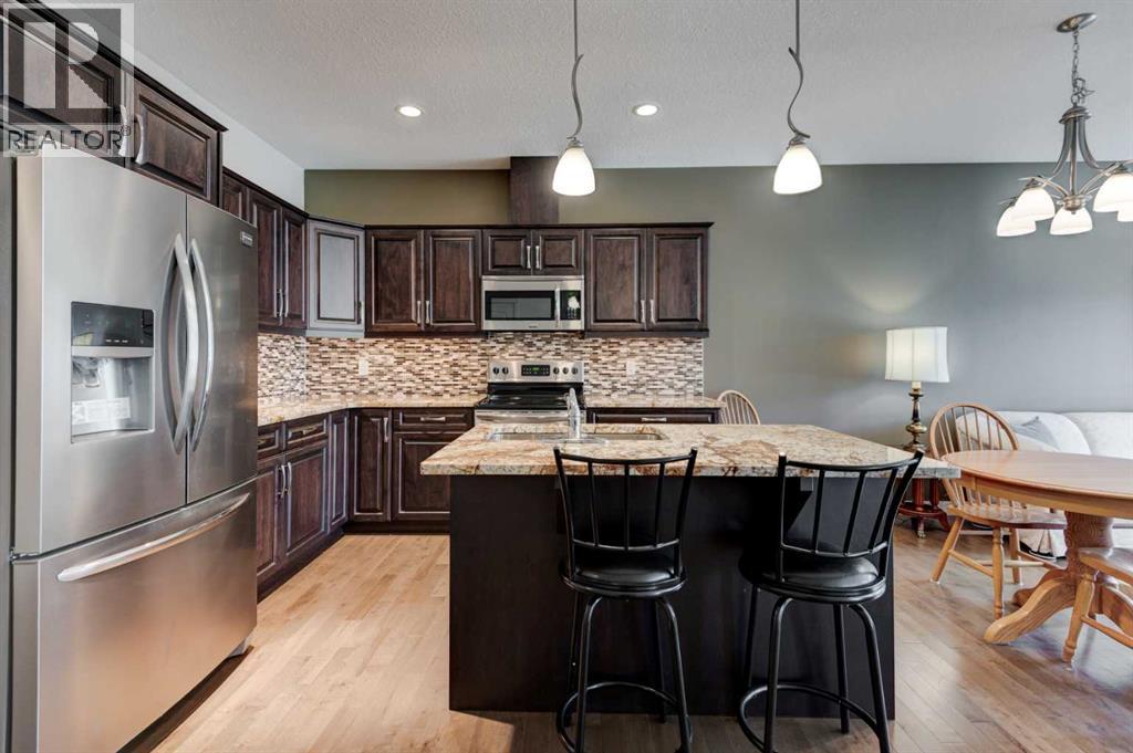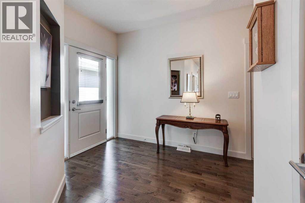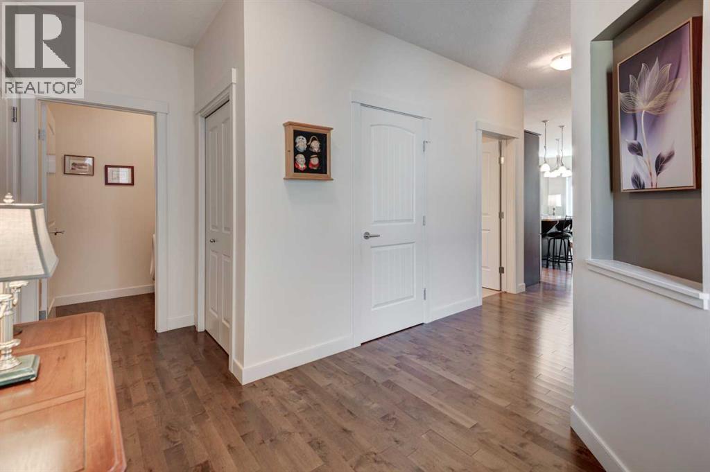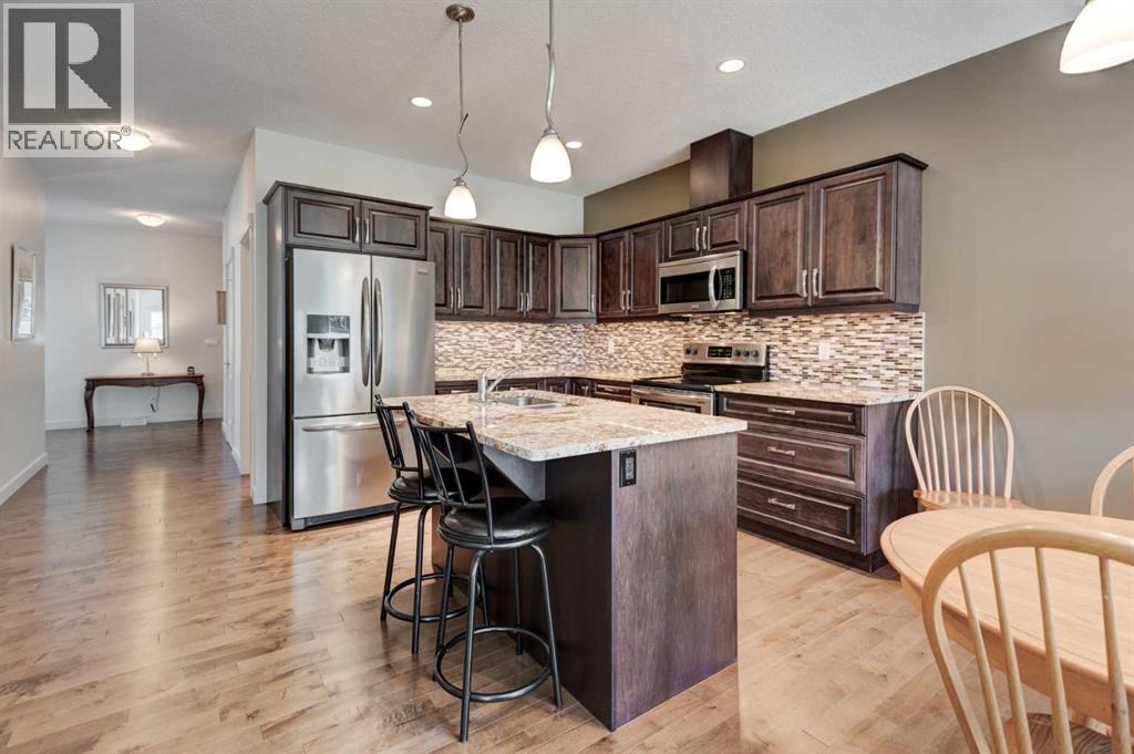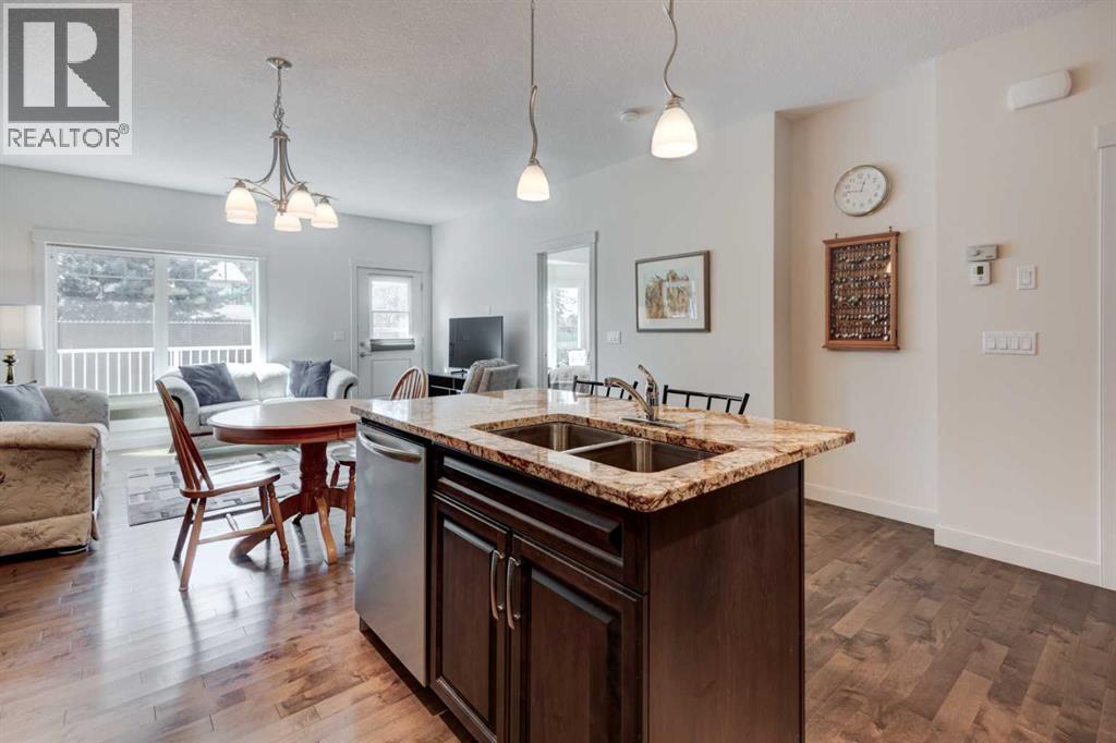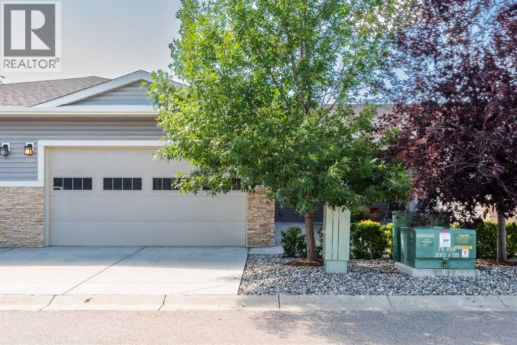 Beautifully maintained fully developed villa in Sagewood Adult Living (55+) community in Strathmore is now available for a quick possession. This former SHOWHOME is fully upgraded and features 9 ft ceilings, wide hallways, granite countertops, throughout the main level, hardwood floors, copious kitchen cabinetry with soft close cupboards and drawers, under cabinet lighting and stainless steel appliances. The floorplan is open concept with a West exposure from the living room. The primary suite presents luxuriously with a large bay window, enough space for a king size bed and dressers and accompanied by a walk in closet. The en suite has his and her sinks, lots of storage in the vanity and a full sized shower. The main level conveniences extend to include a 3 piece guest bathroom, laundry, and a second bedroom or flex room, as it can also be used as a dining room, den or tv room. The basement contains another bedroom, additional full bathroom, spacious family room with games table area and a wet bar. Storage? There is more than ample storage! Find space here to add a hobby room. There is parking for you in the double attached garage and guest parking a few doors down. The neighbors are wonderful and welcome social gatherings. There are ample walking paths, pickle ball courts, indoor swimming, shopping, hospital, volunteer opportunities and many community activities in the Town of Strathmore. Call your Realtor® to view this luxury villa! (id:55577)