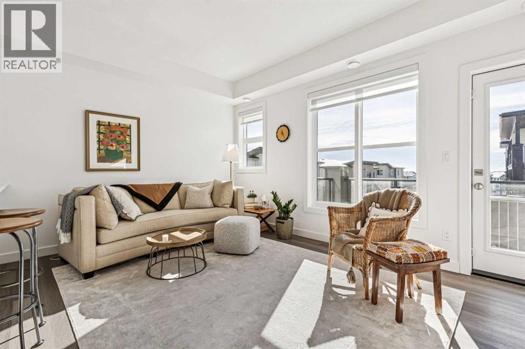 Discover Elkwood in Aspen Springs, located in one of Calgary’s most desirable southwest communities. Positioned at the end of a quiet street, this new stacked townhome enjoys some of the most open sightlines in the complex along with a sunny south-facing exposure, allowing natural light to pour in throughout the day. Thoughtful upgrades include central air conditioning and window coverings, making this home truly move-in ready. The home is also conveniently located close to guest parking, making it easy for visitors.Situated on the top floor, this modern home features 2 spacious bedrooms and 2 full bathrooms within a well-designed open-concept layout. 9-foot ceilings, expansive windows, and wide-plank luxury vinyl flooring create a bright and inviting atmosphere throughout the main living areas.The designer kitchen is both stylish and functional, featuring quartz countertops, soft-close cabinetry, a tiled backsplash, stainless steel appliances, a built-in microwave hood fan, and an upgraded convection oven. An east-facing kitchen window welcomes the morning sun, adding even more natural light to the space. The thoughtful layout offers both bar seating at the kitchen island and a dedicated dining area, making it ideal for everyday living and effortless entertaining.Convenience continues with a main floor laundry room featuring a front-load washer and dryer along with generous storage space. The lower level provides additional storage and a versatile flex room, perfect for a home office, workout space, or hobby area, plus private direct access to your attached garage—large enough to accommodate a Ford F-150 truck, a rare and valuable feature for townhome living.Ideally located just minutes from the shops and restaurants of Aspen Landing Shopping Centre, and easy C-Train access, along with nearby walking paths, schools, and beautiful green spaces, this home offers the perfect balance of style, comfort, and convenience.Whether you’re a first-time buyer, invest or, or seeking a low-maintenance lifestyle, this exceptional home truly checks all the boxes. (id:55577)
