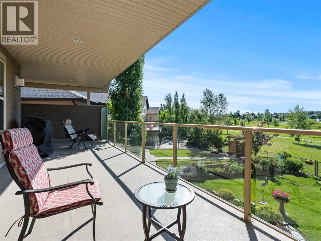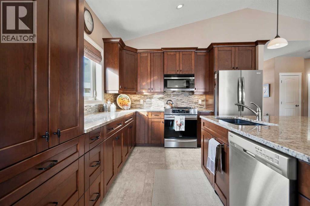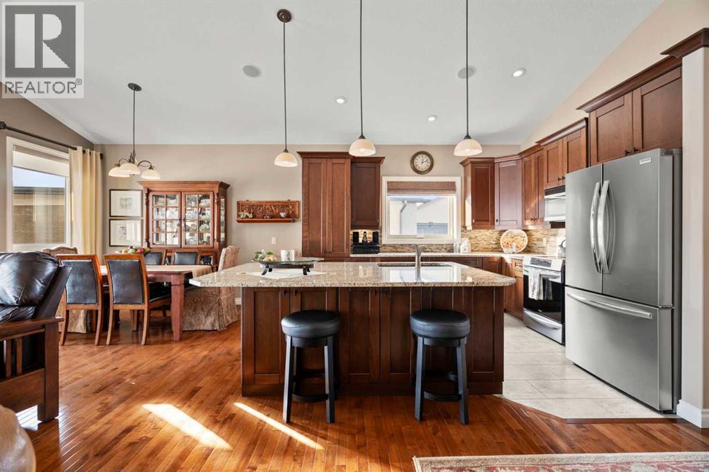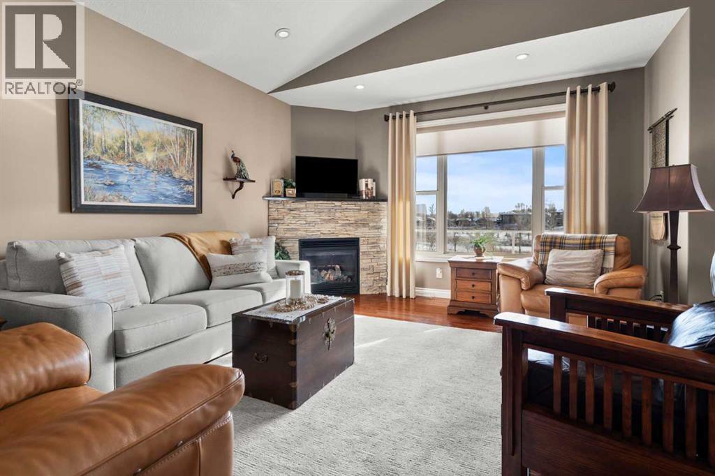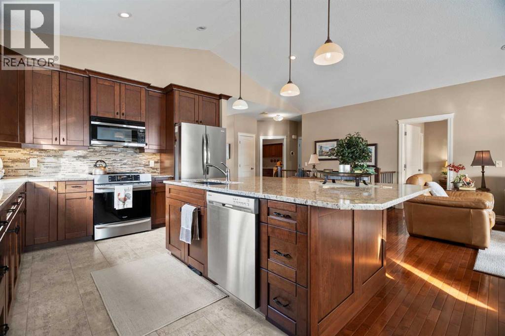 Luxurious small-town living! Ideally located where the prairies meet the mountains in High River, this stunning executive walkout bungalow backs directly onto Highwood Lake — a beautiful, naturalized setting with pathways & expansive green space. This exceptional lot was specifically chosen by custom home builder Allan Campbell for his personal residence. Plans changed, & the current owners have been the only ones to call this incredible property home. It’s easy to see why this location was selected, offering a serene & peaceful environment with convenient access to shops, High River’s charming downtown, amenities, entertainment, restaurants, & recreation. Enjoy the nearby Spray Park, George Lane Park & Highwood Golf Course. South Calgary is 30 mins & Okotoks (Costco) a quick 20 min drive. Situated on a massive reverse pie lot, this property offers stunning outdoor spaces & abundant parking including an oversized 862 sqft insulated garage with walk-up basement access, gas rough-in for a heater & plenty of room for tools & toys. The driveway holds 3+ vehicles, while the side RV driveway allows for winter storage with 130-amp power & roughed-in dumping station. The entire lot is meticulously landscaped with mature trees, perennials, irrigation system, solar water fountain, & a brand-new west-side fence — truly a gardener’s dream. Enjoy two exceptional outdoor living spaces: a lower-level patio with privacy screens & hot tub rough-in, & a full-width covered upper balcony with BBQ gas hookup, accessible from both the dining room & the primary bedroom. Both spaces are perfect for taking in the views & watching the ducks on the pond. Inside, the home features 9’ & vaulted ceilings on the main level, 9’ basement ceilings, granite counters throughout, in-floor heating in the primary bathroom & basement, built-in interior/exterior speakers, power shades, soft-close hardware, & endless storage throughout. Flooded with natural light, the traditional layout is both functional & welcoming for a variety of lifestyles. The main floor offers a beautiful primary suite with walk-in closet & 5-piece ensuite, an ideal laundry/mudroom, a 2nd bedroom (also perfect as a den or office), & a convenient half bath. The kitchen is outstanding! It features a large island, oversized cabinetry, updated vinyl flooring, & a stainless appliance package including a newer Frigidaire induction stove & refrigerator. The walkout level is designed for entertaining, showcasing a massive recreation room, built-in media center, wet bar, games area, two large bedrooms, & a full bathroom. RECENT UPGRADES - Central A/C, R-50 attic insulation over both the house & garage, a composite front deck, healthy climate furnace filter, updated humidifier, fibre optic cable, Larson storm door, new hot water tank (2025), lighting, & more! Ask your Realtor for a complete list of upgrades & features. Do not miss this rare opportunity to own a serene, scenic, & turn-key property in one of High River’s most desirable areas. (id:55577)
