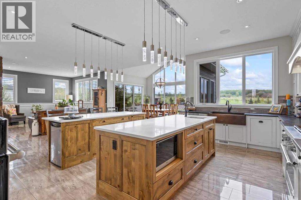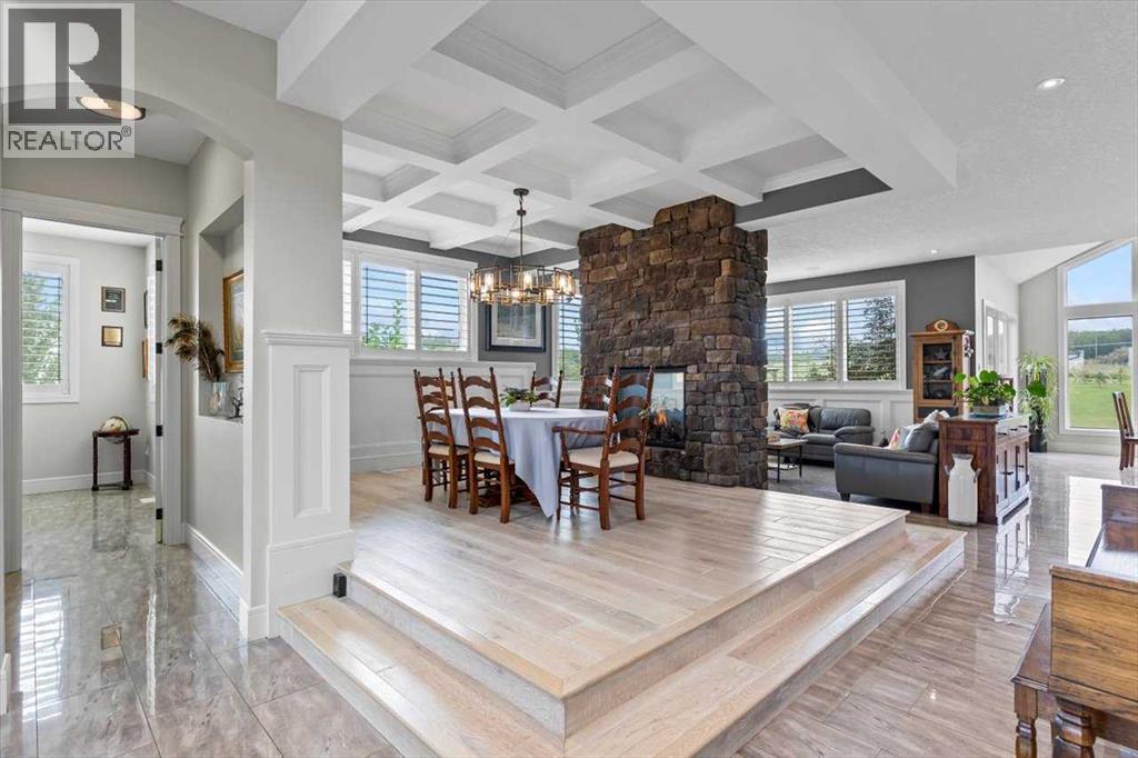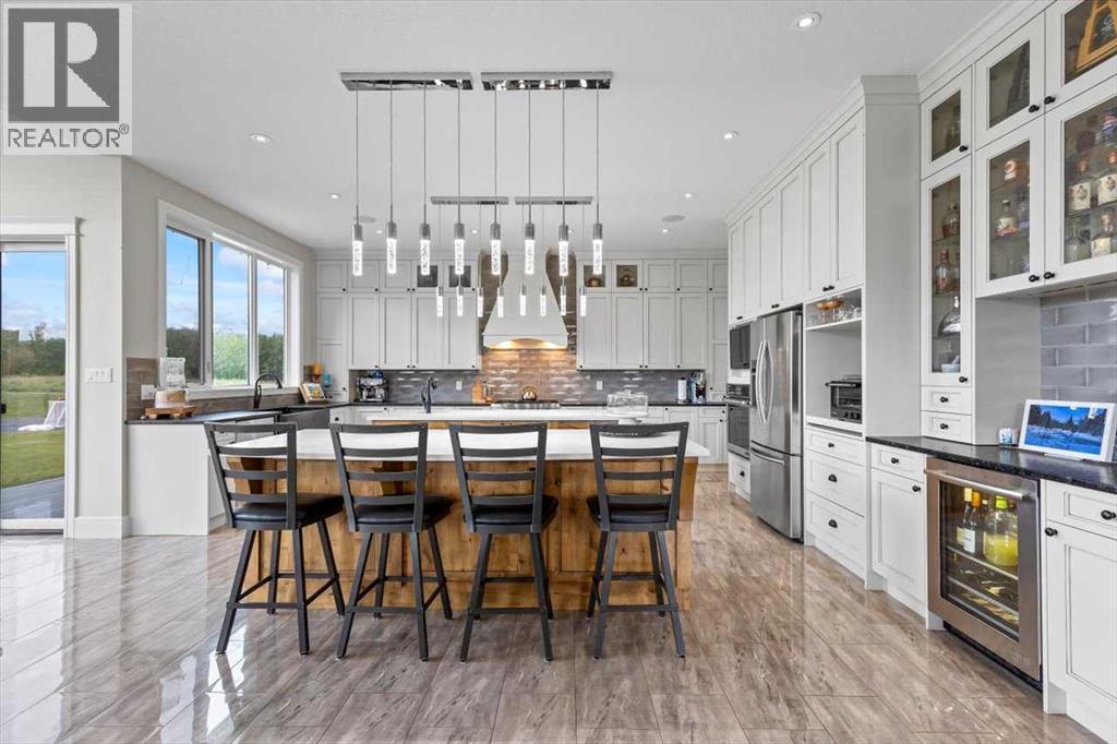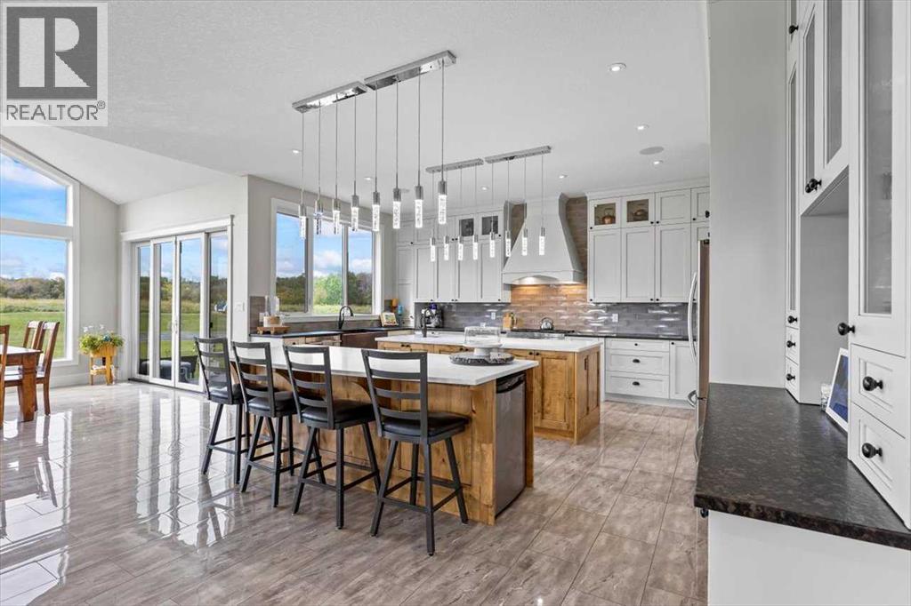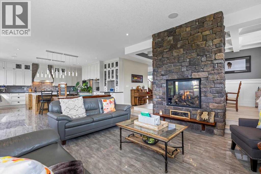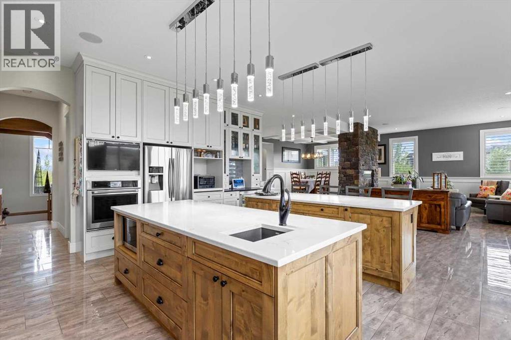 Welcome to an extraordinary CUSTOM-BUILT estate where functional luxury and privacy meet in perfect harmony. Set on 3.12 acres at the end of a quiet cul-de-sac with no neighbours behind, this residence offers more than 7,000 sqft of impeccably designed living space across three levels and a seamless balance of serene country living with city convenience. As you step inside the foyer, the 20-foot ceilings might be the last thing you notice as the adjacent awe-inspiring floating Alderwood staircase immediately grabs your attention and sets a tone of refined craftsmanship. While still standing in the foyer, the open concept design allows you to look past the raised dining room with coffered ceiling, double-sided stone fireplace and living room into the nook with its own 14-foot vaulted ceiling and a panoramic view of the backyard. The gourmet kitchen is a chef’s dream that features floor-to-ceiling custom cabinetry, double 8-foot Knotty Alder Islands, Jenn-Air Professional 36” Dual Fuel 6-Burner Range & Jenn-Air Professional Convection Wall Oven, 40” Native Trails Copper Farmhouse sink, and the striking combination of quartz and leathered granite countertops provides seemingly endless counter space. The main floor also includes a private office ideal for working from home, along with two mudrooms that provide entrance into the home from both heated garages. This magnificent home includes 8 BEDROOMS (each with its walk-in closet) and 7.5 BATHS (in total) with a fully developed basement. Upstairs, you'll find six bedrooms, including the luxurious primary retreat with an oversized walk-in closet and a beautifully appointed ensuite, along with five bedrooms. There is room for extended family or multi-generational living. The fully finished basement boasts a massive recreation room/games room, two spacious bedrooms and storage. Comfort and efficiency are paramount with in-floor radiant heating, built-in multi-zone sound system and instant hot water throughout the house. The home comes equipped with water treatment, a dedicated sports room, ample storage and even three washers and three dryers to keep pace with an active lifestyle. Enjoy outdoor living at its finest with a large front veranda, a private gazebo surrounded by maturing trees, a firepit / BBQ area, and stunning views of the Calgary Skyline. There is room for your RV, complete with full RV hookups, along with ample parking spaces for more cars than you can imagine. The property is just outside of Okotoks corporate limits (500m), offering you the choice of public and Catholic schools within 5 minutes or private schools less than 10 minutes away from the house. This premium property delivers unrivalled space, privacy and craftsmanship making it a rare offering, add in its ideal location, it’s a one of a kind offering on the market today! (id:55577)