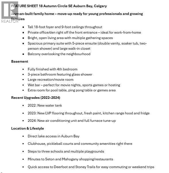Ready for your next-level family home in one of Calgary’s top lake communities? This sharp JAYMAN-BUILT move-up at 18 Autumn Circle SE in Auburn Bay is exactly what young professionals and growing families are looking for when they’re ready to upgrade. Walk through the tall 18-foot foyer into a bright, open main floor with 9-FOOT CEILINGS. Right off the entrance you get a PRIVATE OFFICE/DEN, perfect for work-from-home days or a quiet zoom corner, or maybe a flex bedroom for your guests. The layout flows straight into a spacious kitchen with a big island, tons of cabinetry and a walk-in pantry, then opens to the dining area and living room with a cozy fireplace. Upstairs, the primary suite feels like a private retreat: 5-PIECE ENSUITE with double vanity, soaker tub, two-person shower and a huge walk-in closet. Two more bright bedrooms, a 4-piece bathroom, a built-in desk nook and a BALCONY overlooking the neighbourhood give everyone their own space. Downstairs the FULLY FINISHED BASEMENT offers 4th bedroom, 3-piece bathroom with glass shower, massive rec/movie room and wet bar. Movie nights, sports games, or hosting friends just got way better. This home has been quietly UPGRADED for peace of mind: NEW WATER TANK (2022), NEW LVP FLOORING, FRESH PAINT, KITCHEN RANGE HOOD AND FRIDGE (2023), PLUS BRAND-NEW AIR CONDITIONING AND A FULL FURNACE TUNE-UP (2024). Step outside to the SOUTH-FACING BACKYARD that gets full sun all day, ideal for summer BBQs, gardening or just relaxing. The street is quiet with loads of parking, and you’re steps from three schools and multiple playgrounds. Auburn Bay delivers the lifestyle upgrade you want: direct lake access, clubhouse, pickleball courts and everyday convenience. You’re also minutes from Seton and Mahogany plus quick access to Deerfoot and Stoney Trails for an easy commute or weekend adventures. This is the one you’ve been waiting for! Call your favourite Realtor today! (id:55577)