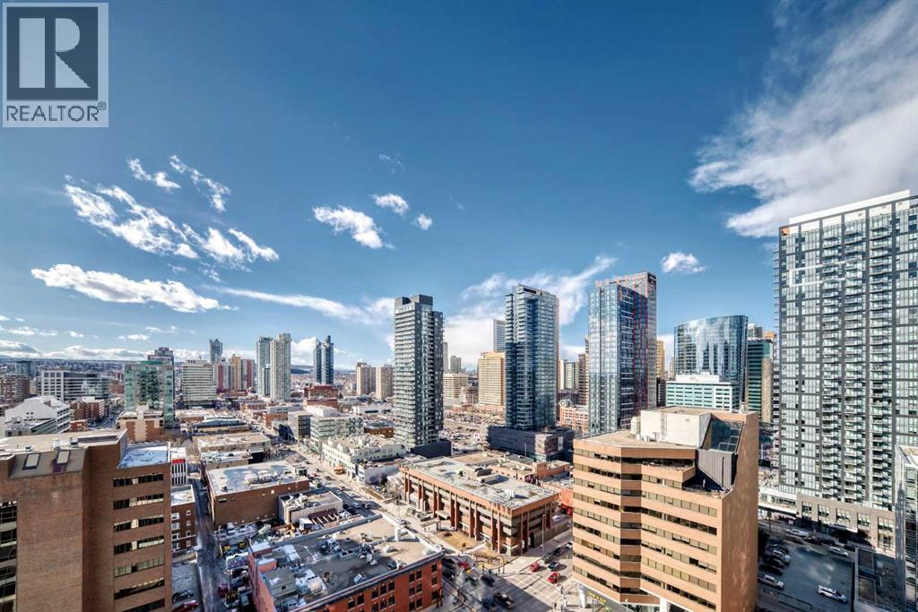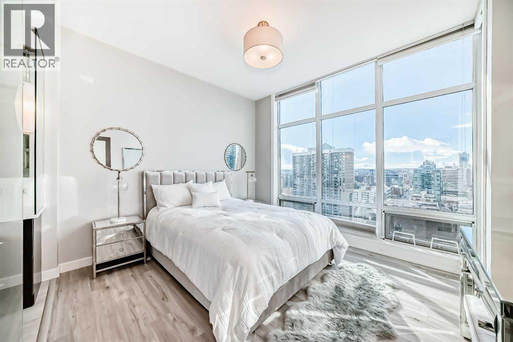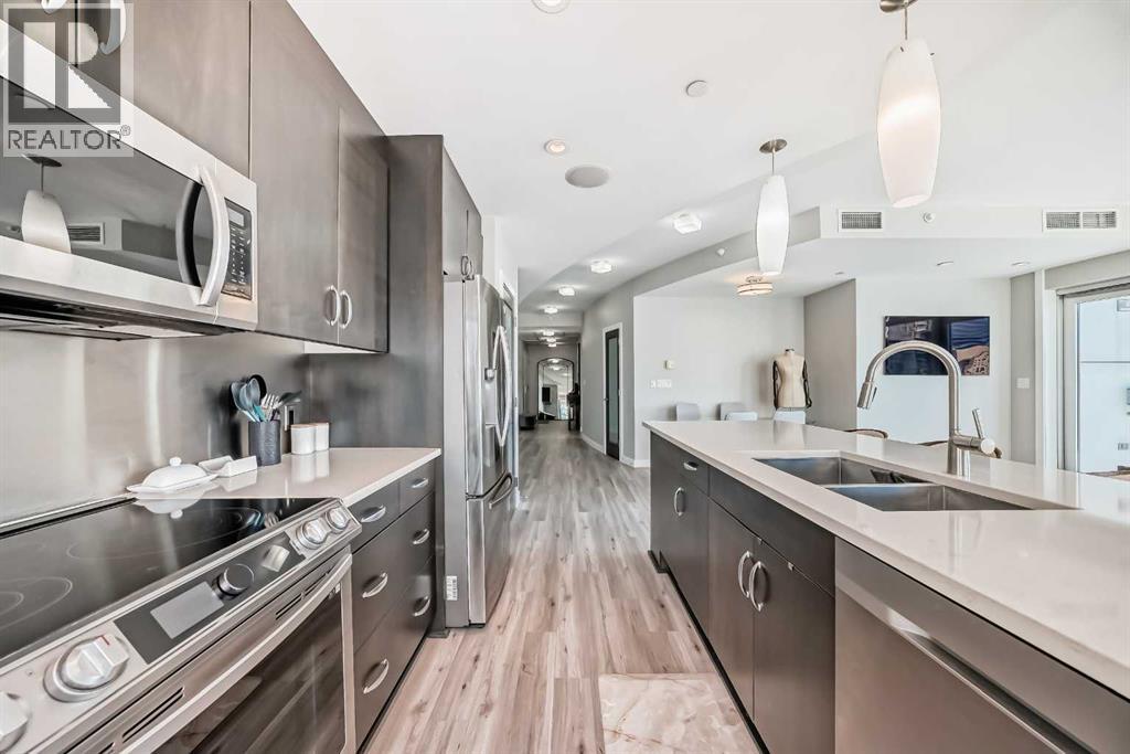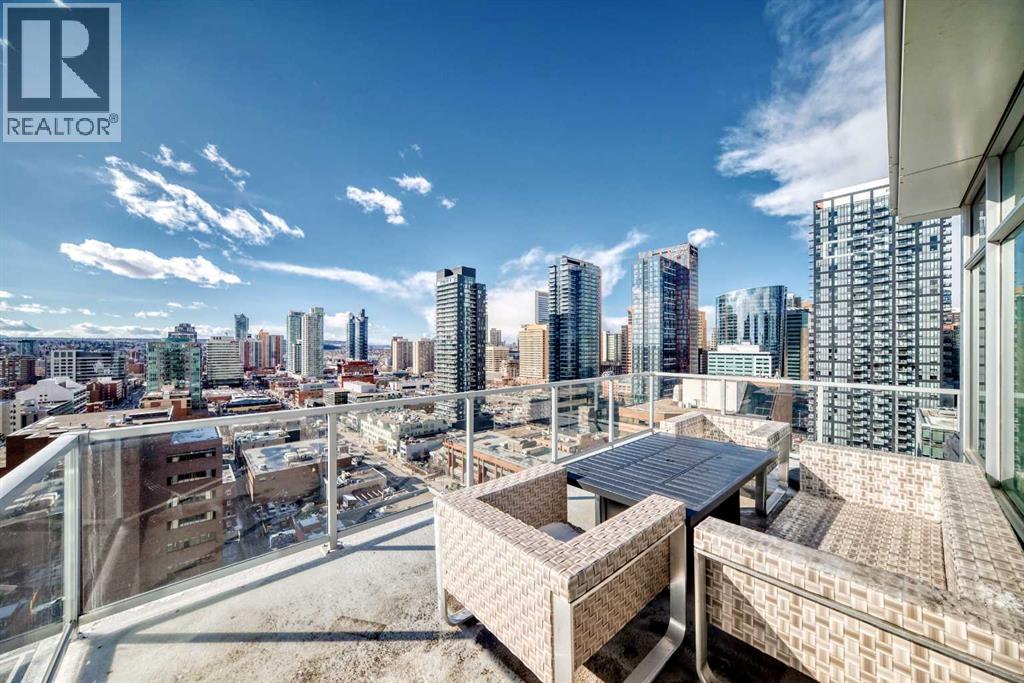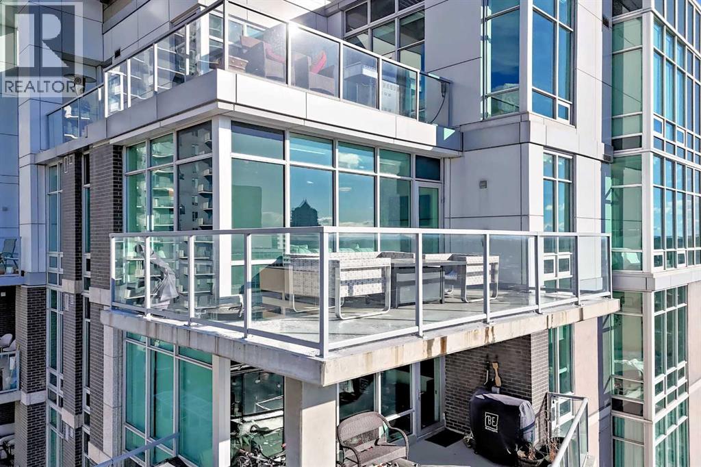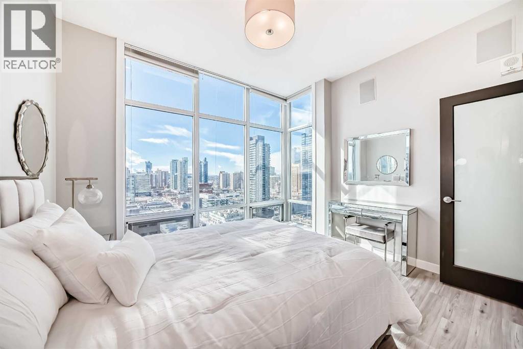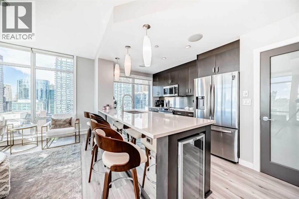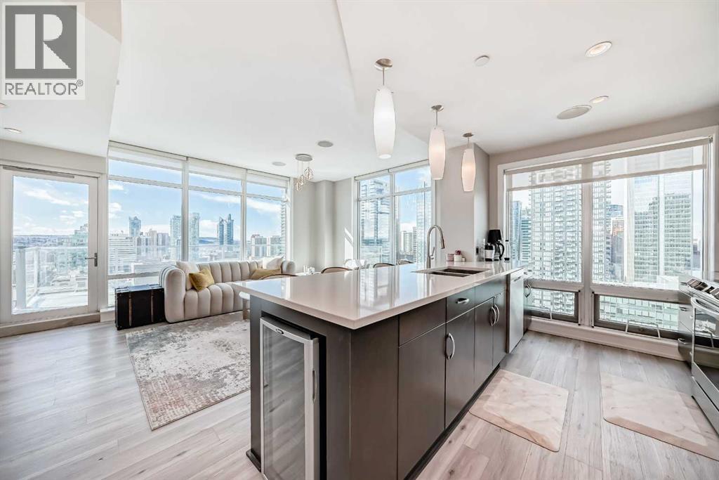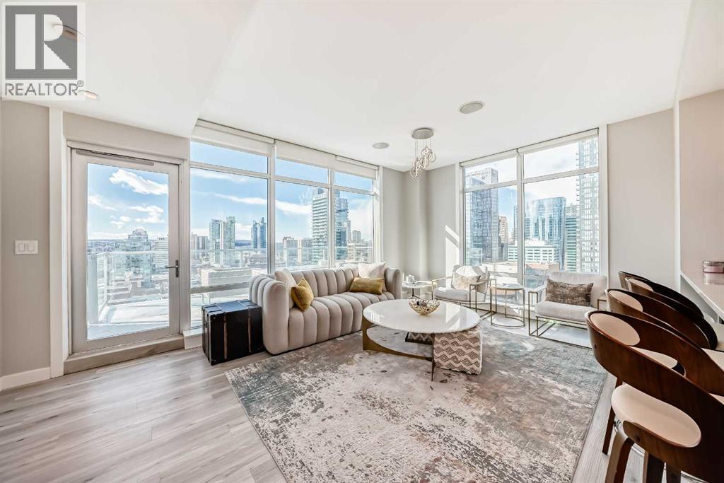 Sub Penthouse!! Experience elevated urban living in this stunning executive condo, featuring unobstructed panoramic city and mountain views. Flooded with natural light by day and illuminated by the glow of city lights at night, this spacious and immaculate suite offers an open floor plan with 9-ft ceilings, floor-to-ceiling windows, modern floors, and solid concrete construction.The generous kitchen is designed for both everyday living and entertaining, complete with extensive cabinetry, stainless steel appliances, quartz countertops, and a built-in wine cooler. The bright living area is surrounded by glass and seamlessly extends to an impressive 190 sq. ft. balcony with sweeping city views, creating the perfect setting for entertaining or relaxing while enjoying spectacular sunsets and the vibrant downtown skyline.The primary retreat features a spa-inspired ensuite with quartz counters, double vanity, large glass-enclosed steam shower, and walk-in closet. A spacious second bedroom, full bath, and convenient laundry complete the interior.Additional highlights include central air conditioning, titled storage locker, and 2 titled parking stalls. Ideally located in the heart of Calgary’s vibrant urban core, this exceptional residence offers the perfect blend of luxury, comfort, and lifestyle. (id:55577)