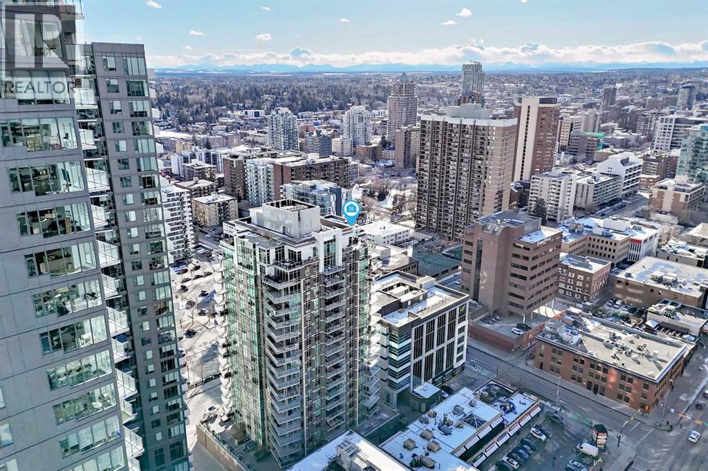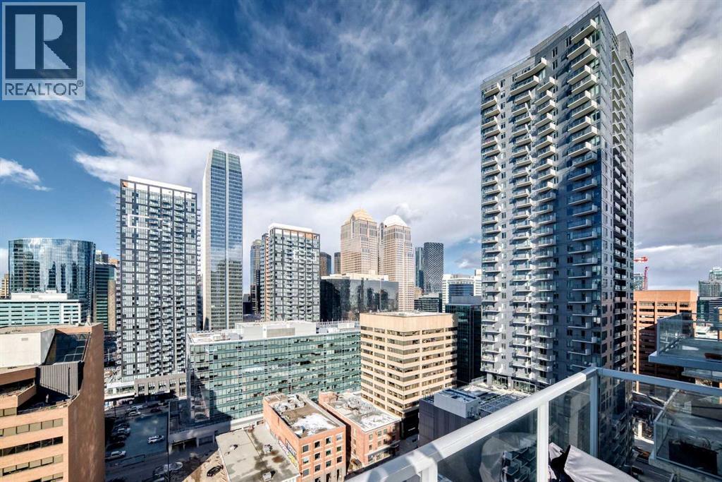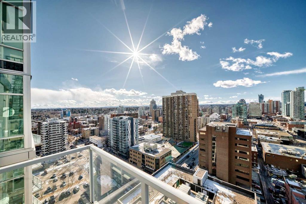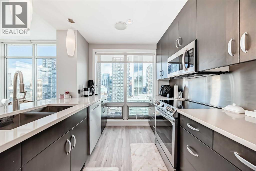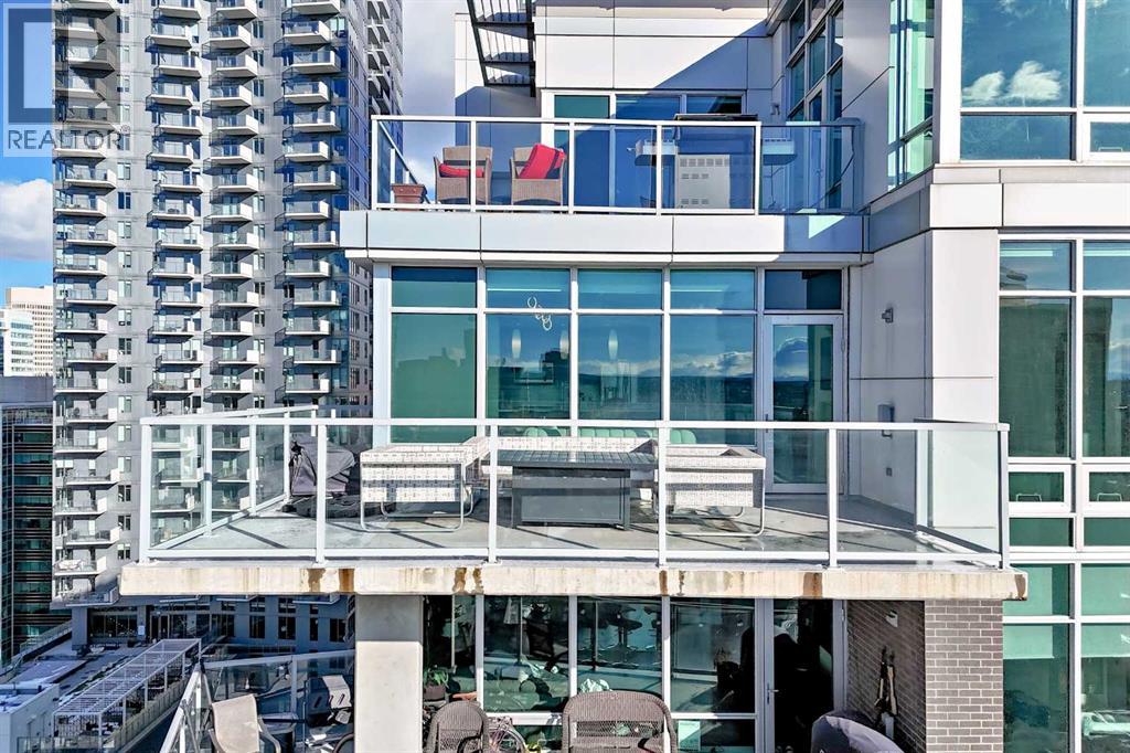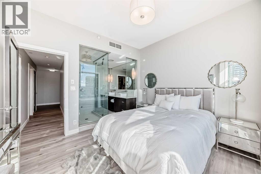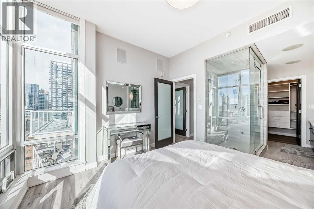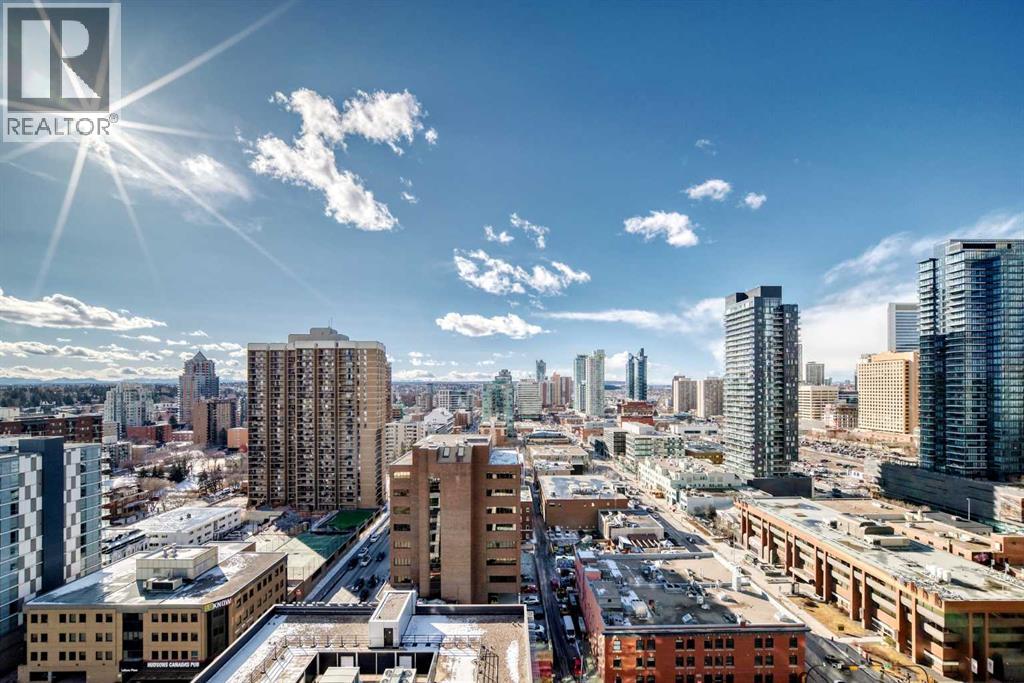 Sub Penthouse!! Experience elevated urban living in this stunning executive condo, featuring unobstructed panoramic city and mountain views. Flooded with natural light by day and illuminated by the glow of city lights at night, this spacious and immaculate suite offers an open floor plan with 9-ft ceilings, floor-to-ceiling windows, modern floors, and solid concrete construction.The generous kitchen is designed for both everyday living and entertaining, complete with extensive cabinetry, stainless steel appliances, quartz countertops, and a built-in wine cooler. The bright living area is surrounded by glass and seamlessly extends to an impressive 190 sq. ft. balcony with sweeping city views, creating the perfect setting for entertaining or relaxing while enjoying spectacular sunsets and the vibrant downtown skyline.The primary retreat features a spa-inspired ensuite with quartz counters, double vanity, large glass-enclosed steam shower, and walk-in closet. A spacious second bedroom, full bath, and convenient laundry complete the interior.Additional highlights include central air conditioning, titled storage locker, and 2 titled parking stalls. Ideally located in the heart of Calgary’s vibrant urban core, this exceptional residence offers the perfect blend of luxury, comfort, and lifestyle. (id:55577)