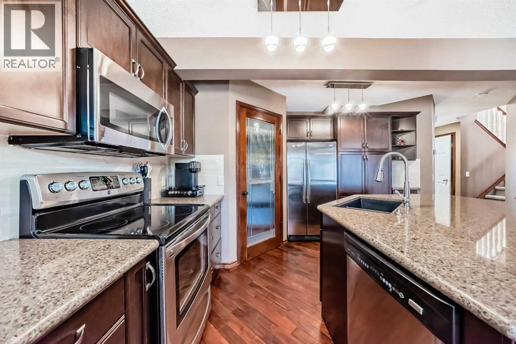 Live the Lake Life in Chaparral! Just one block from Lake Chaparral, this beautifully maintained two-storey offers over 2,500 ft² in one of Calgary’s most sought-after lake communities. Step inside to warm hardwood floors, granite counters, and a spacious kitchen with a central island, built-in microwave, Silgranit sink with garburator, walk-in pantry, ample pot drawers, and built-in bookshelves. Enjoy both a formal dining room and a bright breakfast nook that opens to the backyard. The large living room features newer carpet and a cozy corner gas fireplace, perfect for unwinding. A convenient 2-piece bath and main-floor laundry complete this level. Upstairs, you’ll find a generous bonus room with a second gas fireplace, a 4-piece bathroom, and three well-sized bedrooms, including a large primary suite with a walk-in closet featuring custom built-ins and a private 4-piece ensuite with a relaxing soaker tub. The finished basement adds versatility with a family room and a 2-piece bath roughed-in for a shower. Outside, enjoy a private fenced backyard with a deck, shed, underground sprinklers, and Gemstone lights. An insulated double garage adds everyday convenience on this corner lot with a paved alley and mature trees, offering excellent light and privacy. Recent upgrades include a new water heater (2025), carpet (2020), central air conditioning, and newer shingles (2021). Don’t miss your chance to enjoy lake privileges and a fantastic family lifestyle right here in Chaparral! (id:55577)
