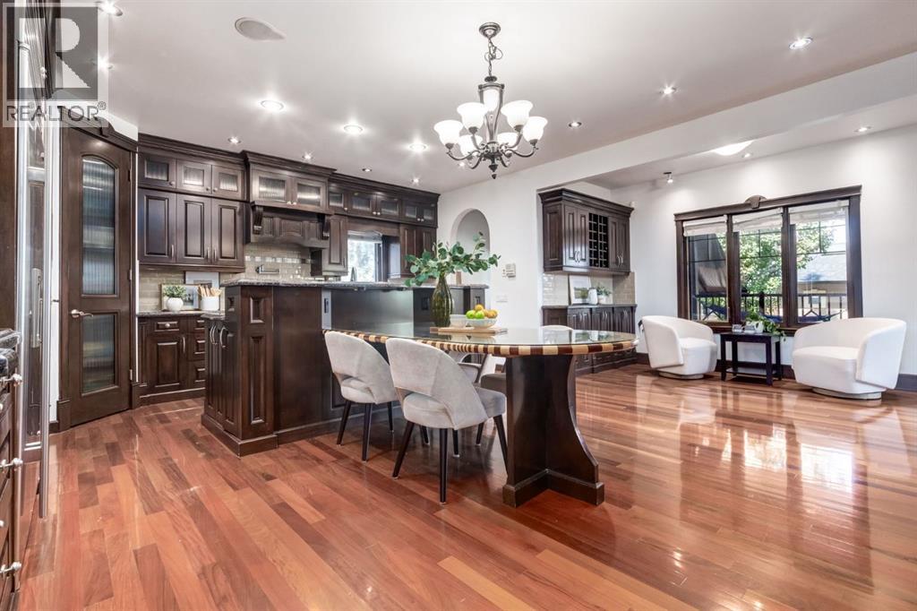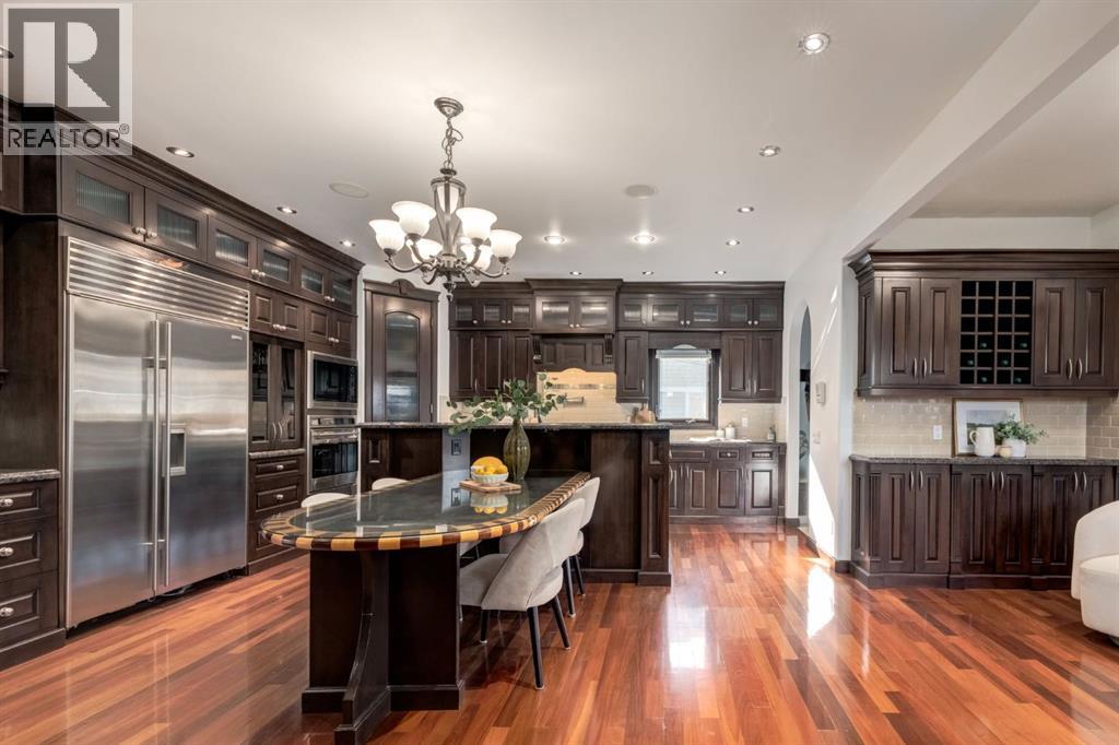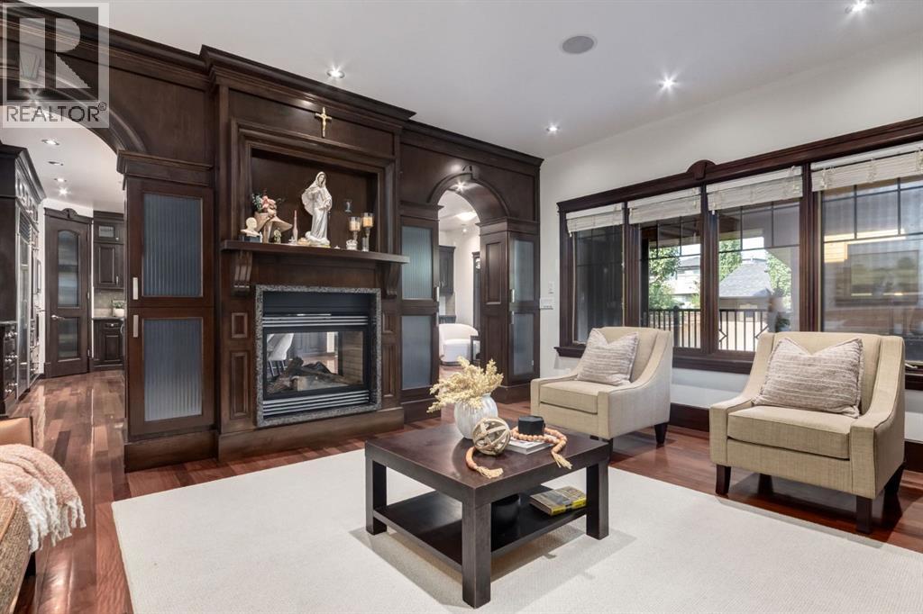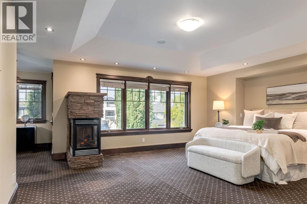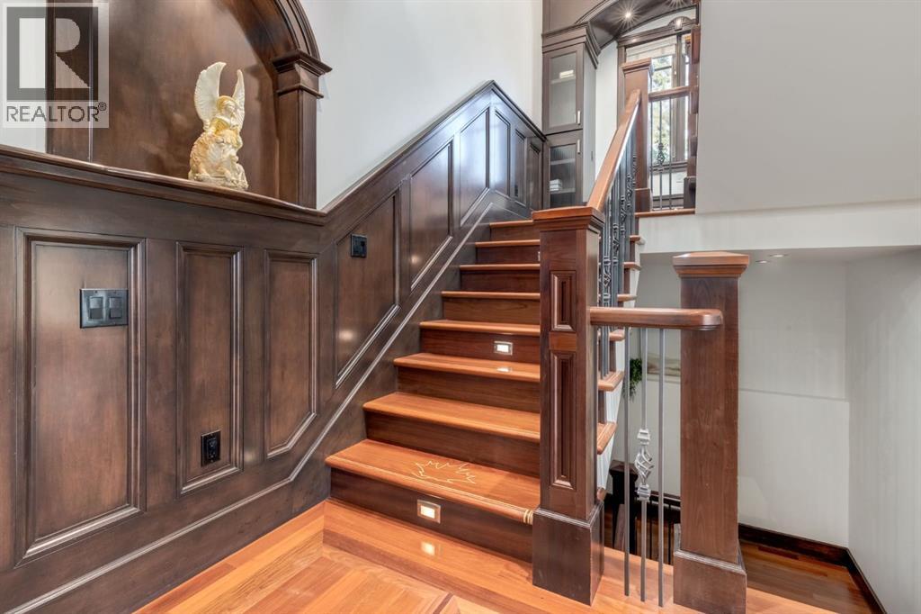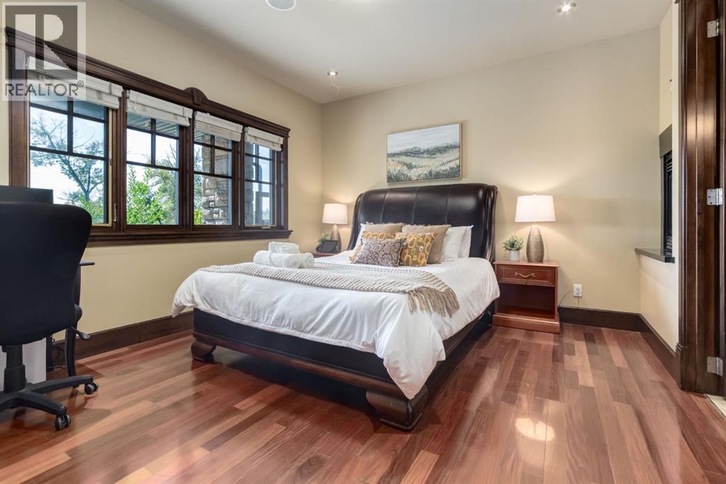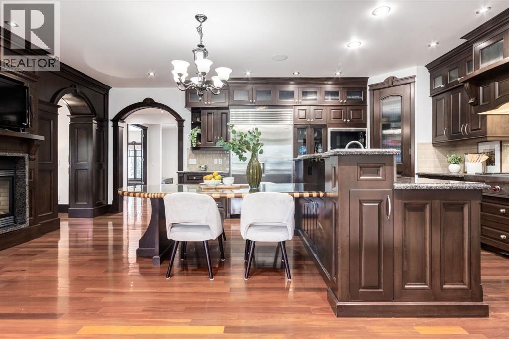This extraordinary custom estate offers over 5,200 sq. ft. of total living space, situated on a massive 179' deep lot, plus more than 1,100 sq. ft. of covered outdoor areas, all with sweeping views of the Bow River and downtown skyline. From the foyer, the craftsmanship is immediately evident with over 8,000 board feet of maple millwork, solid maple doors, Brazilian walnut floors, and exotic hardwoods such as tiger wood, bird’s-eye maple, ebony, kaiju, walnut, and cherry, all installed by master artisans. The main floor offers a front-facing primary bedroom with a private ensuite with jetted shower and tub, and in-floor heat. A formal dining space or office, and a showpiece kitchen appointed with a Wolf gas range, Sub-Zero fridge, Bosch dishwasher, walk-in pantry, curved cabinetry, beveled granite counters, and a custom removable island table. The adjoining living room is anchored by a fireplace and opens seamlessly to expansive covered decks with cedar ceilings and stamped concrete, creating year-round indoor-outdoor living. Upstairs, four bedrooms include two full primary suites with fireplaces and spa-inspired ensuites, while the main retreat enjoys a sitting area, walk-in closet, heated floors, jetted tub, and steam shower. Another primary bedroom with an ensuite, two additional beds with a jack-and-jill bath, one with a built-in fireplace, a wet bar, which leads out to the balcony with skyline views, and a laundry room complete the second level. The fully developed walk-out/walk-up basement offers a recreation room, kitchenette, two more bedrooms, and two bathrooms, all warmed by in-floor heating with direct access to covered patios. Outside, six distinct decks and patios surround the real-stone exterior, complemented by a finished four-car garage with skylights, a 66’ RV pad, stamped-concrete driveway, and rear alley access with space for lots of vehicles. Recent upgrades include a new roof, downspouts, custom putting green landscaping, and central A/C (2025), while a pre-poured foundation provides a ready-to-build addition (with city of Calgary Permit Approval). Surrounded by multi-million-dollar homes and set directly across from downtown Calgary, this rare riverfront property combines artisanal detail, scale, and location in a way that defines luxury living. Nestled just steps away from parks, trendy restaurants, and bars, this residence provides a serene escape in the vibrant Kensington district. Its proximity to the Bow River, downtown, the University of Calgary, SAIT, and Foothills Hospital makes it ideal. With easy access to Memorial Drive and Crowchild Trail, this is your opportunity to call this magnificent property your own. Don't hesitate to call today! (id:55577)