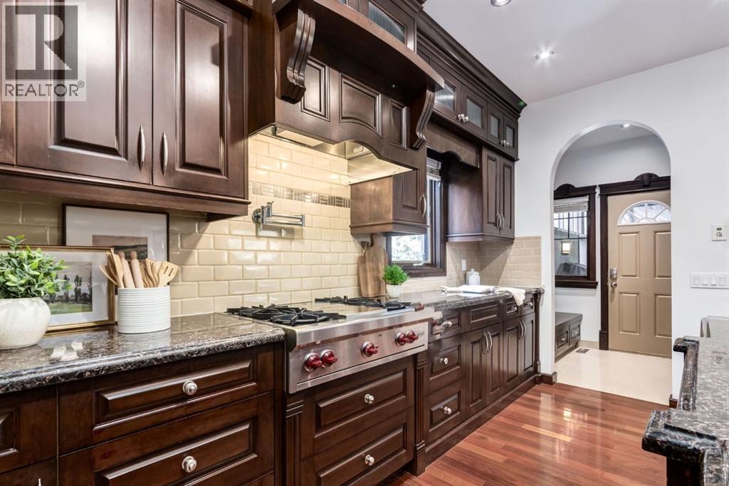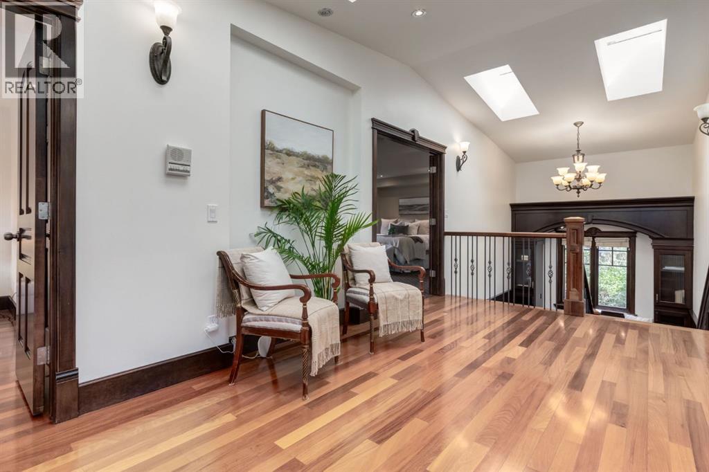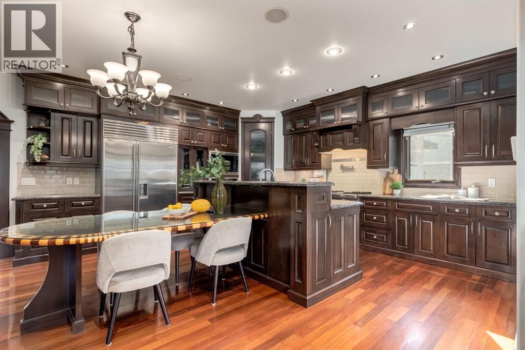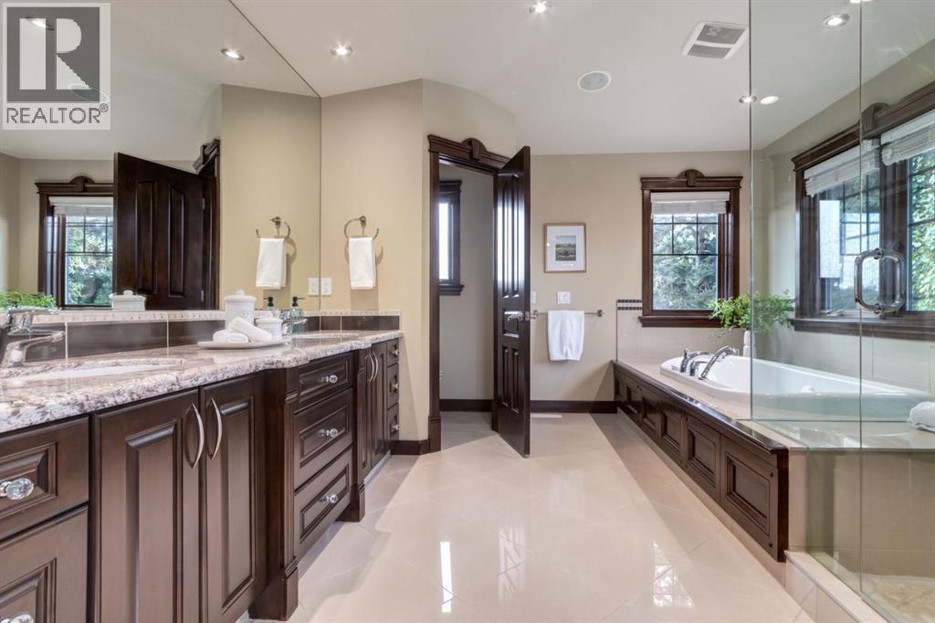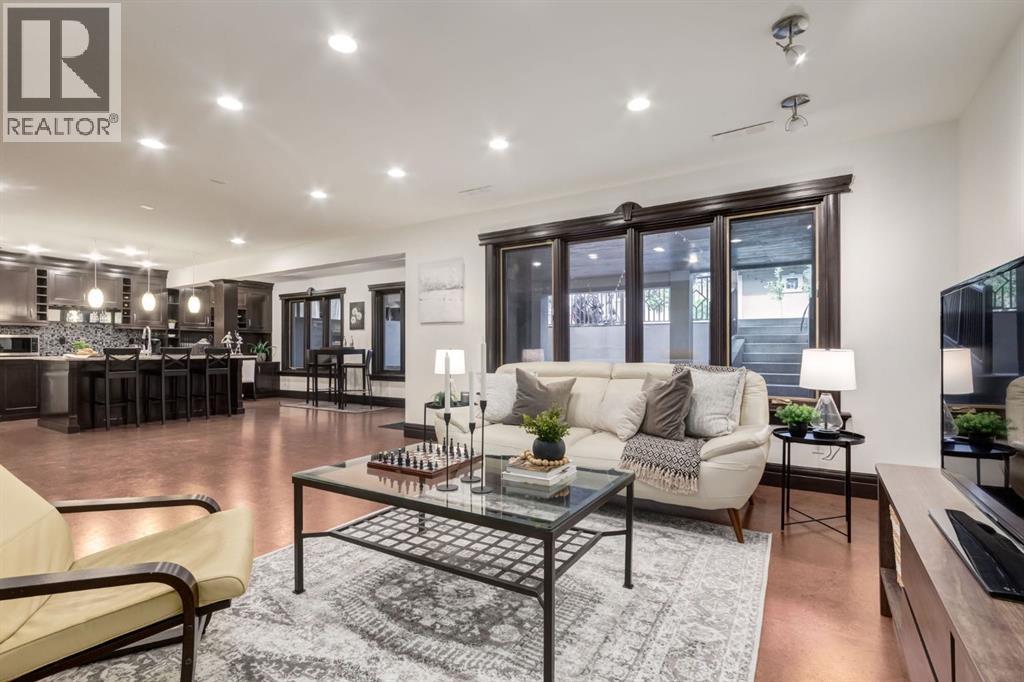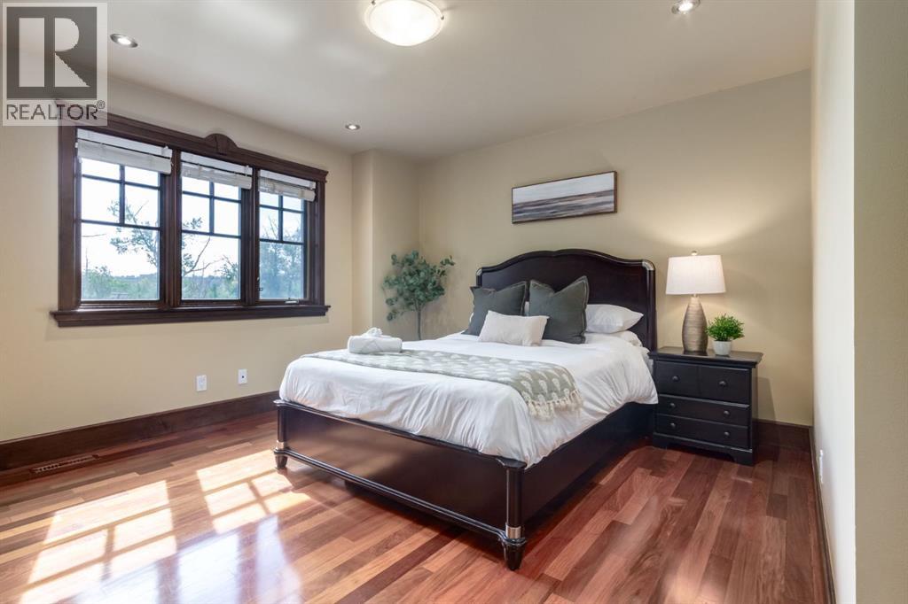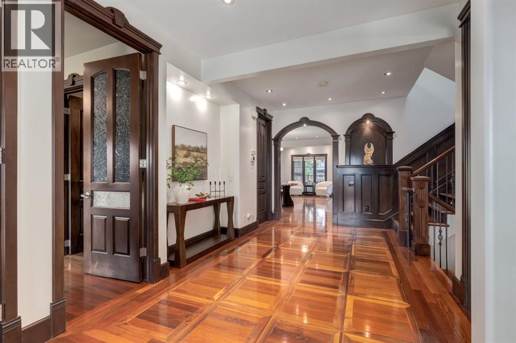 This extraordinary custom estate offers over 5,200 sq. ft. of total living space, situated on a massive 179' deep lot, plus more than 1,100 sq. ft. of covered outdoor areas, all with sweeping views of the Bow River and downtown skyline. From the foyer, the craftsmanship is immediately evident with over 8,000 board feet of maple millwork, solid maple doors, Brazilian walnut floors, and exotic hardwoods such as tiger wood, bird’s-eye maple, ebony, kaiju, walnut, and cherry, all installed by master artisans. The main floor offers a front-facing primary bedroom with a private ensuite with jetted shower and tub, and in-floor heat. A formal dining space or office, and a showpiece kitchen appointed with a Wolf gas range, Sub-Zero fridge, Bosch dishwasher, walk-in pantry, curved cabinetry, beveled granite counters, and a custom removable island table. The adjoining living room is anchored by a fireplace and opens seamlessly to expansive covered decks with cedar ceilings and stamped concrete, creating year-round indoor-outdoor living. Upstairs, four bedrooms include two full primary suites with fireplaces and spa-inspired ensuites, while the main retreat enjoys a sitting area, walk-in closet, heated floors, jetted tub, and steam shower. Another primary bedroom with an ensuite, two additional beds with a jack-and-jill bath, one with a built-in fireplace, a wet bar, which leads out to the balcony with skyline views, and a laundry room complete the second level. The fully developed walk-out/walk-up basement offers a recreation room, kitchenette, two more bedrooms, and two bathrooms, all warmed by in-floor heating with direct access to covered patios. Outside, six distinct decks and patios surround the real-stone exterior, complemented by a finished four-car garage with skylights, a 66’ RV pad, stamped-concrete driveway, and rear alley access with space for lots of vehicles. Recent upgrades include a new roof, downspouts, custom putting green landscaping, and central A/C (2025), while a pre-poured foundation provides a ready-to-build addition (with city of Calgary Permit Approval). Surrounded by multi-million-dollar homes and set directly across from downtown Calgary, this rare riverfront property combines artisanal detail, scale, and location in a way that defines luxury living. Nestled just steps away from parks, trendy restaurants, and bars, this residence provides a serene escape in the vibrant Kensington district. Its proximity to the Bow River, downtown, the University of Calgary, SAIT, and Foothills Hospital makes it ideal. With easy access to Memorial Drive and Crowchild Trail, this is your opportunity to call this magnificent property your own. Don't hesitate to call today! (id:55577)