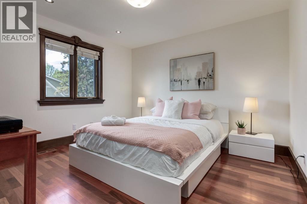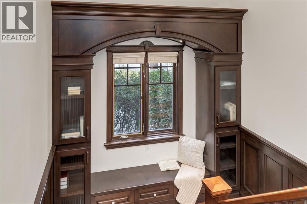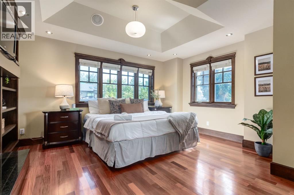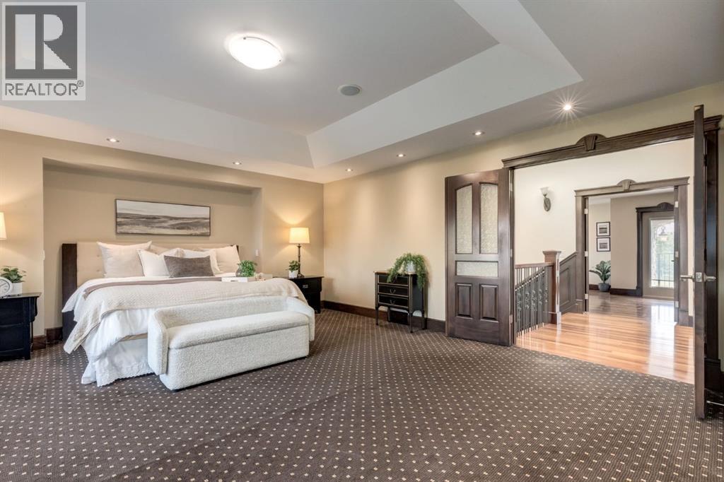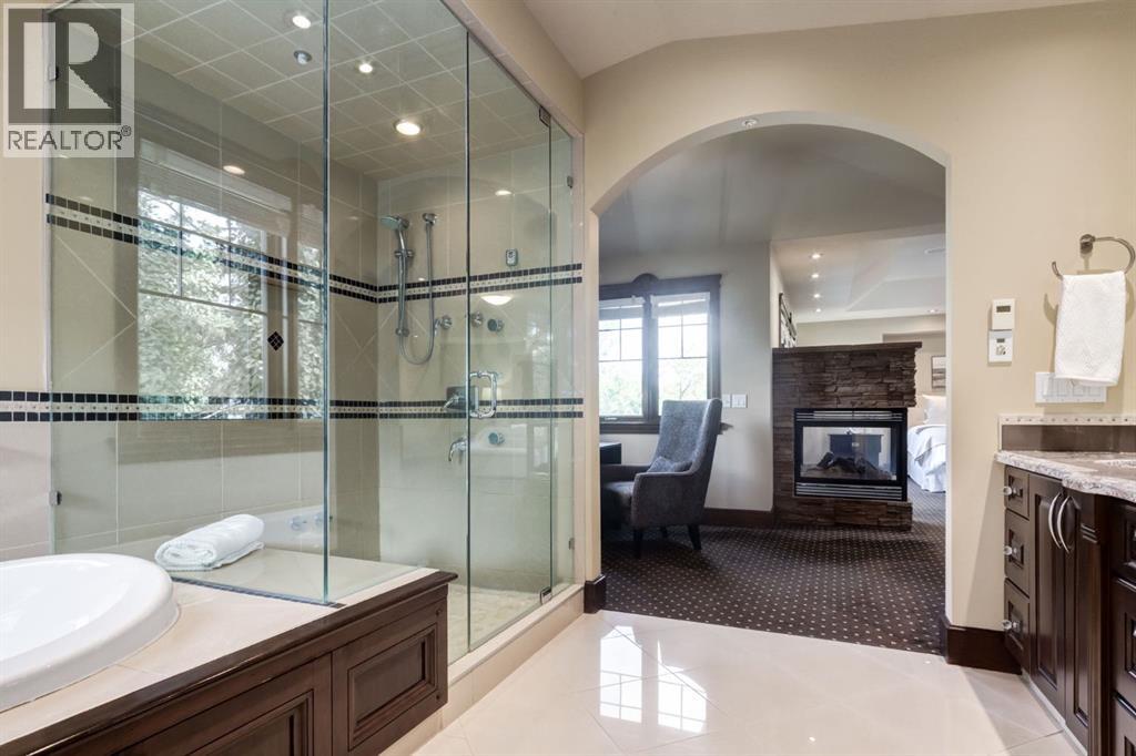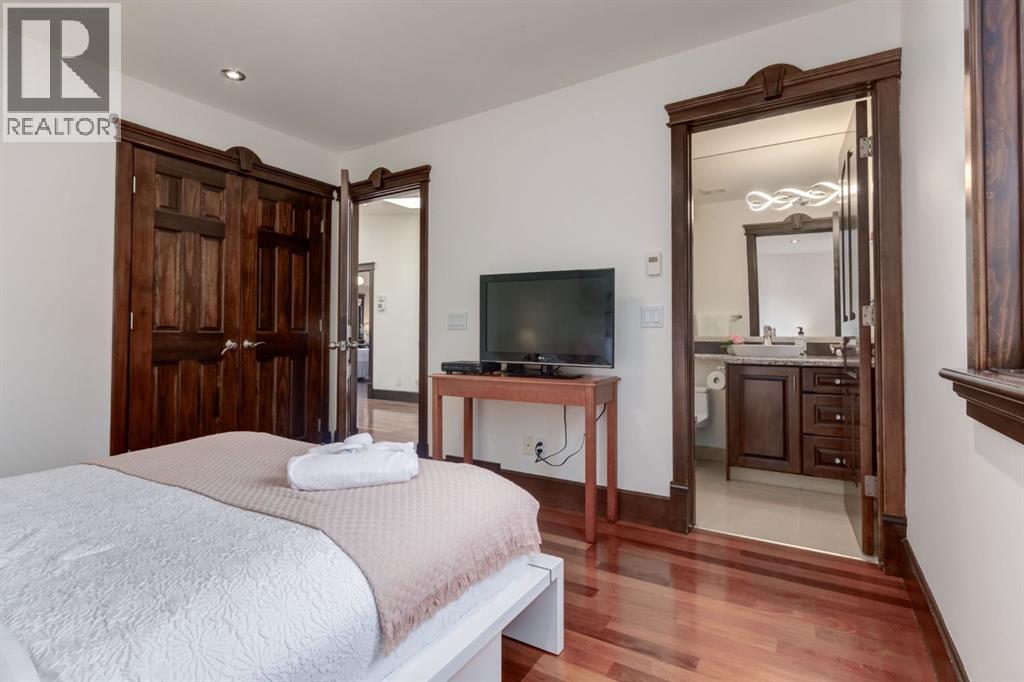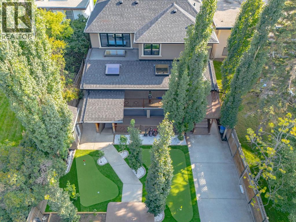 This extraordinary custom estate offers over 5,200 sq. ft. of total living space, situated on a massive 179' deep lot, plus more than 1,100 sq. ft. of covered outdoor areas, all with sweeping views of the Bow River and downtown skyline. From the foyer, the craftsmanship is immediately evident with over 8,000 board feet of maple millwork, solid maple doors, Brazilian walnut floors, and exotic hardwoods such as tiger wood, bird’s-eye maple, ebony, kaiju, walnut, and cherry, all installed by master artisans. The main floor offers a front-facing primary bedroom with a private ensuite with jetted shower and tub, and in-floor heat. A formal dining space or office, and a showpiece kitchen appointed with a Wolf gas range, Sub-Zero fridge, Bosch dishwasher, walk-in pantry, curved cabinetry, beveled granite counters, and a custom removable island table. The adjoining living room is anchored by a fireplace and opens seamlessly to expansive covered decks with cedar ceilings and stamped concrete, creating year-round indoor-outdoor living. Upstairs, four bedrooms include two full primary suites with fireplaces and spa-inspired ensuites, while the main retreat enjoys a sitting area, walk-in closet, heated floors, jetted tub, and steam shower. Another primary bedroom with an ensuite, two additional beds with a jack-and-jill bath, one with a built-in fireplace, a wet bar, which leads out to the balcony with skyline views, and a laundry room complete the second level. The fully developed walk-out/walk-up basement offers a recreation room, kitchenette, two more bedrooms, and two bathrooms, all warmed by in-floor heating with direct access to covered patios. Outside, six distinct decks and patios surround the real-stone exterior, complemented by a finished four-car garage with skylights, a 66’ RV pad, stamped-concrete driveway, and rear alley access with space for lots of vehicles. Recent upgrades include a new roof, downspouts, custom putting green landscaping, and central A/C (2025), while a pre-poured foundation provides a ready-to-build addition (with city of Calgary Permit Approval). Surrounded by multi-million-dollar homes and set directly across from downtown Calgary, this rare riverfront property combines artisanal detail, scale, and location in a way that defines luxury living. Nestled just steps away from parks, trendy restaurants, and bars, this residence provides a serene escape in the vibrant Kensington district. Its proximity to the Bow River, downtown, the University of Calgary, SAIT, and Foothills Hospital makes it ideal. With easy access to Memorial Drive and Crowchild Trail, this is your opportunity to call this magnificent property your own. Don't hesitate to call today! (id:55577)