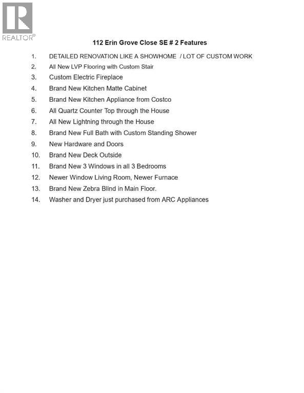 DETAILED RENOVATION LIKE A SHOWHOME | LOT OF CUSTOM WORK | All New LVP Flooring | Custom Electric Fireplace | Brand New Kitchen Matte Cabinet | Brand New Kitchen Appliance from Costco | All Quarzt Counter Top through the house | Custom Standing Shower | New Hardware and Doors | Brand New Deck | Brand New 3 Windows in all 3 Bedrooms | Newer Window Living Room | Newer Furnace | Brand New Zebra Blind in Main Floor. Welcome to #2, 112 Erin Grove Close SE, a 3 bedroom 1.5 bath two-storey townhome nestled in the heart of Calgary’s Erin Woods community. This home has been fully renovated from top to bottom with premium materials, exceptional craftmanship, functional and style. Luxury vinyl plank floor throughout the house, brand new bedroom windows, brand new kitchen cabinets brand new appliances and bathroom amenities, new deck. Back lane is accessible with one assigned parking slot, and lots of parking right in front of the house. On entering the main foyer, you will find a bright living room, with large windows and a stylish fireplace providing a cozy and modern feel. Kitchen has been fully renovated with quartz counter top, with a large windows overlooking the deck and backyard. Upstairs boasts 3 good sized bedrooms and a full bathroom with modern lights and standing shower. The basement is spacious and not finished, awaiting your personal touch. Located in the tranquil Erin Woods neighborhood, this home is just minutes from schools, parks, shopping, and offers easy access to Deerfoot and Stoney Trail, making commuting a breeze. The area is known for its quiet streets and abundance of green spaces—ideal for families and outdoor enthusiasts. Affordable and move-in ready, this house is a gem and can't be missed. Book your showing today before it's gone. (id:55577)