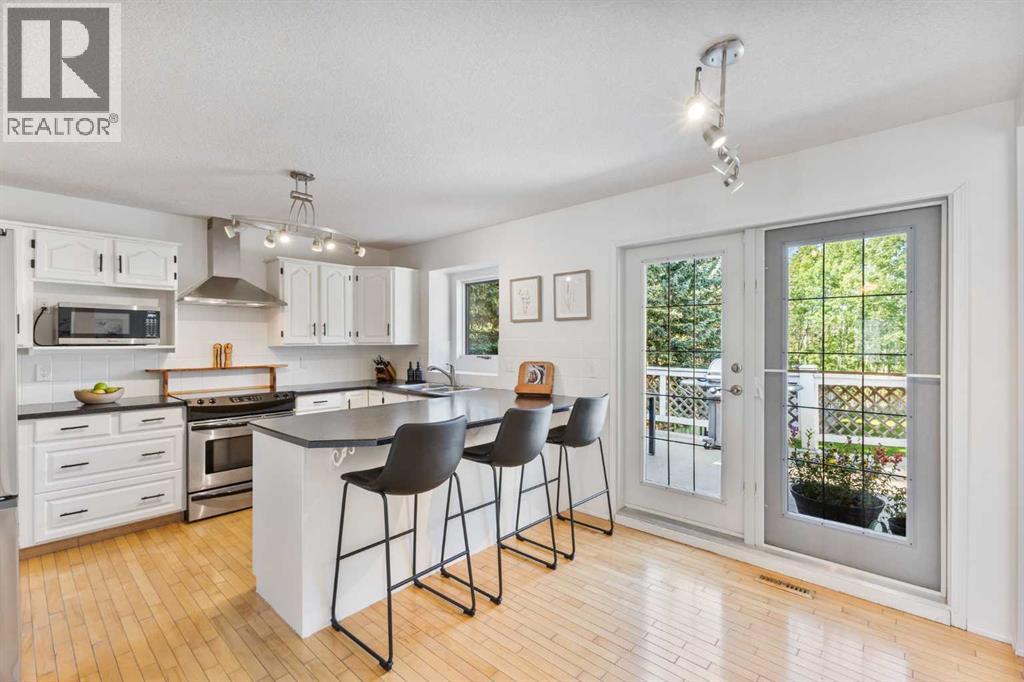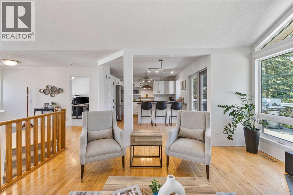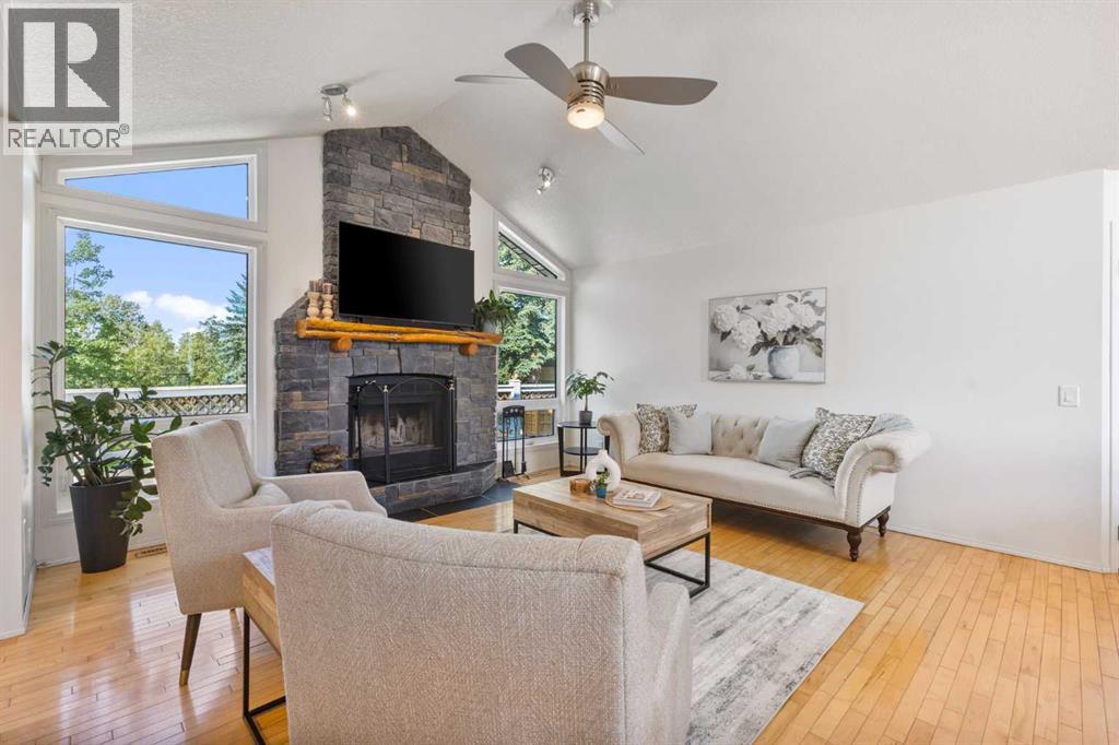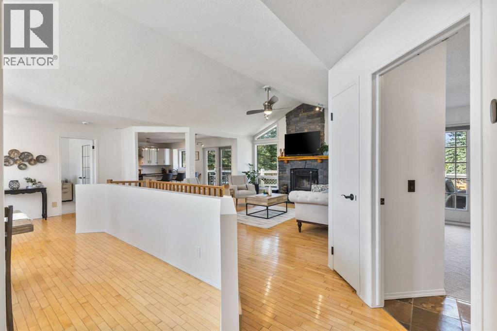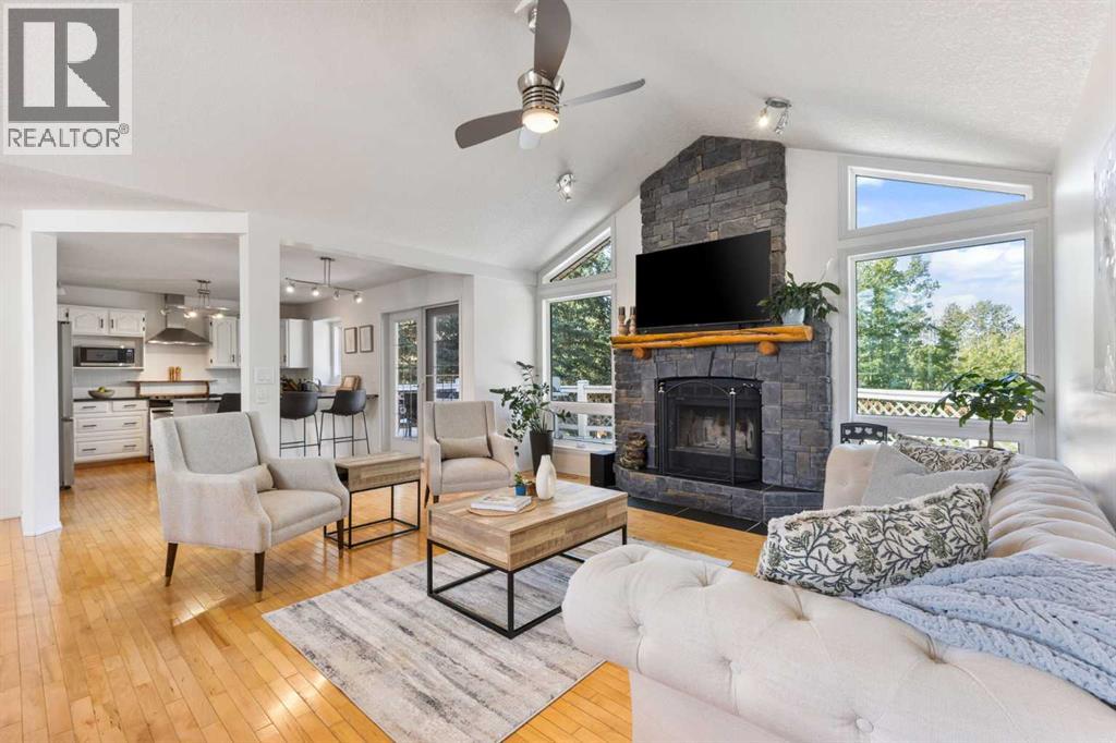 Truly one-of-a-kind, this exceptional walkout bungalow is more than a home—it’s a feeling, a lifestyle, and a rare opportunity in the heart of Cochrane. Perfectly set on an expansive lot, it captures the best of both worlds: the serenity of the river pathway system and Bow River just steps from your backyard, and the energy of historic downtown with its shops, cafés, and restaurants only minutes away. From the moment you arrive, this home welcomes you with undeniable character. An 800-square-foot triple garage and an elegant stamped concrete driveway set the tone, while inside, soaring vaulted ceilings and a dramatic stone wood-burning fireplace create a sense of warmth and grandeur. Freshly painted throughout, the interiors feel light, renewed, and ready for their next chapter. The updated kitchen blends timeless style and function with crisp white cabinetry, modern hardware, and newer stainless steel appliances, while the cheerful breakfast nook opens onto a west-facing deck bathed in afternoon sun. Surrounded by mature trees with no rear neighbors, this outdoor space is private, peaceful, and seamlessly connected to pathways leading to parks, disc golf, and the river valley. Every corner of the main floor tells a story of comfort and intention. Sunlight pours into the dining room through picture windows, while the versatile office provides the perfect space to work or host. The primary retreat feels like its own sanctuary, offering dual closets, private deck access, and a spa-inspired ensuite with a soaking tub, tiled shower, and dual vanities—perfect for unwinding at the end of the day. Downstairs, the walkout level is designed for connection. The spacious family room invites you to gather around a brick-faced wood-burning fireplace, a natural centerpiece for laughter, late-night conversations, and cozy winter evenings. Just beyond, the cedar-lined sunroom is pure magic—a space that carries the calming scent of cedar and blurs the line between indoors and out. W hether imagined as a hot tub or sauna retreat, a reading nook, a gardener’s haven, or a creative studio, it’s a space that invites you to pause, breathe, and escape. Three additional bedrooms, a full bathroom, and a laundry room complete this level, making it as functional as it is inviting. Step outside and you’ll discover a lot that feels almost limitless. It’s a canvas for your outdoor dreams—whether entertaining, gardening, or simply enjoying time with family. With space to park an RV, an oversized garage with 220-volt wiring, and in-floor heating on the lower level, practicality is woven seamlessly into the property’s charm. Additional highlights include new windows in the living room and garage, new vinyl plank flooring in the lower bedrooms, a 5-zone sprinkler system, security system, and LED lighting in both the sunroom and garage.. With its unmatched location, timeless character, and endless possibilities, this home is more than a place to live—it’s a place to belong. (id:55577)