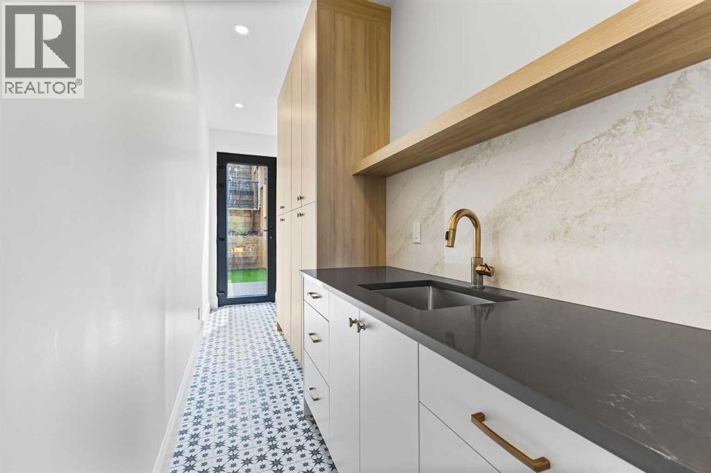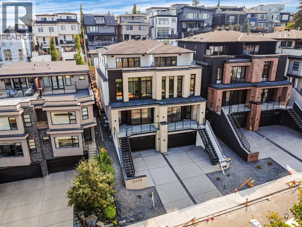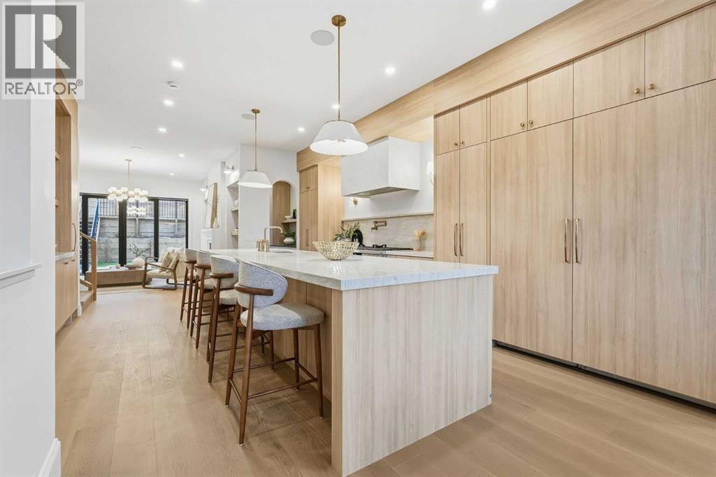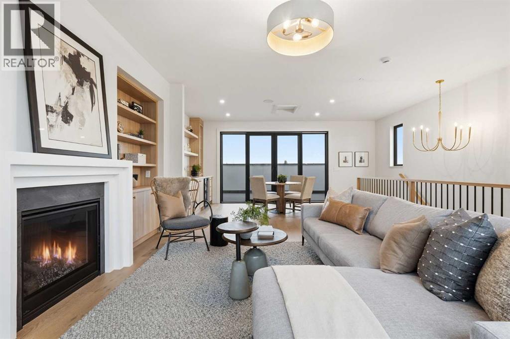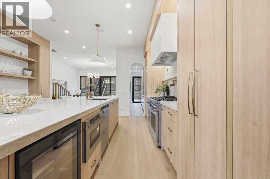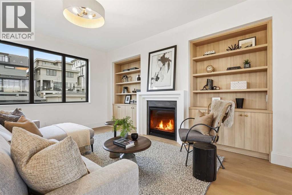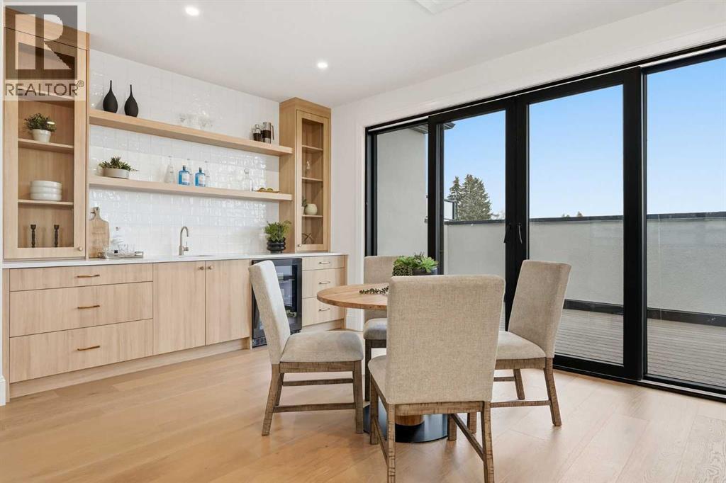 Experience quiet luxury at its finest in this stunning three-storey home, set on one of the highest points in Calgary with uninterrupted skyline views from all levels, and steps from Marda Loop. The exterior makes a striking first impression with its blend of classic white brick detailing, black accents, and timeless stucco. The curb appeal is enhanced by clean glass railings, low-maintenance landscaping, and a welcoming front balcony. Step into a beautiful and functional foyer, complete with custom built-in millwork, a bench, and smart storage including hanging compartments, open shelving, and pull-out drawers. The open-concept design includes a dedicated dining area surrounded by massive sliding doors that lead to the balcony. This is styled for intimate dinners, elevated entertaining, or just enjoying a coffee with stunning skyline views.At the heart of the home, the chef’s kitchen is a true masterpiece. It features a 14-foot island with quartz from Hanstone (made in Canada), a quartz backsplash, plaster textured hood fan, pot filler, and oversized premium appliances including a 48” dual oven gas range and a 66” built-in fridge/freezer. There is a butler’s pantry with sink and cabinetry, mud room, coffee bar, and tons of storage including under the island. The kitchen is set up to be not only beautiful but also functional and includes a garbage drawer, bar cooler, and spice racks/cabinetry. Across from it, the living room centers around a beautiful fireplace and custom built-ins which make it cozy, refined, and made for real living. Large doors lead to the deck and the sunny south facing backyard, that is tiered, turfed and truly low maintenance. Throughout the home, you’ll enjoy tons of natural sunlight from the large windows, 10-foot high ceilings, arched transitions, and wide-plank engineered hardwood create a warm and elevated flow.Upstairs, the primary suite is a serene retreat with a spa-like ensuite featuring a steam shower, dual vanity, custom tilew ork, and skyline views. Secondary bedrooms are generously sized, each with walk-in closets, and connected by a stylish bathroom ideal for kids or guests.The third level includes a beautiful rooftop patio where you can soak in the skyline views, a stylish bathroom with nice finishes, a rec/living area with built-in storage and a gas fireplace. There is a large wet bar with LED lighting in the cabinetry, beatiful tile, shelves and bar fridge. This is the ultimate entertaining area to host friends and family.The fully finished basement extends the living space with heated floors roughed-in, a large flex room or guest suite, and full bathroom. Additional features include a heated double attached garage with epoxy flooring, integrated speakers and security system, central A/C, roughed-in heated driveway.Whether you're enjoying a quiet morning in the sun, hosting friends on the rooftop, or watching the city light up at night, this home was built for a lifestyle that’s elevated and timeless. (id:55577)