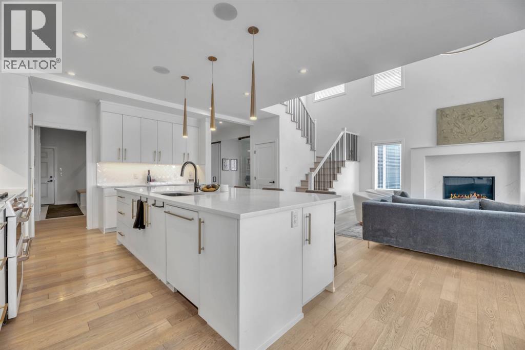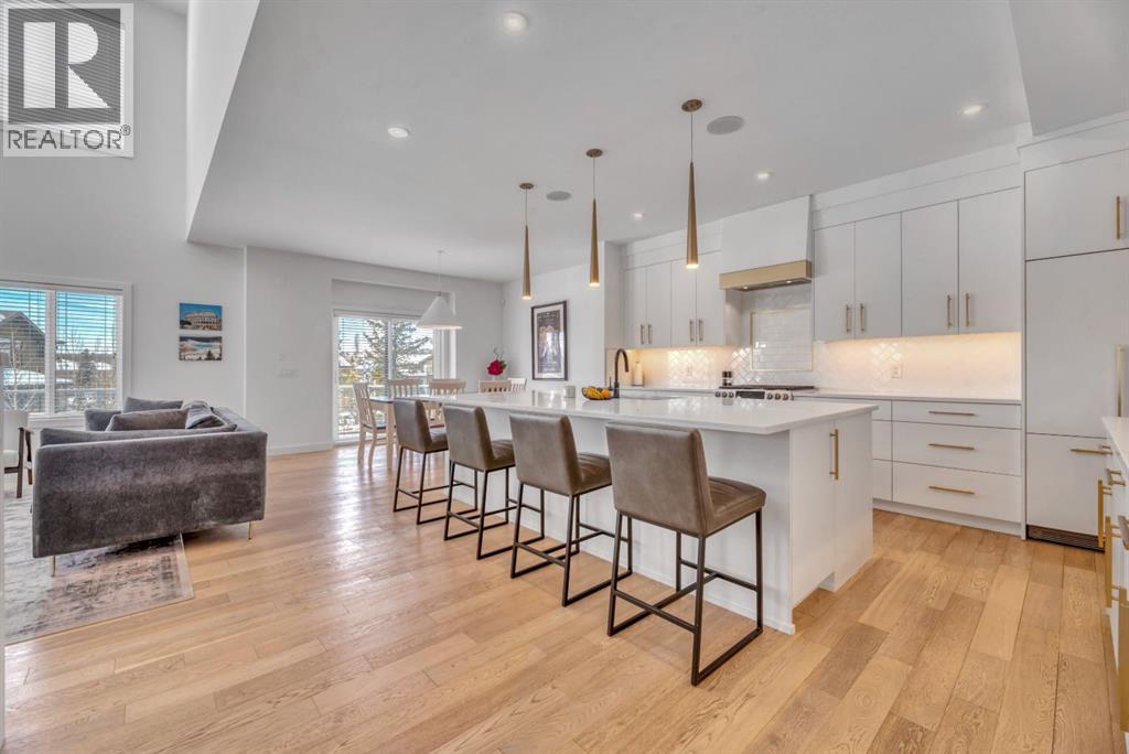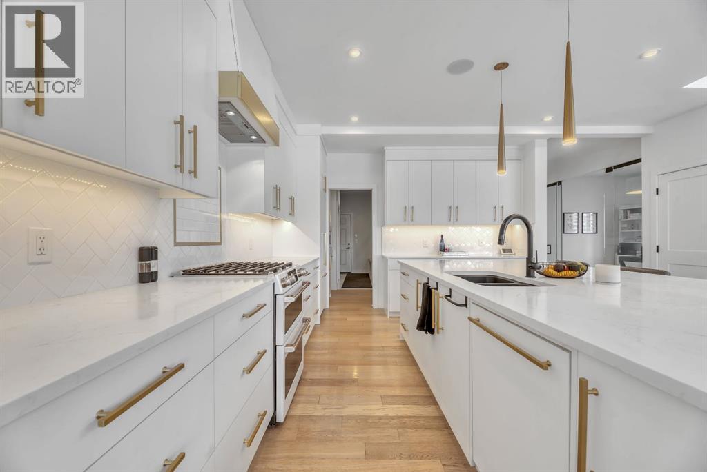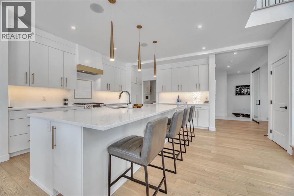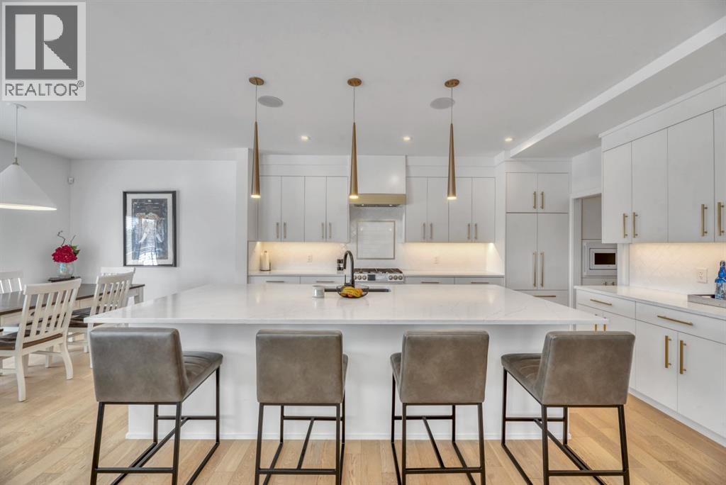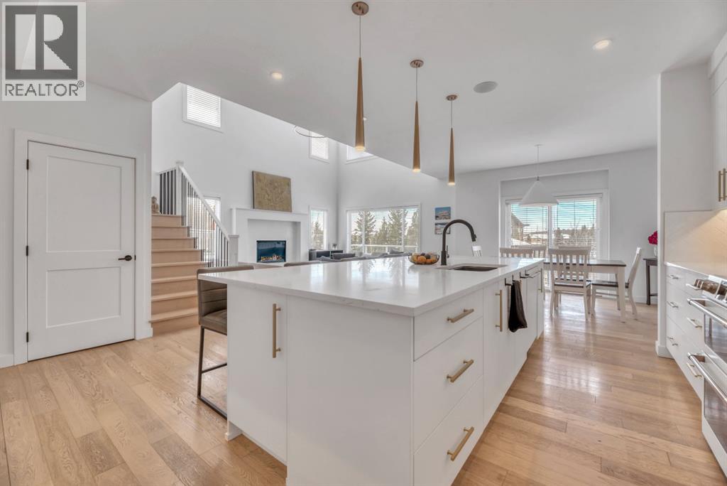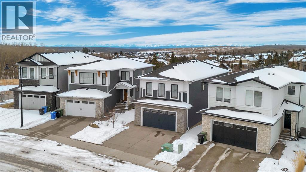 Welcome to an exceptional offering in the prestigious community of Springbank Hill, where elevated design meets everyday function in this stunning 2,806 sq ft + fully finished walkout home backing onto a natural ravine & pathway system with MOUNTAIN VIEWS. From the moment you arrive, the home impresses with a spacious entry & refined finishes throughout, inc. white oak hardwood flooring. A private front den, enclosed by sleek panel glass doors, provides the perfect home office space. The heart of the home is the breathtaking open-to-above great room, anchored by a large scale framed fireplace, while expansive windows flood the space with light & showcase the tranquil ravine views. The designer kitchen is both sophisticated & functional, with white flat-panel cabinetry, matte gold hardware, custom panel French door fridge and dishwasher, Cafe collection 6 burner gas range with double oven and a custom hood fan. A brilliant mix of modern & traditional elements with a blend of herringbone with gold trimmed subway tile niche & a beautifully patterned white quartz counter. Thoughtfully designed pantry shelving, small servery with microwave-cabinet & a well-appointed mudroom elevate everyday convenience. Step outside to your full-width upper deck, the perfect setting to unwind while enjoying uninterrupted views & privacy. Upstairs, the home continues to impress with a vaulted front bonus room featuring a full wall of shelving, along with a well designed laundry room with built-in storage & wash sink. The primary retreat is a nice sanctuary, offering stunning mountain views, a spa-inspired ensuite with separate vanities, a freestanding oval tub, a fully tiled shower with bench & body sprays, & a fabulous walk-in closet with smart built ins. A well-appointed second bath features dual sinks, storage and 2 additional perfect sized bedrooms makes this upper floor an ideal layout. The fully developed walkout basement is designed for both lifestyle & wellness, featuring chevron- laid white oak hardwood flooring, a fantastic rec room space - perfect for a home theatre/games room, & a private gym with full mirror wall, specialized flooring, & glass partition. A spacious fourth bedroom & full 3 pc bath with tiled shower complete this level. Additional features include central air, water softener, & built-in speakers throughout. Outdoors, the professionally landscaped yard with irrigation blends seamlessly into the surrounding environment, offering a rare private setting. Located in one of Calgary’s most sought-after Westside communities, this home offers access to some of the city’s top-rated schools, inc. Webber Academy, Calgary Academy, Rundle College, Ernest Manning and Griffith Woods School. Enjoy quick access to Aspen Landing, Westside Recreation Centre, boutique shopping, dining, paths, major routes and only 15 mins to downtown. This is a rare opportunity to own a modern yet warm & inviting, impeccably finished walkout home in an amazing location. (id:55577)