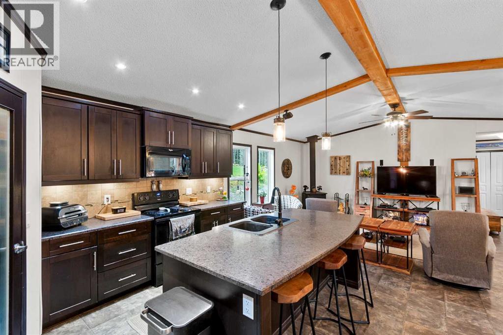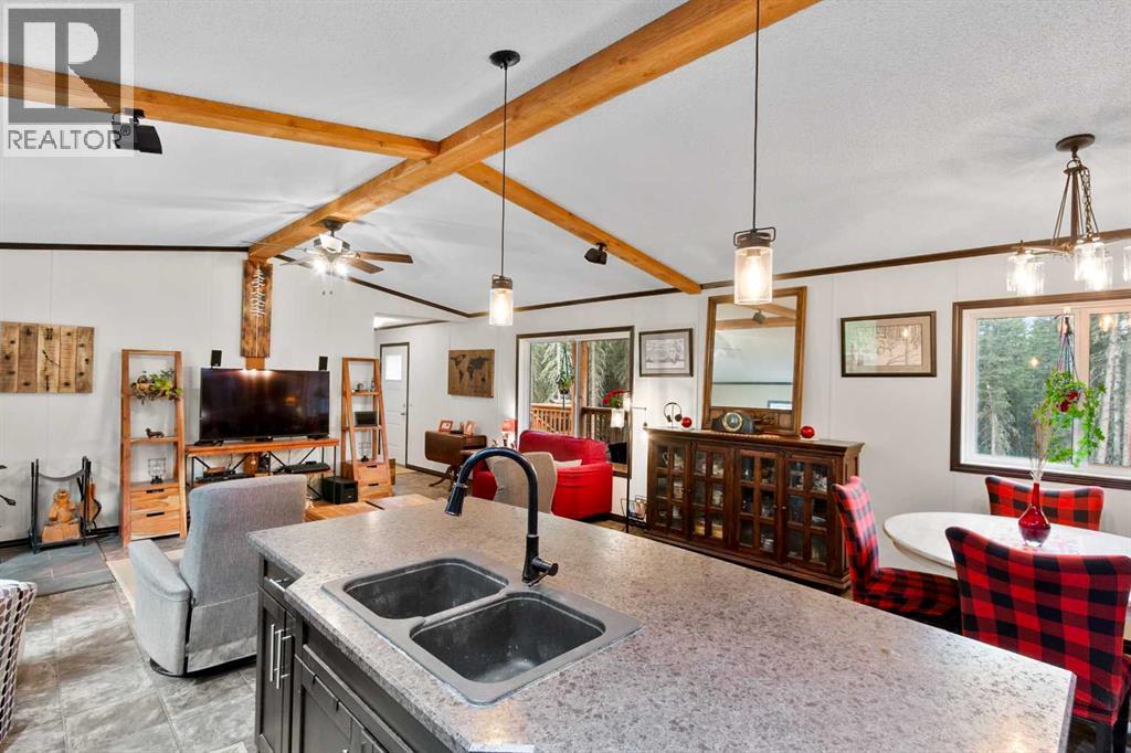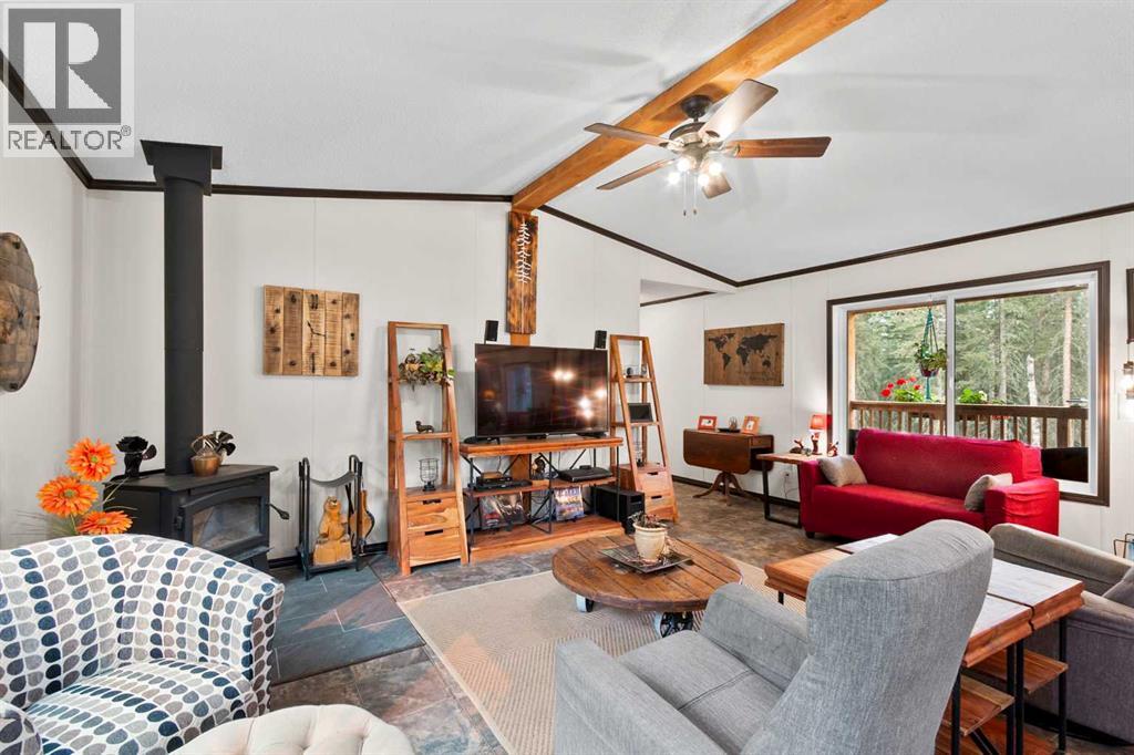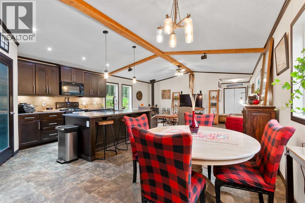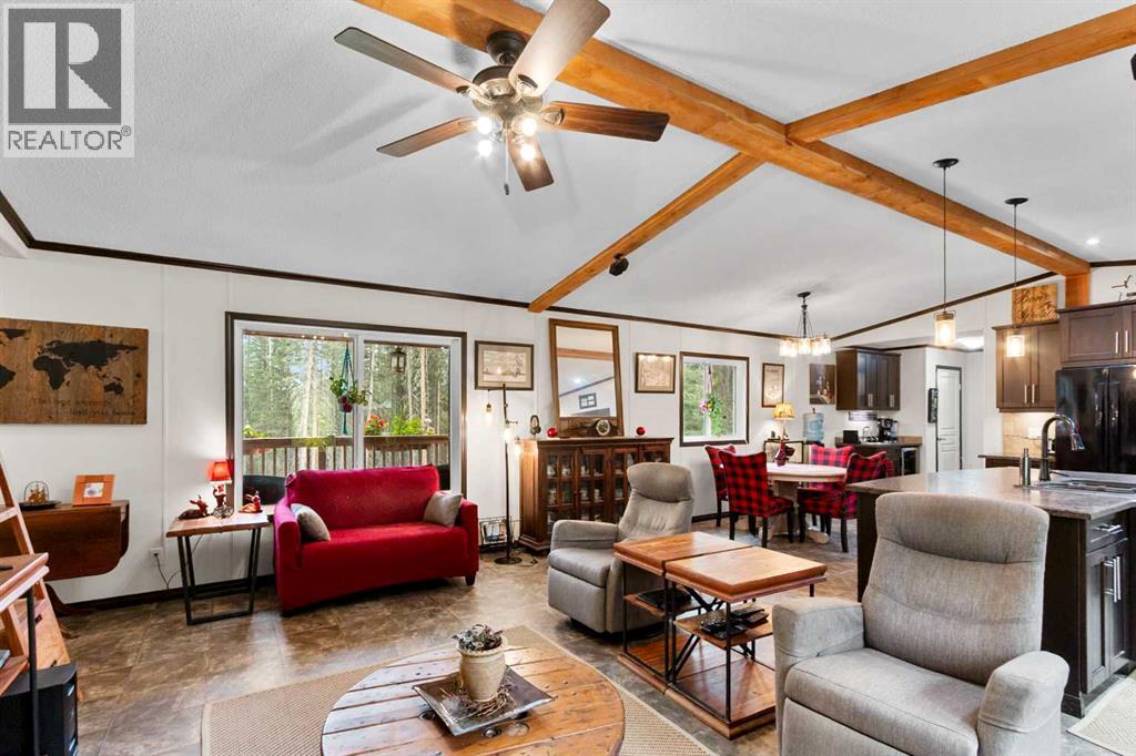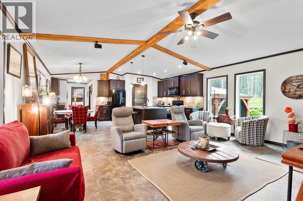 Set on a beautifully TREED SETTING, this 1,472 sq ft modular home offers the space and lifestyle acreage buyers crave. The OPEN-CONCEPT living area is warm and inviting, anchored by a WOOD BURNING FIREPLACE, exposed WOOD BEAMS & room to gather comfortably. A generous dining area flows into the functional kitchen featuring a center ISLAND, a COFFEE BAR and a large WALKTHROUGH PANTRY with convenient access to the laundry room and secondary entry, perfect for country living. The thoughtfully designed floor plan provides separation and privacy, with the primary suite tucked away on its own wing, complete with a walk-in closet and 4-piece ensuite. Two additional bedrooms and a second 4-piece bathroom are located on the opposite side of the home, ideal for family, guests, or a home office. Outside, enjoy wide-open space surrounded by forest, a DETACHED DOUBLE GARAGE, and a large WRAP AROUND DECK with pergola—an ideal spot to relax, entertain, and take in the peaceful, private setting that acreage living is all about. Additonally there is a Greenhouse, Wood Shed, and Hot Tub included with the property. You will love the PRIVACY of being at a dead end road and you cant beat the location being walking distance to the Little Red Deer River & community of Water Valley. Start living you Country Dream Life Today !! (id:55577)