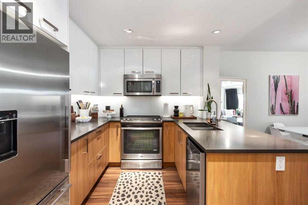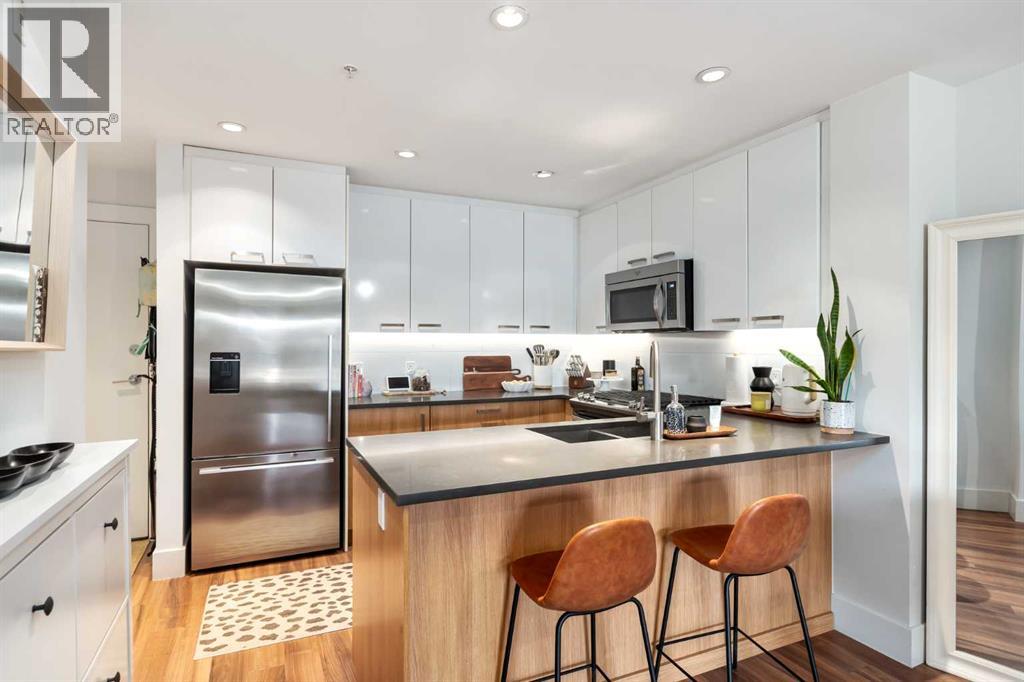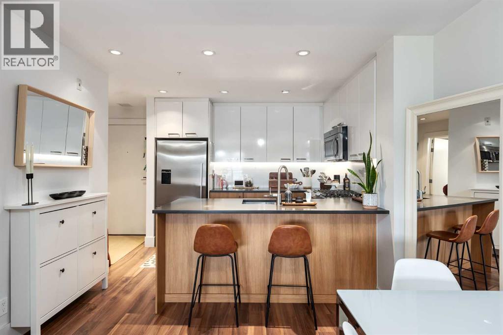Welcome to this bright and spacious 1-bedroom home in the heart of vibrant Bridgeland. This thoughtfully designed unit features an open-concept layout with a well-defined dining area that flows seamlessly into the living room—perfect for both everyday living and entertaining.The modern kitchen is equipped with quartz countertops, a gas range, and full stainless steel appliances, offering both style and functionality. Large windows fill the space with natural light, leading out to a southeast-facing balcony with stunning views of downtown.The generously sized bedroom includes a walk-through closet that connects directly to the bathroom, complete with a bathtub. Additional highlights include in-suite laundry, an underground parking stall, and a separate storage locker.This pet-friendly building offers excellent amenities such as a fully equipped gym and convenient bike storage. Located just steps from Bridgeland’s shops, cafes, parks, and transit, this home combines urban living with comfort and convenience. (id:55577)