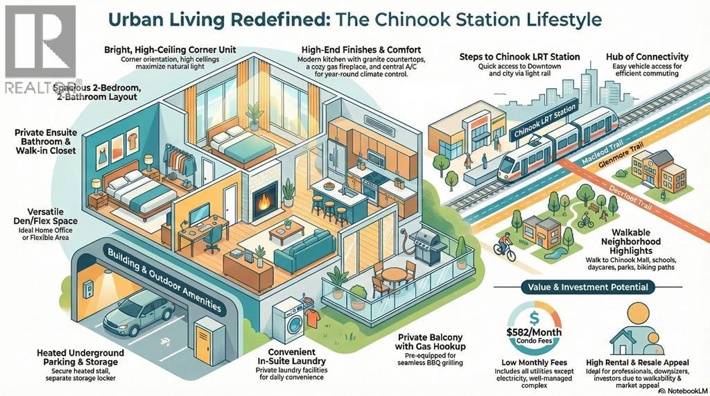 RARE Spacious 2 bedroom, 2 bathroom + Den layout *** ENSUITE bathroom and WALK-IN closet in primary bedroom *** Newer Dishwasher, Stove, and Microwave Hood Fan (Approximately 3 Years Old) *** BRIGHT corner unit with natural light *** HIGH CEILINGS *** Gas fireplace *** Central A/C *** GRANITE countertops *** In-suite laundry *** Balcony with gas BBQ hookup *** HEATED UNDERGROUND PARKING and SEPARATE STORAGE Locker, Both Forming Part of the Condo Unit Title. *** Low Condo Fees - $582/month *** All UTILITIES INCLUDED Except Electricity *** Well-managed and well maintained complex *** Steps to CHINOOK LRT station *** Quick Access to Downtown *** Easy Access to Macleod Trail, Glenmore Trail, and Deerfoot Trail *** Walking distance to Chinook mall *** Nearby parks and green spaces *** Walking and biking paths *** Close to SCHOOLS and DAYCARES *** Excellent walkability and transit access *** Strong long-term rental appeal (id:55577)