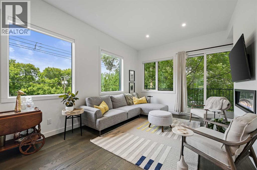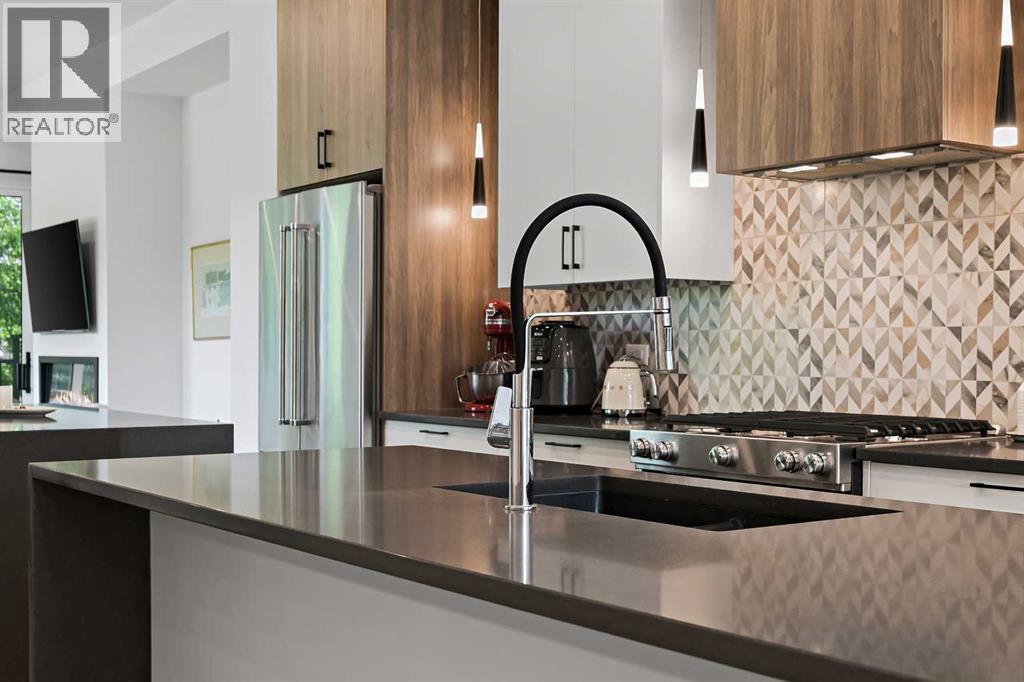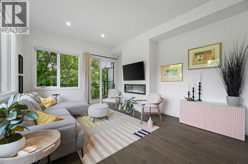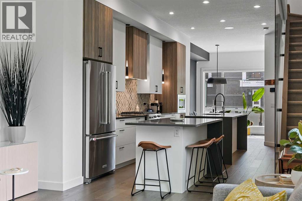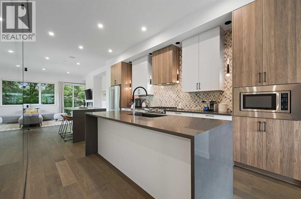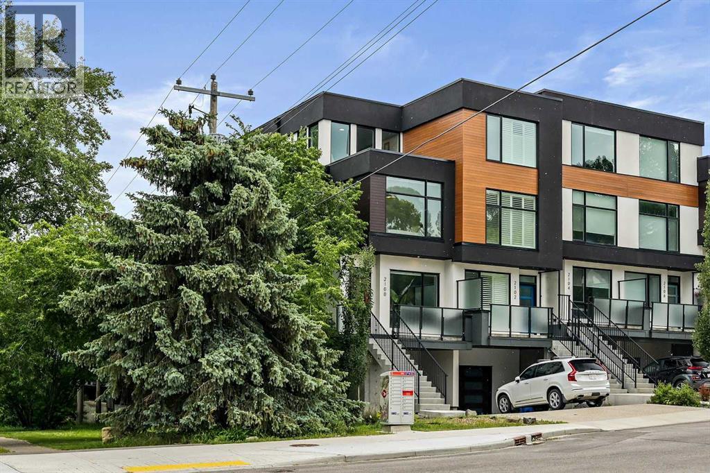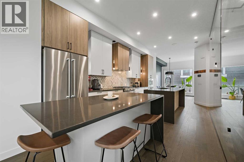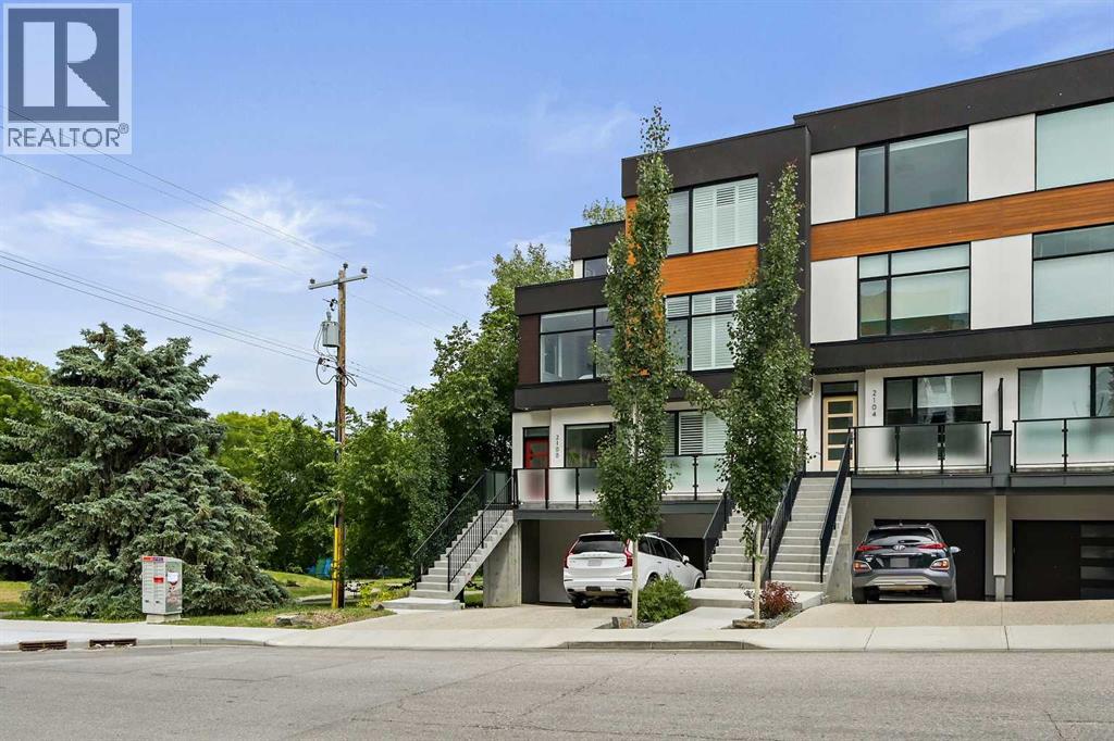 LUXURY. CONVENIENCE. COMMUNITY.Welcome to 2100 17A Street SW – a sophisticated urban retreat just steps from the energy and vibrancy of 17th Avenue. This beautifully designed end-unit luxury townhouse seamlessly blends upscale finishes, modern comfort, and low-maintenance living in the community of Bankview. From the moment you arrive, you'll notice the high-end upgrades and attention to detail that set this home apart. Key features include: A heated tandem garage with in-floor heating and parking for 3 vehicles (2 in the garage + large driveway), end unit backing onto a park for added privacy and green space, Soaring 10’ ceilings on the main level and 9’ ceilings on the upper level, spacious roof top patio. The main floor offers open-concept living ideal for both relaxing and entertaining. The gourmet kitchen is a true showpiece, featuring dual quartz waterfall islands, premium stainless steel appliances, and custom cabinetry. The living area is anchored by a sleek electric fireplace and opens to a private patio—perfect for morning coffee or evening cocktails. Upstairs, the primary suite is a private sanctuary with custom built-ins, a spa-inspired ensuite, and a walk-in closet. A spacious second bedroom, full bathroom, and a large, well-appointed laundry room complete this level. On the top floor, discover a versatile loft/bonus room—perfect as a home office, fitness space, or even a third bedroom. Step outside onto your expansive terrace, an ideal space for entertaining under the stars and taking in the city skyline. The developed lower level walks out to a private fenced backyard surrounded by mature trees—an unexpected oasis offering tranquility and privacy in the heart of the city. Located just steps from trendy shops, top-rated restaurants, cozy cafés, and minutes from the downtown core, this home delivers the ultimate in walkability and urban lifestyle. Don’t miss this rare opportunity to own a truly luxurious inner-city townhome. (id:55577)