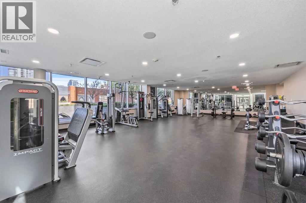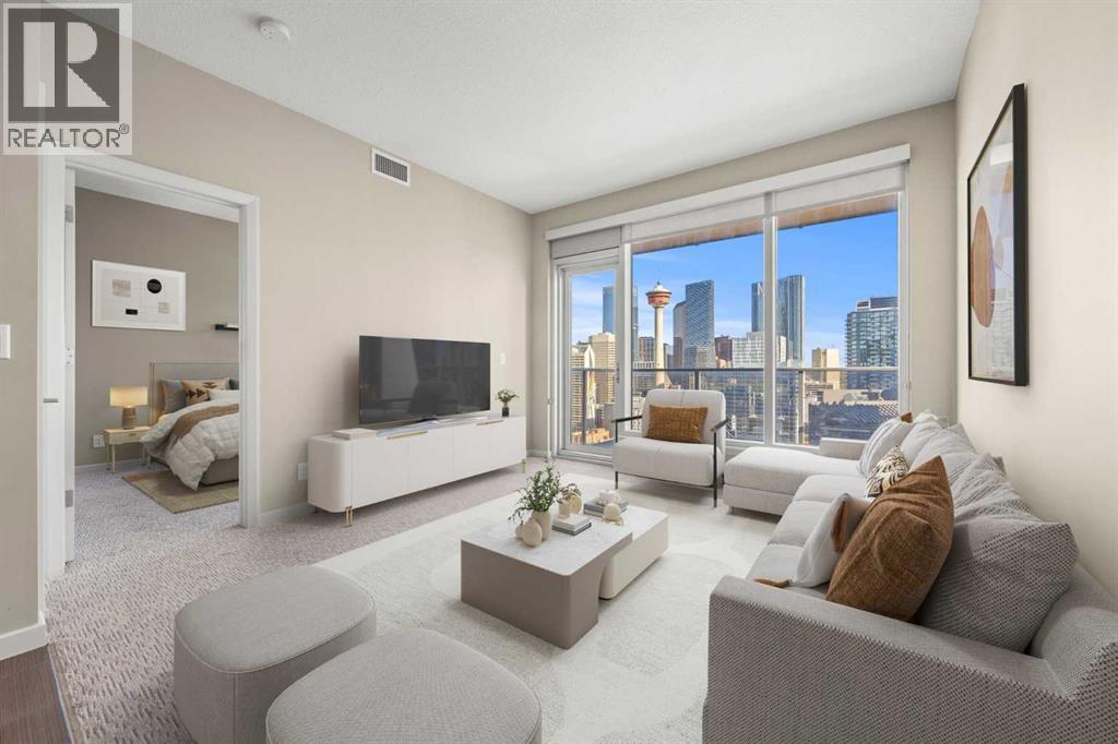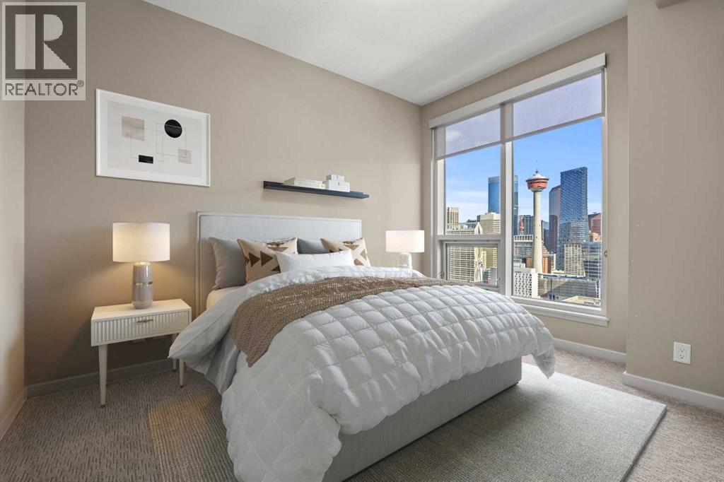 Experience downtown living at its finest in this beautifully designed 2 bed, 2 bath condo located in the heart of Calgary’s vibrant core. Offering nearly 800 sq ft of thoughtfully planned space, this unit blends style, comfort, and convenience—perfect for professionals, roommates, or those looking to downsize without compromising on location or function. Step inside to discover a bright and open living area with floor-to-ceiling windows that flood the space with natural light and showcase amazing city views. The modern kitchen is equipped with stainless steel appliances, quartz countertops, and sleek cabinetry, all seamlessly integrated into the open-concept layout that makes entertaining or relaxing feel effortless. Both bedrooms are strategically located on opposite sides of the unit, providing excellent privacy. Each features a walk-through closet and direct access to a full bathroom—ideal for shared living or hosting guests. The spacious primary bedroom includes a private 4-piece ensuite, while the second bedroom connects to the main bathroom, which also offers a secondary entrance from the main living area. Brand new carpets add a fresh, updated feel, complementing the durable tile flooring and bringing warmth to the bedrooms. Comfort is top of mind year-round thanks to central A/C, and in-suite laundry ensures everyday convenience. This well-managed building offers excellent amenities including a fully equipped fitness centre and a sunny outdoor courtyard—perfect for morning coffee or unwinding with friends. You'll also enjoy a titled underground parking stall and assigned storage for all your gear. Located steps from shops, restaurants, cafes, the river pathways, and transit, this condo offers unbeatable access to the best of downtown Calgary. Whether you're investing, downsizing, or buying your first home, this move-in-ready unit offers exceptional value and a lifestyle to match. Don’t miss your chance to call this urban retreat your own! (id:55577)