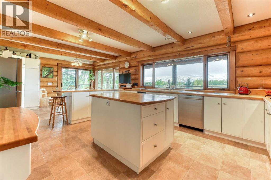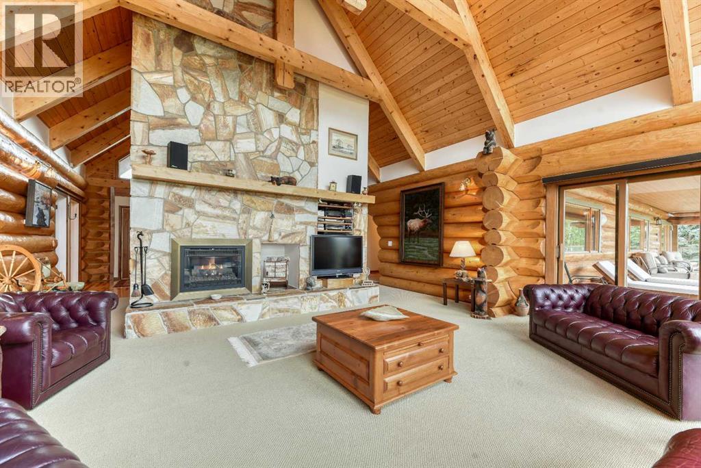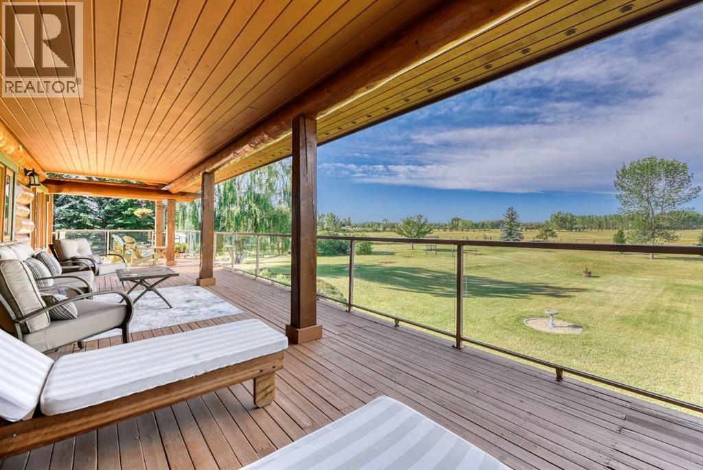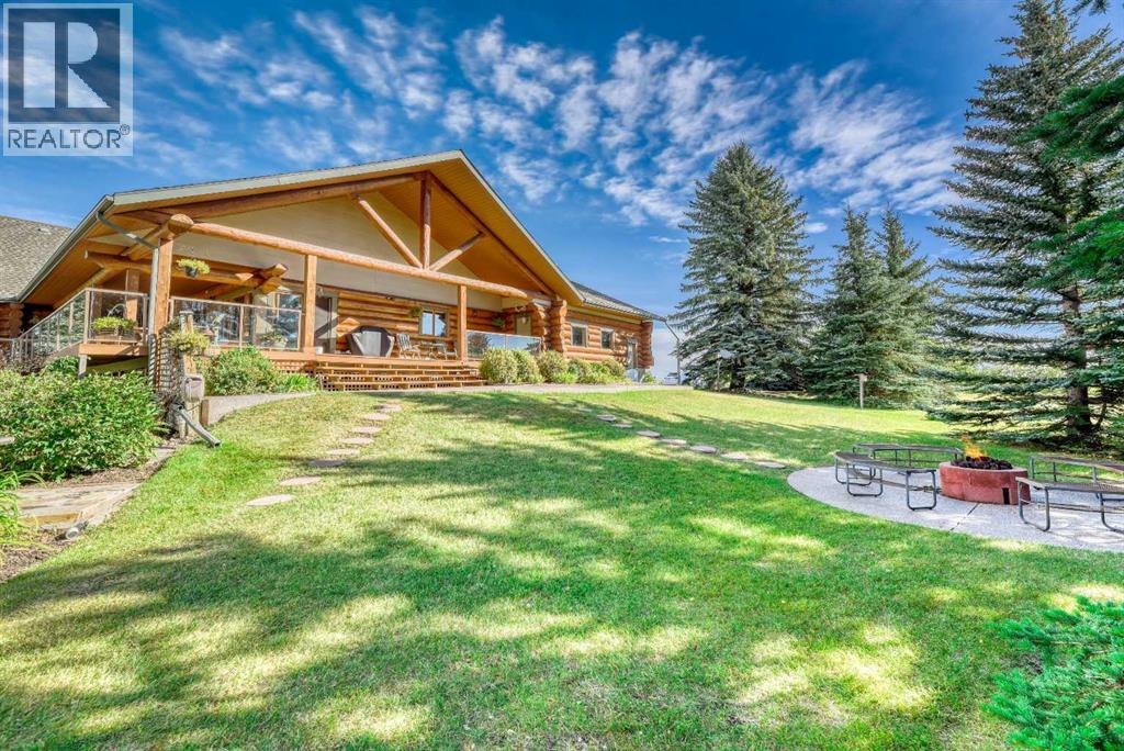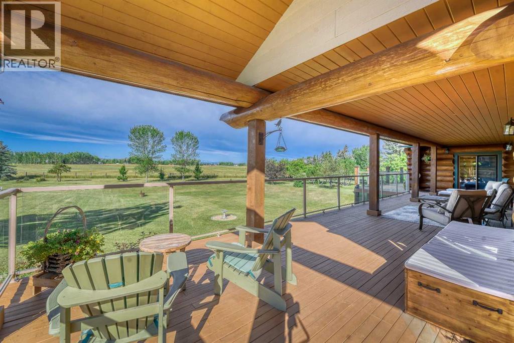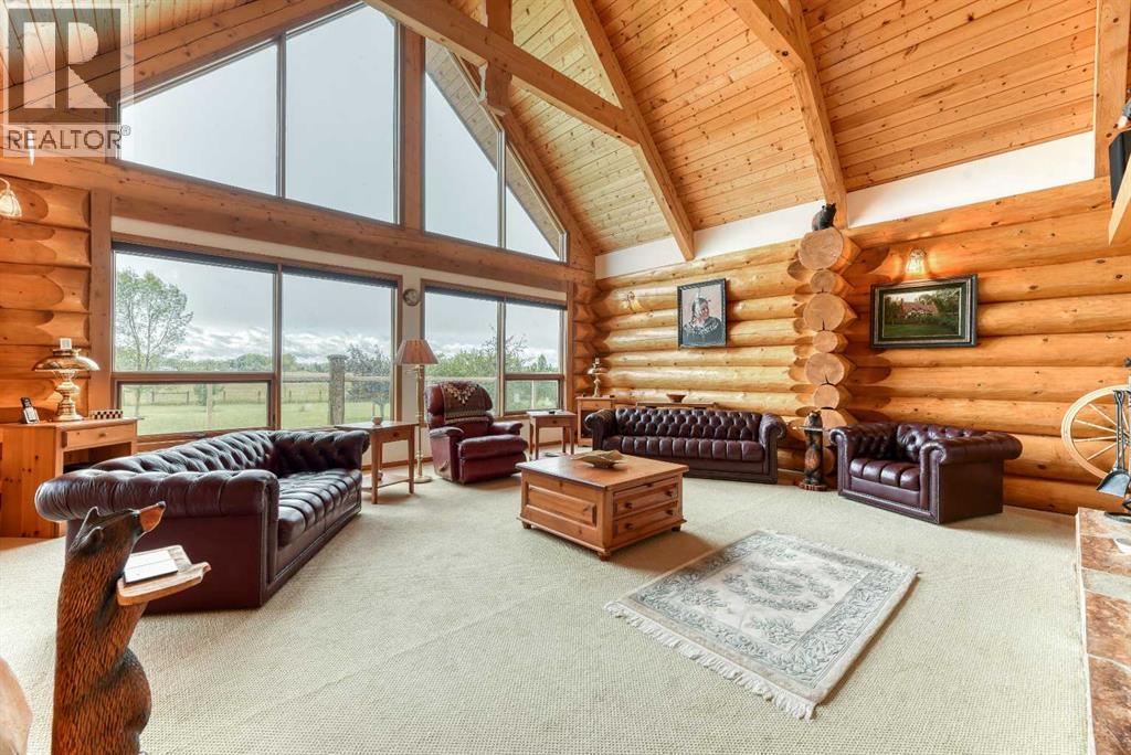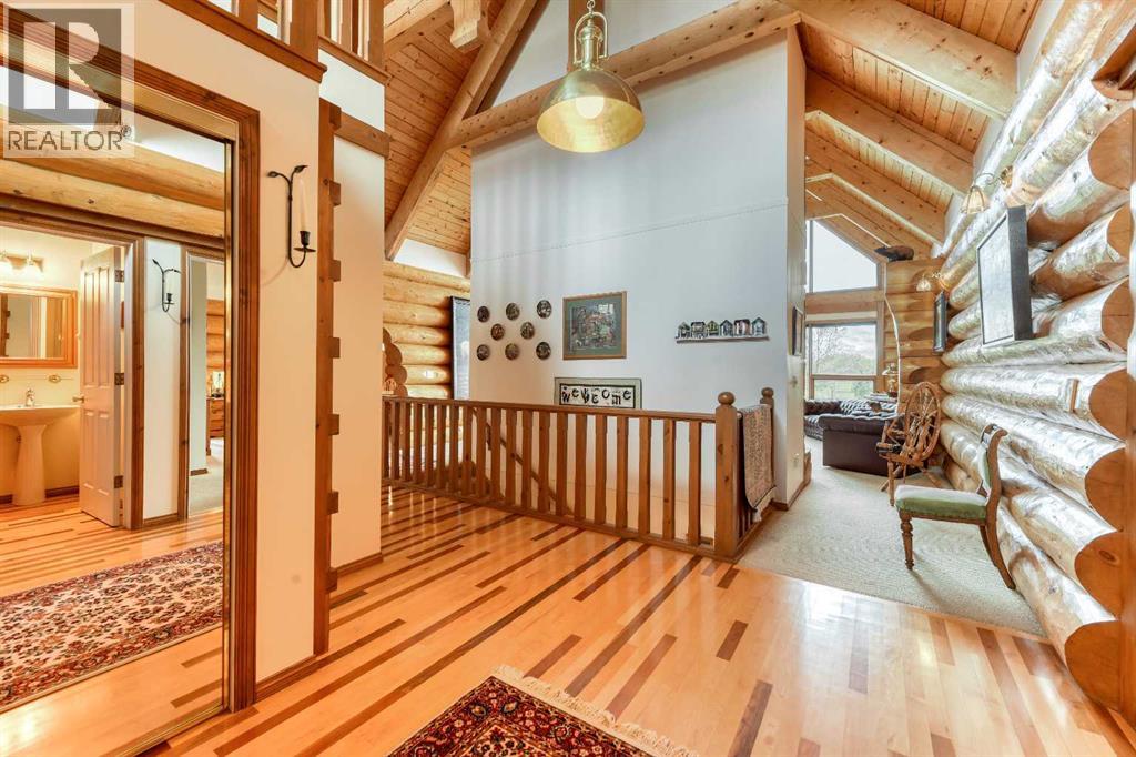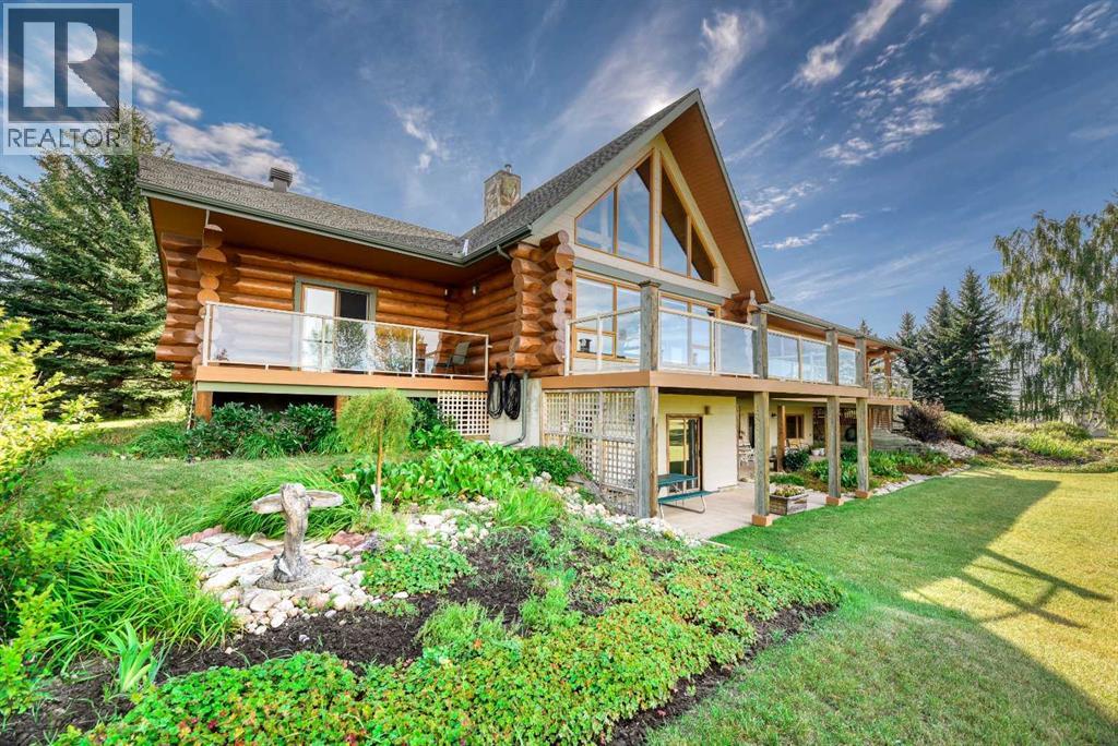 Located ten minutes from the city limits, close to shops and South Campus Hospital,this contemporary, full scribe, log home with over 6000 sq ft of living space and triplegarage, situated in East De Winton, is close to 3 golf courses (Cottonwood G&CC atthe end of the street) with access to the Bow River and world class fishing. TelsecFarms breeding and boarding horse facility is two acreages to the north. This gated,private estate, with beautiful mature landscaping, encompasses a fenced 3 acreproperty around the house with an inline gas BBQ & fire pit and a newly refurbishedgreenhouse. The rest of the 19.2 acres comprises a tree farm with approximately 200spruce trees and the balance being recently cultivated and seeded. There is aseparate gated entrance from the road to the farm side and a gate from the residentialproperty to the tree farm. This passive solar, multigenerational home, is designed tostay cooler in the summer and warmer in winter, saving on energy costs. From theenclosed front porch, the airy main level has open trusses in the great room and foyerwhere light abounds. It comprises 4 baths, 3 beds, a dedicated office (with magnificentunobstructed views of the river valley) great room with floor to ceiling stone fireplace,large dining room, kitchen (with butcher block counters) and breakfast nook, all withbeamed ceilings. Above the office is a quiet reading loft. The main level has a coveredwrap around deck from the south to the west side, offering protection from theelements and a magnificent mountain view to the west. There is also a covered deckfrom the principle bedroom. The walkout lower level, accessed by both the main andsouth staircases, is separated by a spacious mechanical room with a new watertreatment system, two furnaces and hot water on demand. To the north of themechanical room is a magnificent bar and billiard room, two good size bedrooms, a 3piece bath, wine making room with double sink, refrigerator, wine storage and coldroom and lastly a storage/exercise room. To the south end, accessed from the garage,back hall and south staircase you will find the laundry room, (with a chute from themain level), a further large bedroom with ensuite bath and walk in closet, full eat inkitchen (with patio doors), and spacious living room with floor to ceiling stone fireplace,all with big bright windows. Outside you will find a full length, west facing, privatecovered concrete patio, with beautiful rock gardens to be admired from inside and out.The lower level is serviced by underfloor heating as well as forced air from above.There is further underfloor heating on the main level to the north part of the house andPhantom screens on all patio doors, except the billiard room. (id:55577)