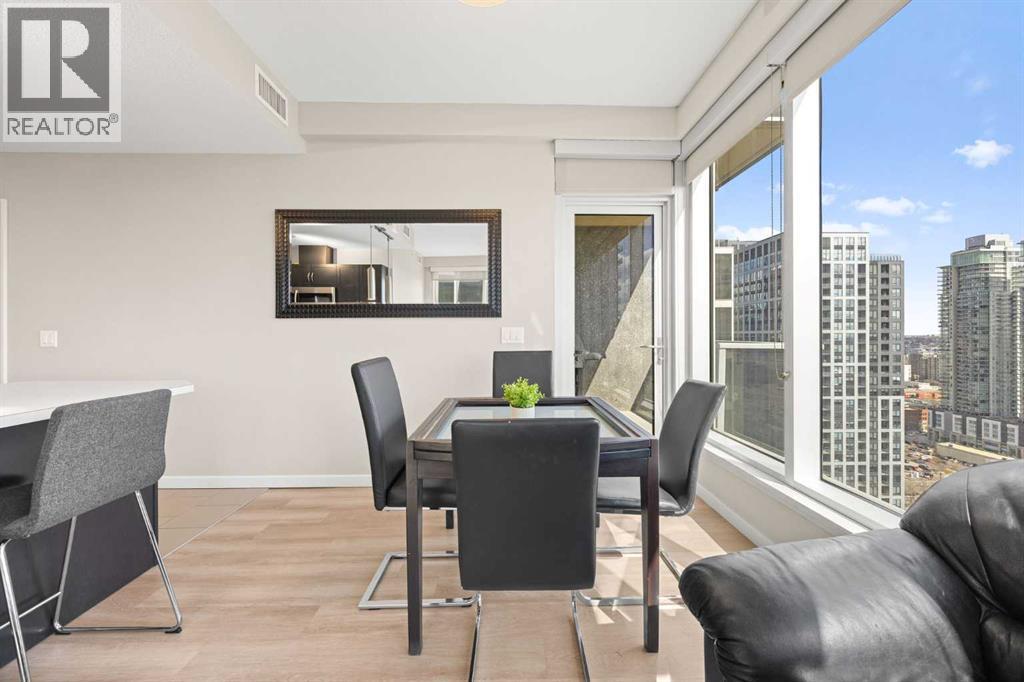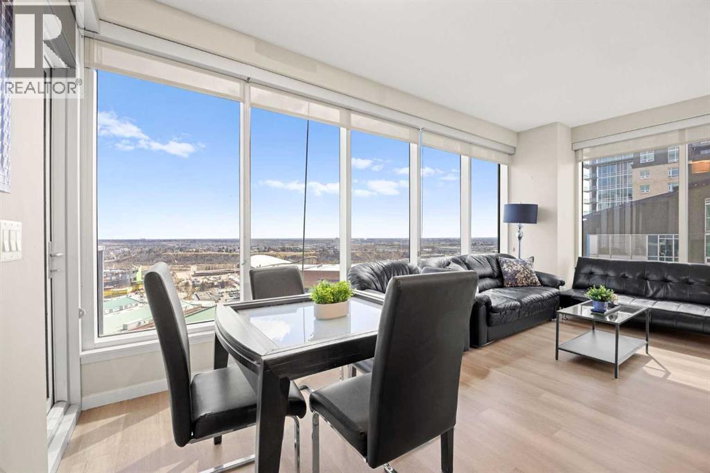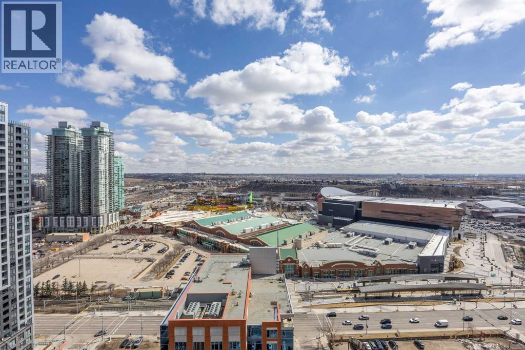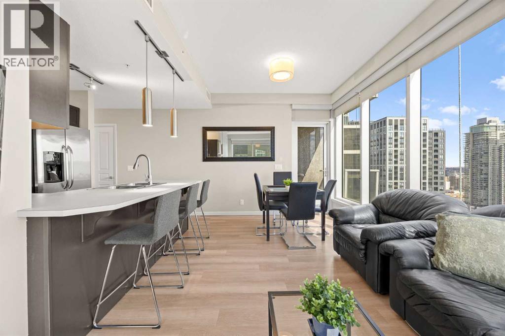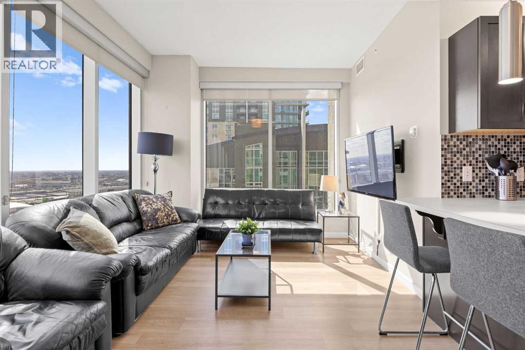 Welcome to the Alura! This bright CORNER UNIT is located on the 24tTH FLOOR and has panoramic views of the new Scotia Place, stampede grounds & the Rocky Mountains! . With an open floor plan boasting a full bank of windows to enjoy the views plus the living room which also has a patio door leading to your cover balcony and a well appointed kitchen this fully furnished home is move in ready and not to be missed. The kitchen has an extra large peninsula island with seating, tiled backsplash, white counters, stainless steel appliances and plenty of cabinets. There are 2 good sized bedrooms, which includes the primary with an ensuite and walk-in closet, the main bath, insuite laundry and a titled parking stall to complete this home. The Alura complex has much to offer from the 2 fitness centres, patio and garden areas and bike storage to the fact that it is just steps away from transit & LRT, parks, the stampede grounds, the many amenities of 17th Avenue and you can walk to work downtown! Don't miss out on this amazing opportunity! (id:55577)