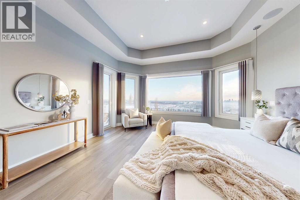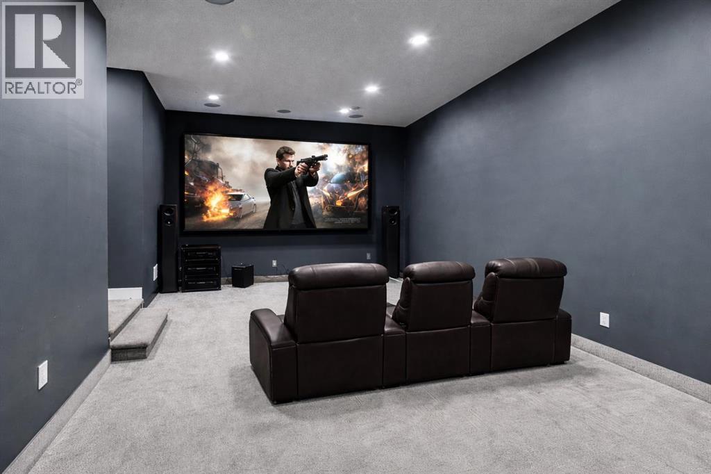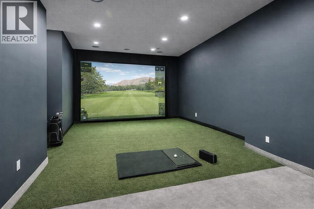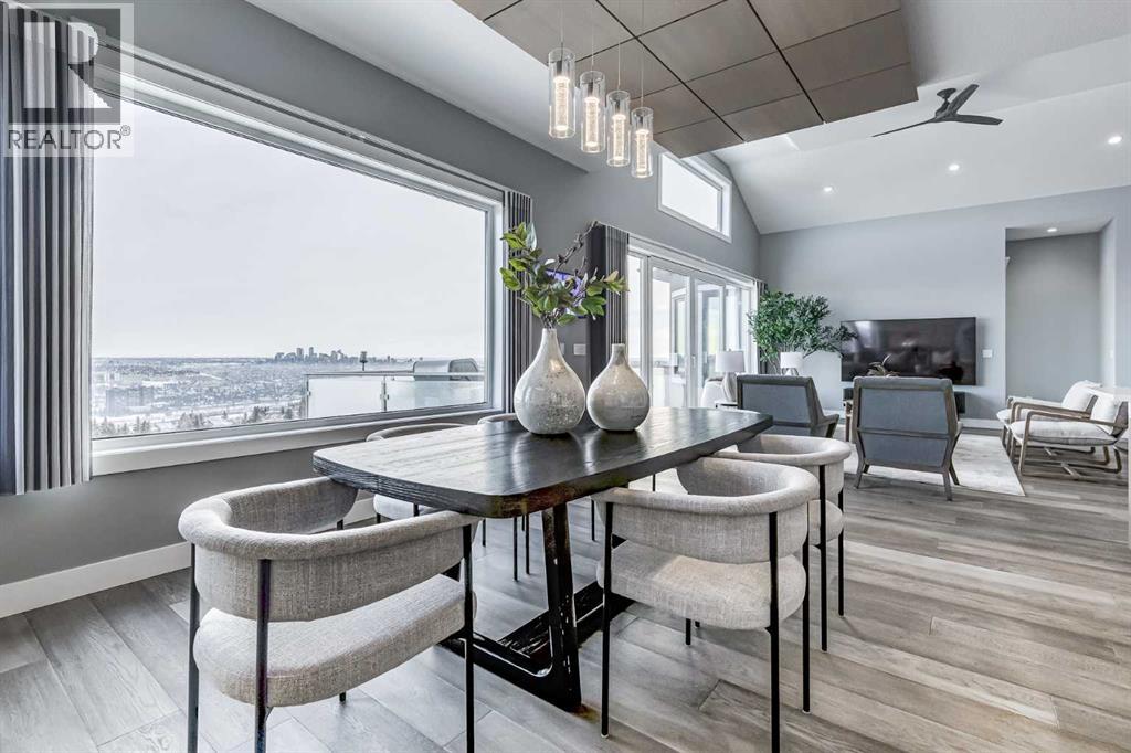 Perched high above the city in the prestigious community of Patterson, this custom luxury bungalow offers unobstructed, panoramic views of downtown Calgary and the skyline from all three fully developed walkout levels. Architecturally designed and built to a high standard, the home blends refined design, functionality, and long-term livability in a private, elevated setting just minutes from the city core.The main level is designed for sophisticated single-level living, with expansive windows that flood the home with natural light and frame breathtaking city views. The open-concept living and dining areas are anchored by a striking see-through gas fireplace, creating warmth and architectural interest while maintaining uninterrupted sightlines. Vaulted and tray ceilings enhance the sense of scale, complemented by wide-plank engineered hardwood flooring and timeless finishes. The chef-inspired kitchen features premium cabinetry, a large central island, high-end appliances, and seamless flow into the dining area, ideal for entertaining. A fully equipped spice kitchen provides additional prep space and storage. The primary suite is a private retreat with panoramic views and a spa-inspired ensuite featuring heated floors, a deep soaker tub, steam shower, and walk-in closet. A private office or den, powder room, breakfast nook, and functional mudroom with direct garage access complete this level.The first lower level is fully developed and walkout, offering excellent flexibility while maintaining the same level of finish. This level includes a spacious recreation room, family lounge with city views, a dedicated home gym with custom flooring and sliding glass barn doors, two generously sized bedrooms, beautifully finished bathrooms, a full laundry room, and direct outdoor access.The lowest level is designed for entertainment and guests, featuring a large media and theatre room with golf simulator capability, a kitchenette or wet bar, additional bedrooms, a full bathr oom, second laundry area, and integrated storage and mechanical spaces.Additional highlights include a heated triple attached garage with exceptional ceiling height allowing for a vehicle lift, epoxy flooring, side wall-mounted openers, and space for up to four vehicles. The home is roughed-in for a future elevator and offers multiple walkout patios and decks with glass railings and gas connections. Integrated audio, smart lighting, premium mechanical systems, and an optional landscaping package further enhance the property.Located in one of Calgary’s most desirable westside communities, Patterson is known for its elevated setting, mature surroundings, city views, and proximity to downtown, parks, and amenities. (id:55577)
