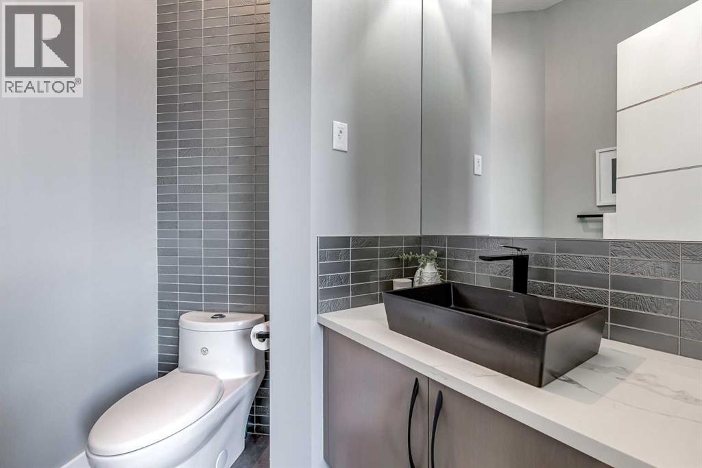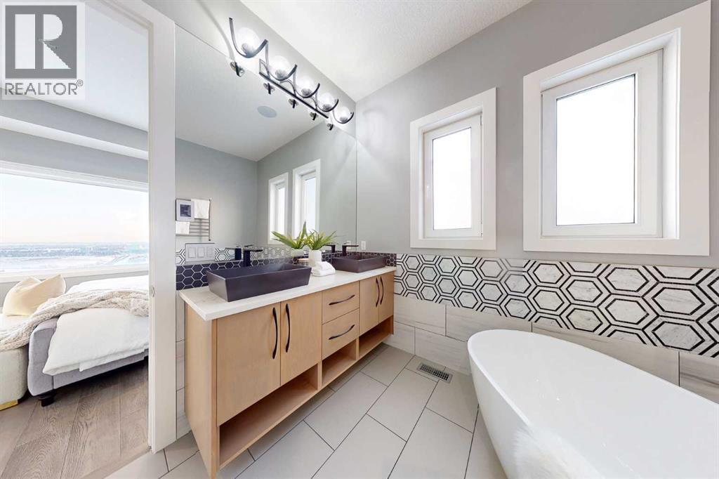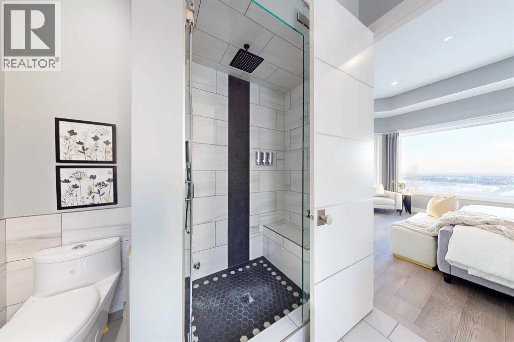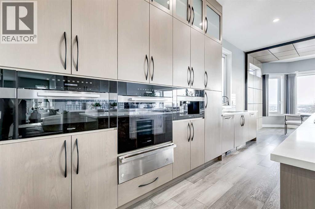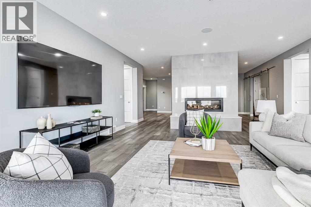 Perched high above the city in the prestigious community of Patterson, this custom luxury bungalow offers unobstructed, panoramic views of downtown Calgary and the skyline from all three fully developed walkout levels. Architecturally designed and built to a high standard, the home blends refined design, functionality, and long-term livability in a private, elevated setting just minutes from the city core.The main level is designed for sophisticated single-level living, with expansive windows that flood the home with natural light and frame breathtaking city views. The open-concept living and dining areas are anchored by a striking see-through gas fireplace, creating warmth and architectural interest while maintaining uninterrupted sightlines. Vaulted and tray ceilings enhance the sense of scale, complemented by wide-plank engineered hardwood flooring and timeless finishes. The chef-inspired kitchen features premium cabinetry, a large central island, high-end appliances, and seamless flow into the dining area, ideal for entertaining. A fully equipped spice kitchen provides additional prep space and storage. The primary suite is a private retreat with panoramic views and a spa-inspired ensuite featuring heated floors, a deep soaker tub, steam shower, and walk-in closet. A private office or den, powder room, breakfast nook, and functional mudroom with direct garage access complete this level.The first lower level is fully developed and walkout, offering excellent flexibility while maintaining the same level of finish. This level includes a spacious recreation room, family lounge with city views, a dedicated home gym with custom flooring and sliding glass barn doors, two generously sized bedrooms, beautifully finished bathrooms, a full laundry room, and direct outdoor access.The lowest level is designed for entertainment and guests, featuring a large media and theatre room with golf simulator capability, a kitchenette or wet bar, additional bedrooms, a full bathr oom, second laundry area, and integrated storage and mechanical spaces.Additional highlights include a heated triple attached garage with exceptional ceiling height allowing for a vehicle lift, epoxy flooring, side wall-mounted openers, and space for up to four vehicles. The home is roughed-in for a future elevator and offers multiple walkout patios and decks with glass railings and gas connections. Integrated audio, smart lighting, premium mechanical systems, and an optional landscaping package further enhance the property.Located in one of Calgary’s most desirable westside communities, Patterson is known for its elevated setting, mature surroundings, city views, and proximity to downtown, parks, and amenities. (id:55577)